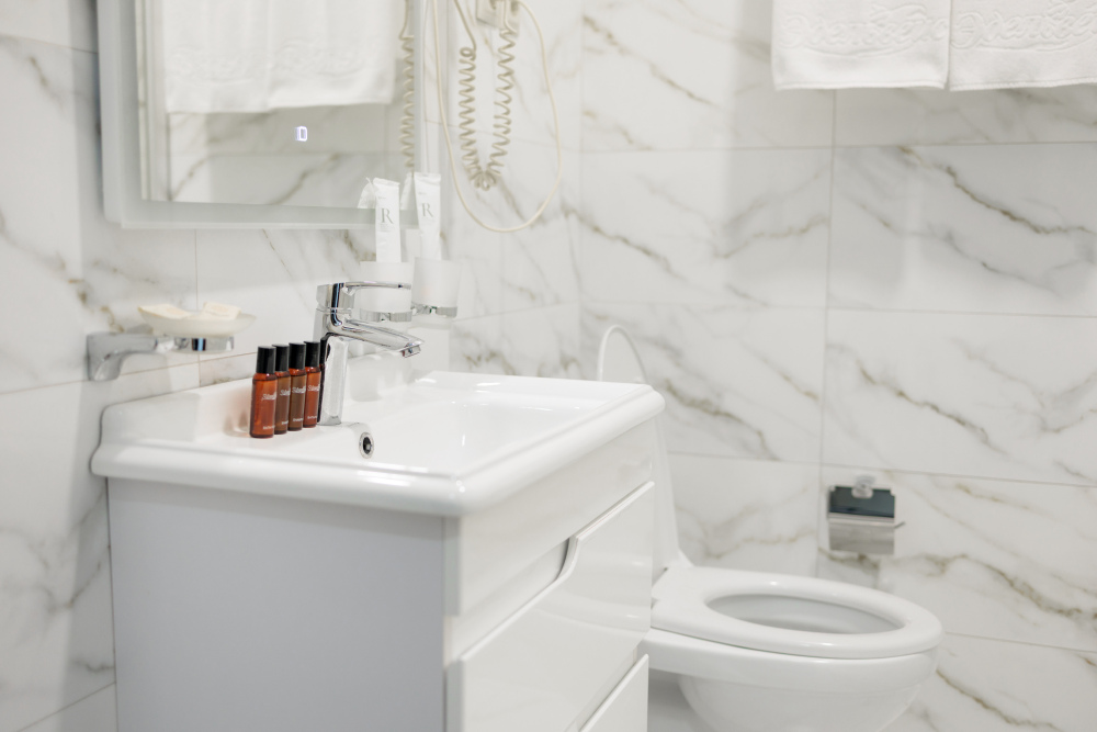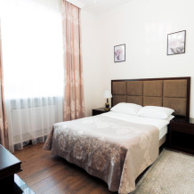 ЛЮКС – двухкомнатный – оформленные в современном стиле . В каждом номере по 2 кондиционера, 2 телевизора, диван и два кресла, журнальный и туалетный столики, холодильник и телефон,двуспальная кровать, тумбочки прикроватные. В ванной комнате – душевая, санузел с зеркалом и феном, полный комплект туалетных принадлежностей, по 3 комплекта полотенец (для лица и тела) и ножное, халаты, тапочки. В номерах чайники электрические с посудой чайной и столовой, чай/кофе и вода бутылированная.
