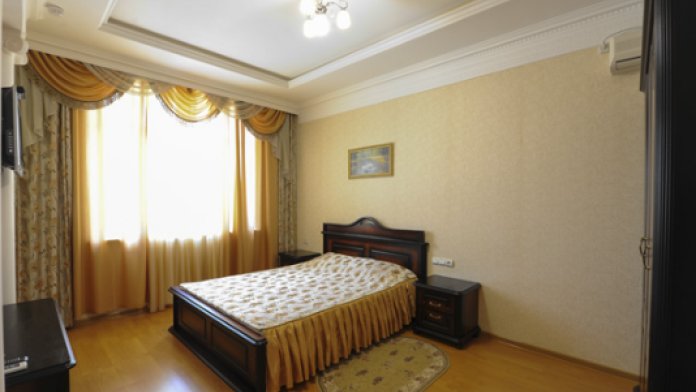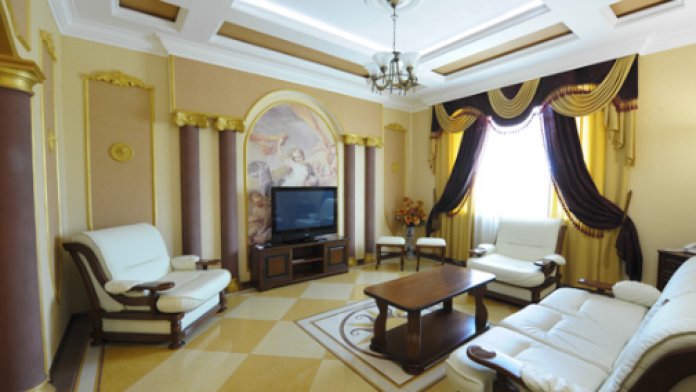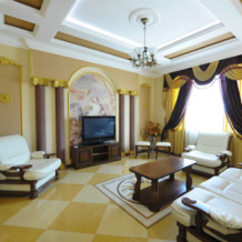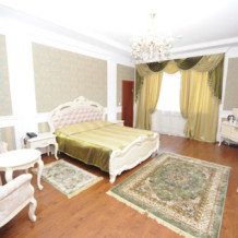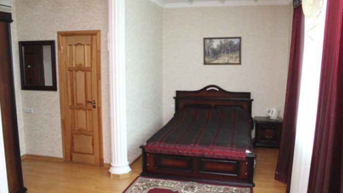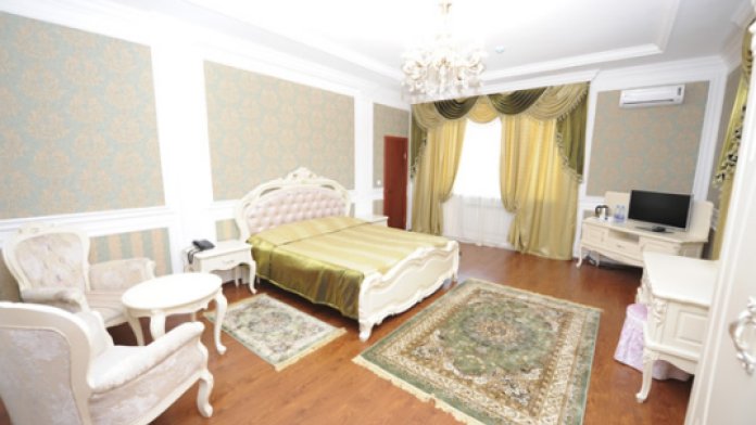 Номера двухкомнатные: спальня и гостиная. Индивидуальная система кондиционирования, цифровое телевидение, телефон, холодильник, сейф. В гостиной: диван и два кресла, столик журнальный и письменный, телевизор – 2 шт. и кондиционеров – 2 шт. Спальня: кровать 1800х2000, шкаф, тумбочки прикроватные. В прихожей комнате - шкаф купе. В ванной - джакузи, санузел с зеркалом, феном, полный комплект туалетных принадлежностей, четыре комплекта полотенец (для рук и тела) и ножное, по 2 шт. халат и тапочек. В номерах чайники электрические с посудой столовой и чайной, чай и сахар, вода питьевая.