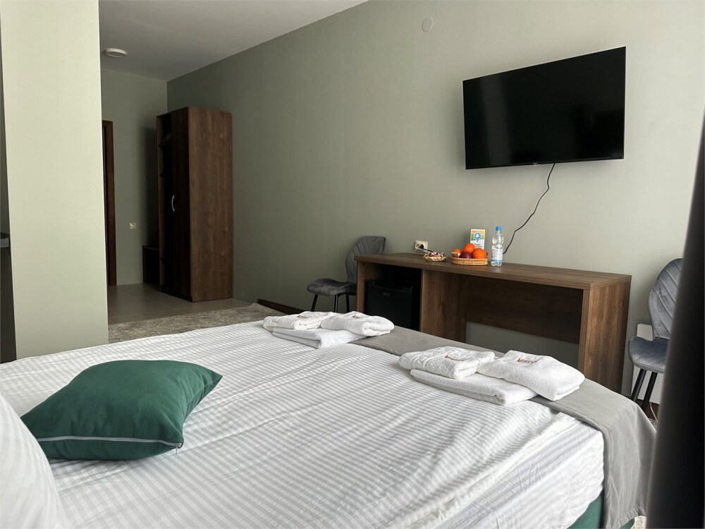 Одна двуспальная кровать, шкаф, холодильник, электрочайник, чайный набор, фен, гигиенические принадлежности, набор полотенец, телевизор. Wi-fi бесплатный.