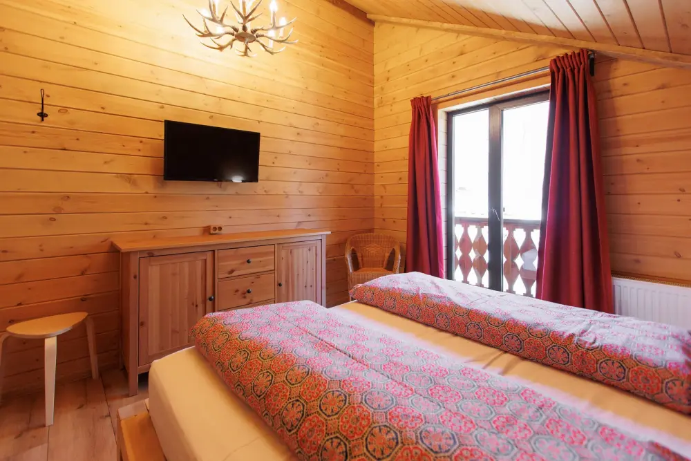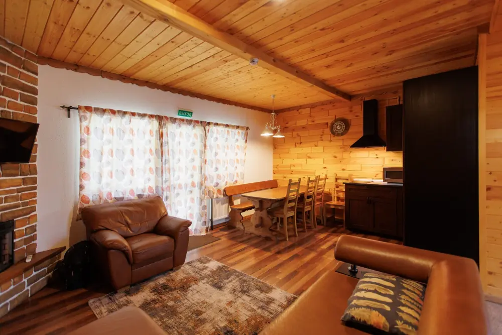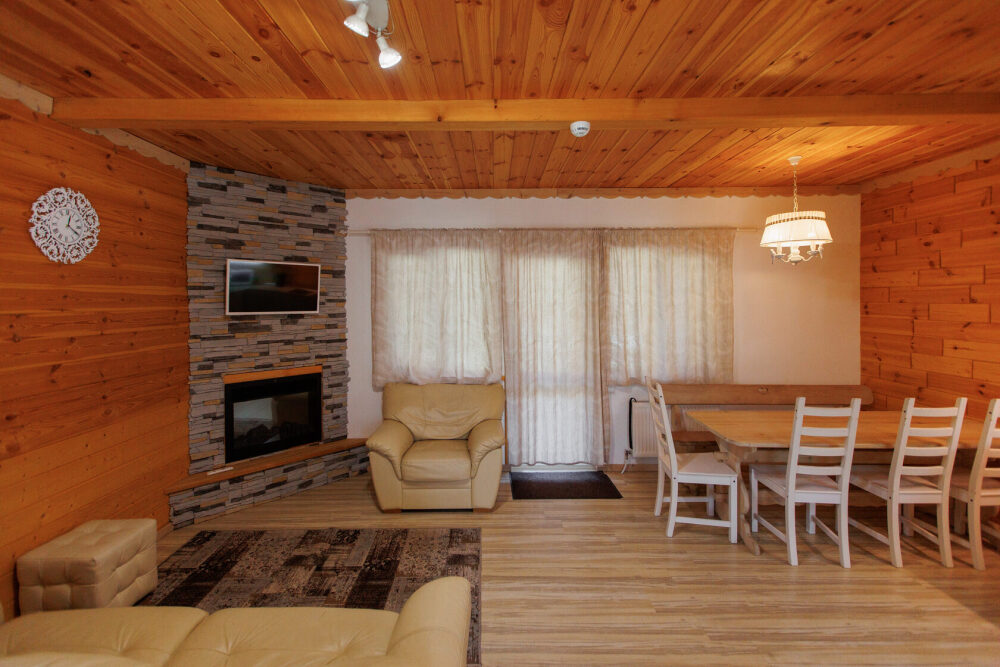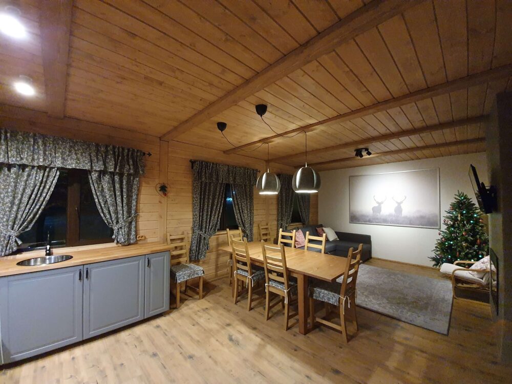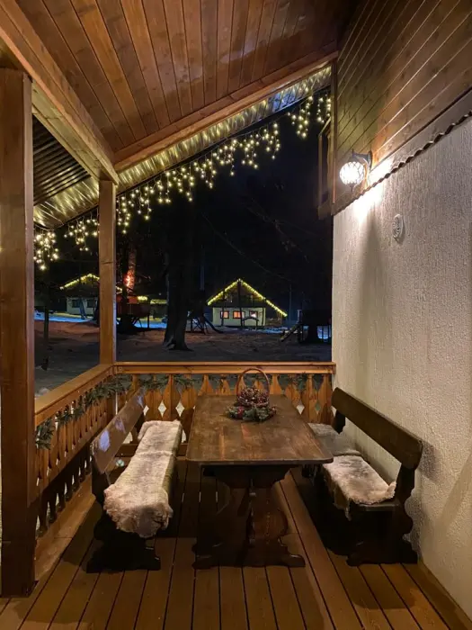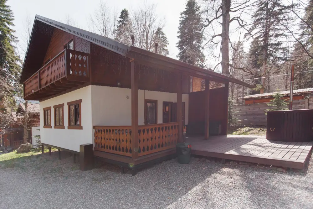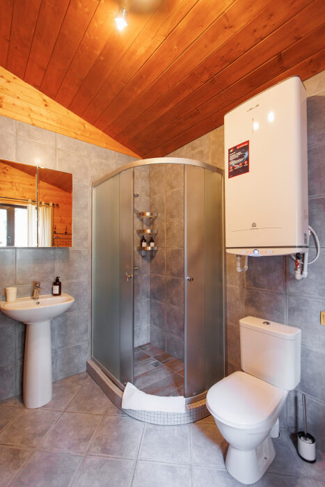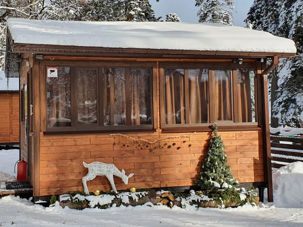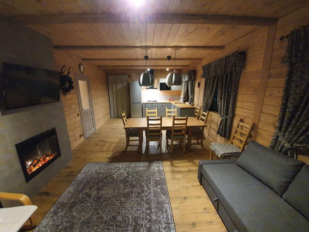 Удобства в шале: отопление (батареи, теплые полы), баня и чан (оплачивается дополнительно), постельное белье, полотенца, плита для приготовления пищи, посуда, столовые приборы, кухонные принадлежности, моющие принадлежности, электрокамин, терраса, обеденная зона на улице.