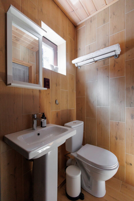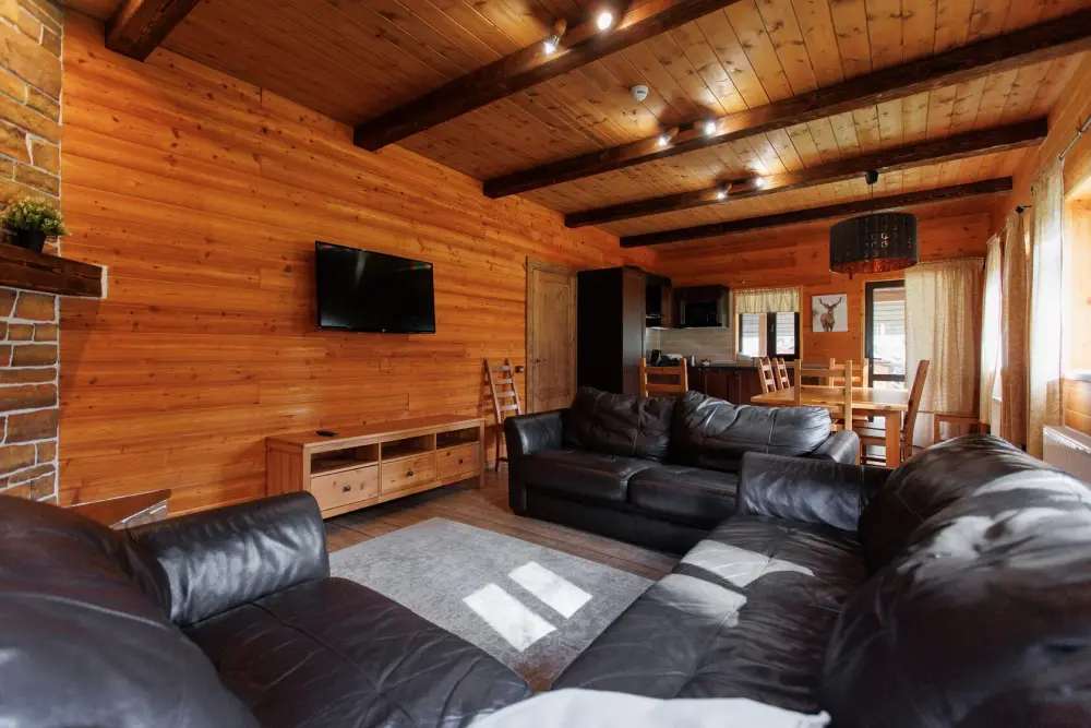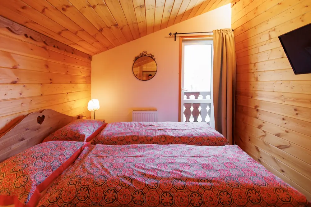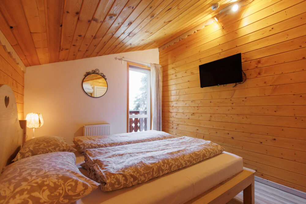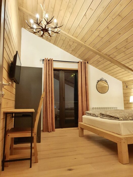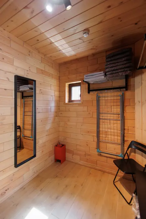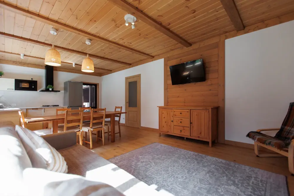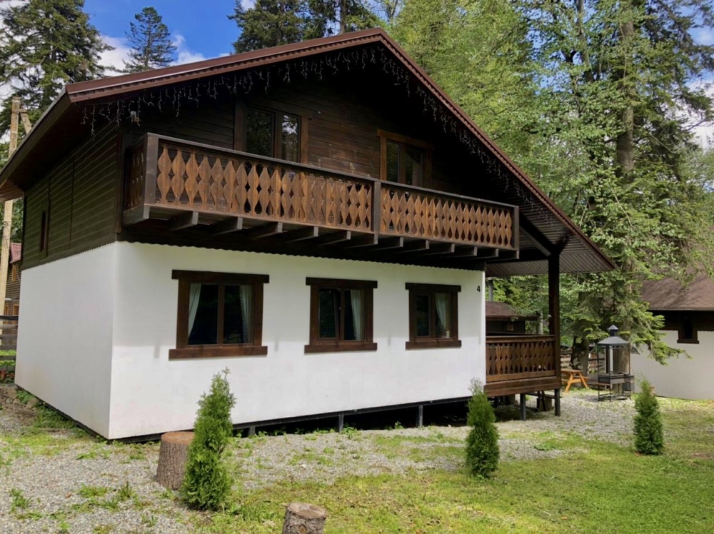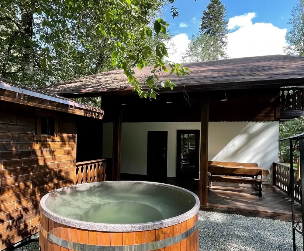 Удобства в шале: отопление (батареи, теплые полы), баня и чан (оплачивается дополнительно), постельное белье, полотенца, плита для приготовления пищи, посуда, столовые приборы, кухонные принадлежности, моющие принадлежности, электрокамин, терраса, обеденная зона на улице.