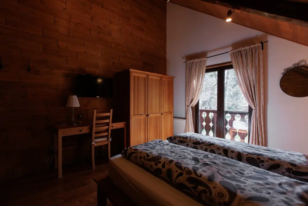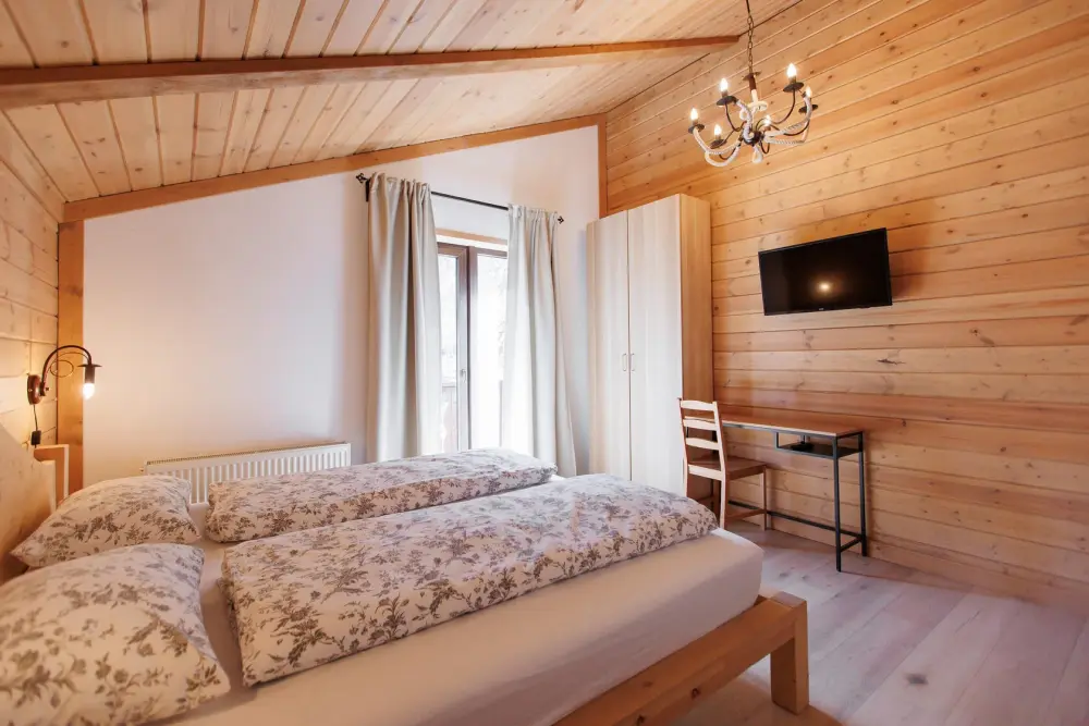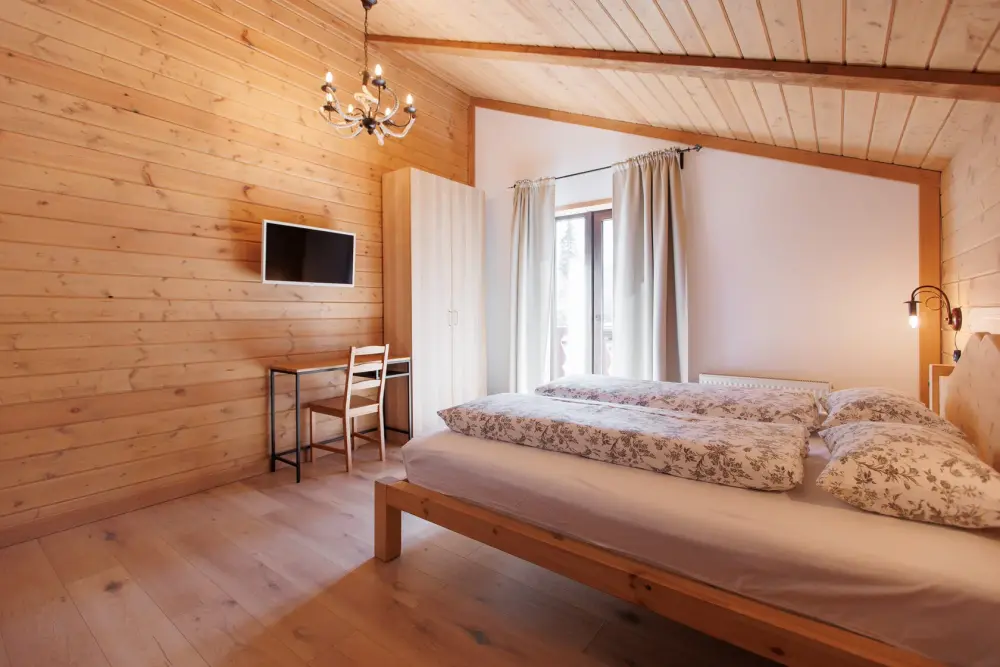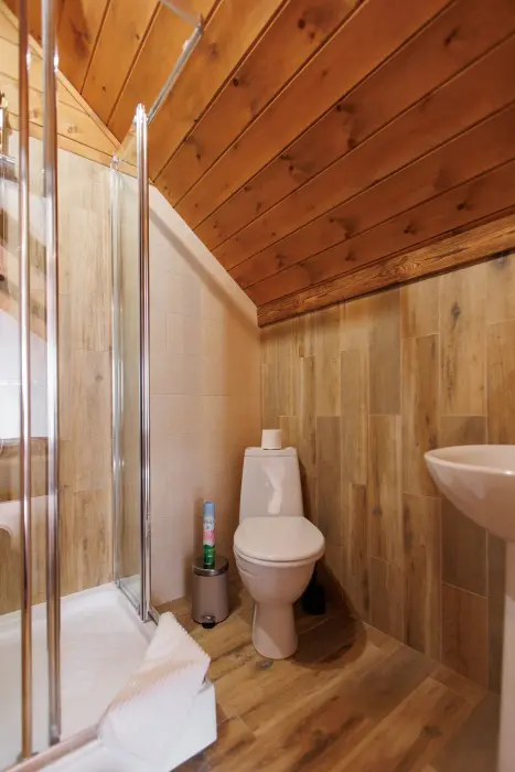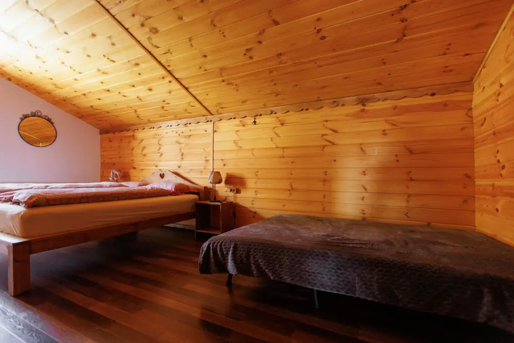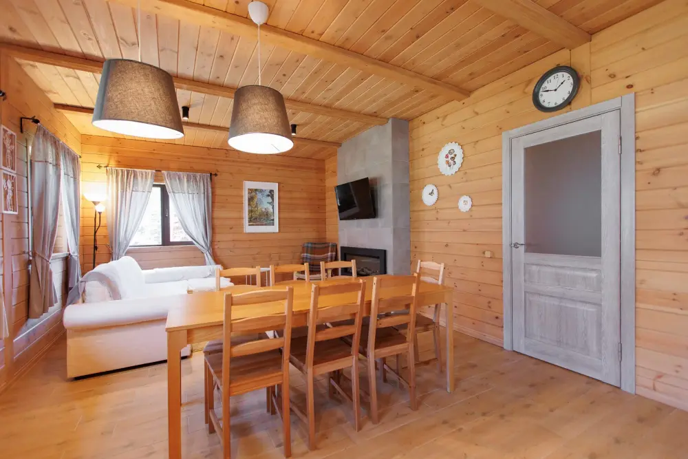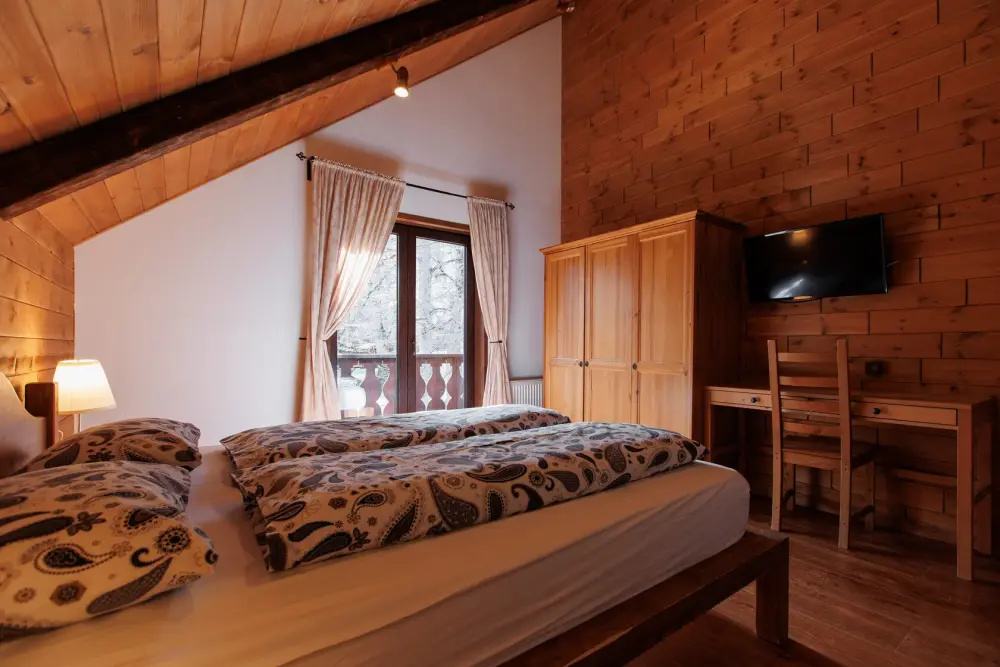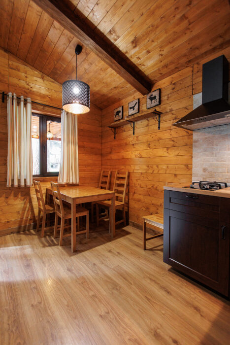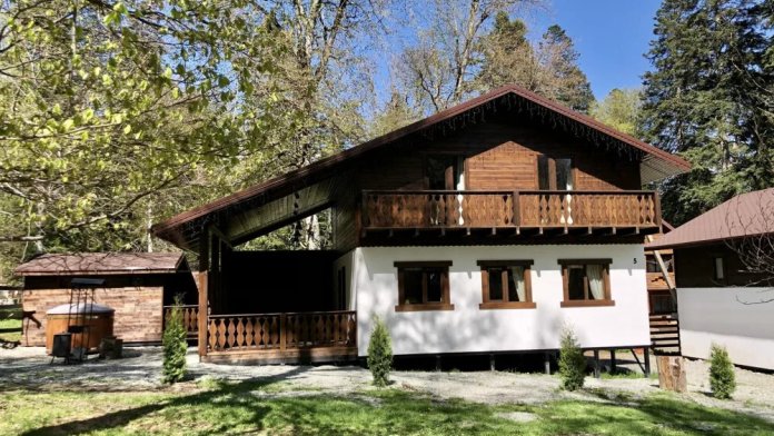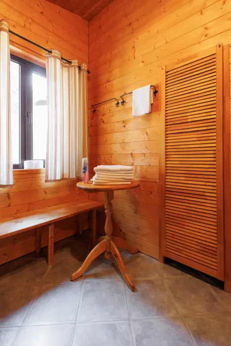Удобства в шале: отопление (батареи, теплые полы), баня и чан (оплачивается дополнительно), постельное белье, полотенца, плита для приготовления пищи, посуда, столовые приборы, кухонные принадлежности, моющие принадлежности, электрокамин, терраса, обеденная зона на улице.