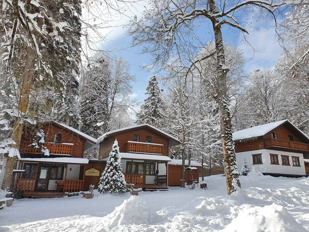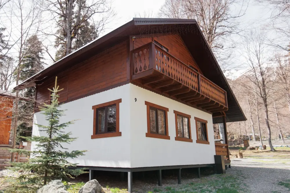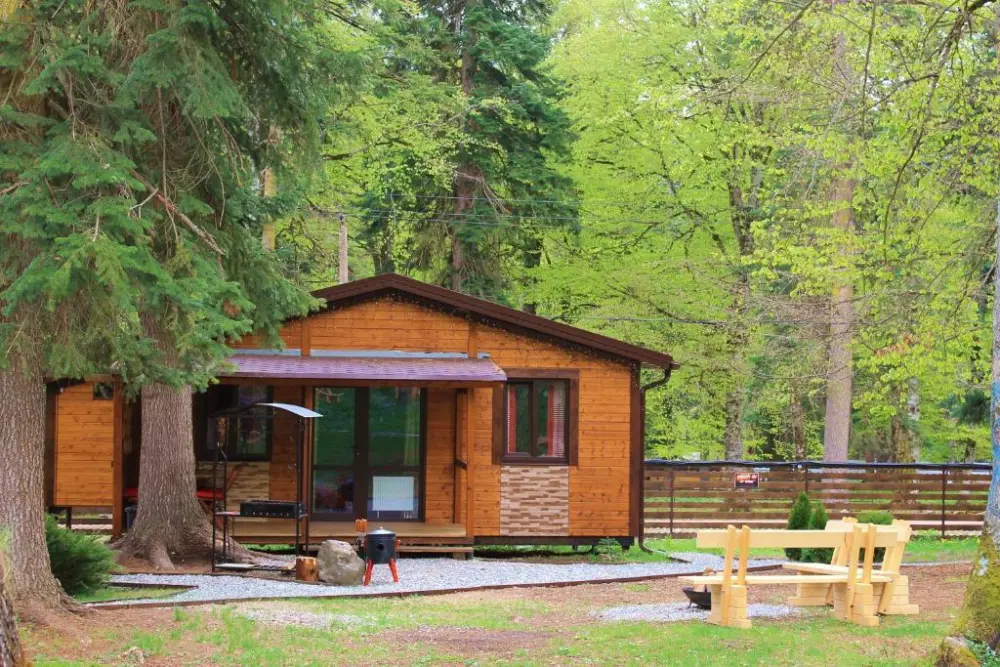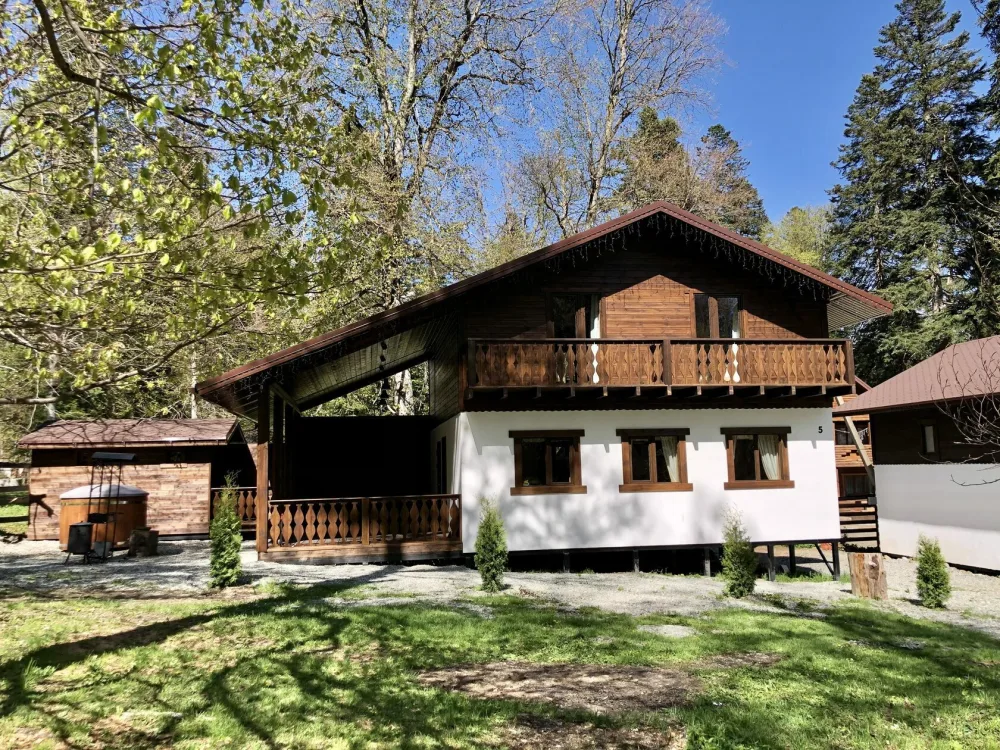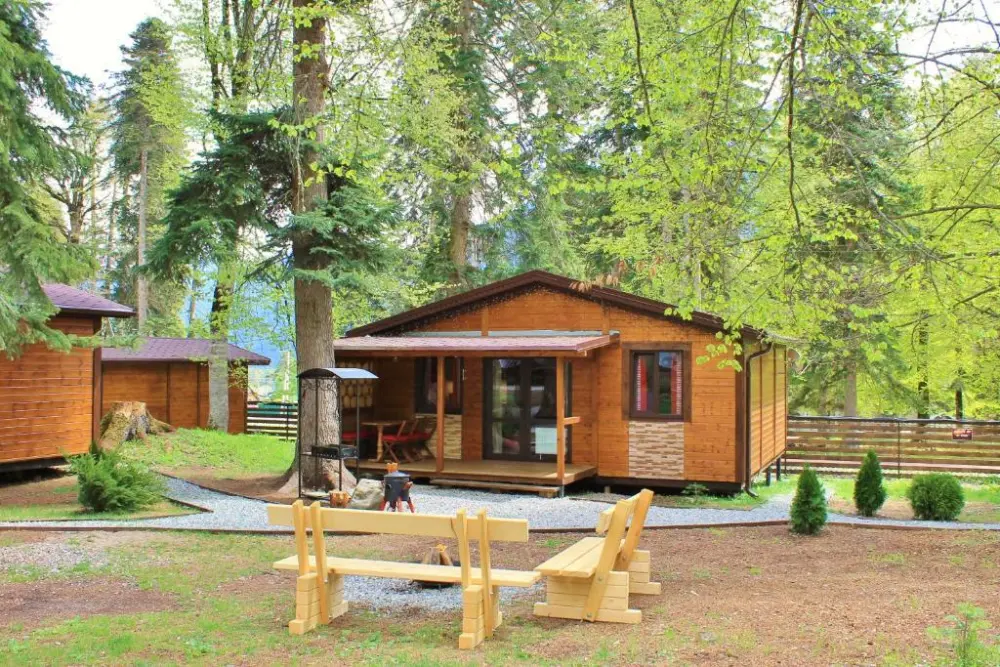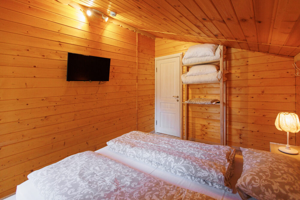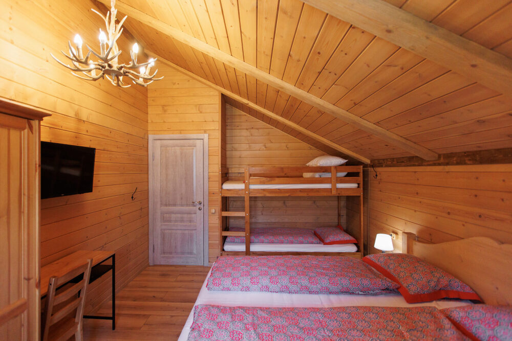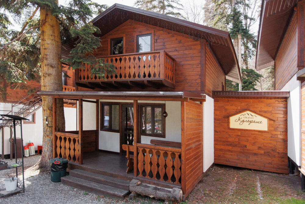 Для размещения гостям предлагается шале вместимостью от 7 до 11 гостей. Все они оснащены: гостиной с диваном, электрокамином и телевизором; оборудованной кухней; санузлами; террасой с мангальной зоной. Детям от 0 до 5 лет предоставляется детская кроватка + постельное белье, детский обеденный стульчик по запросу и при наличии возможности, бесплатно.