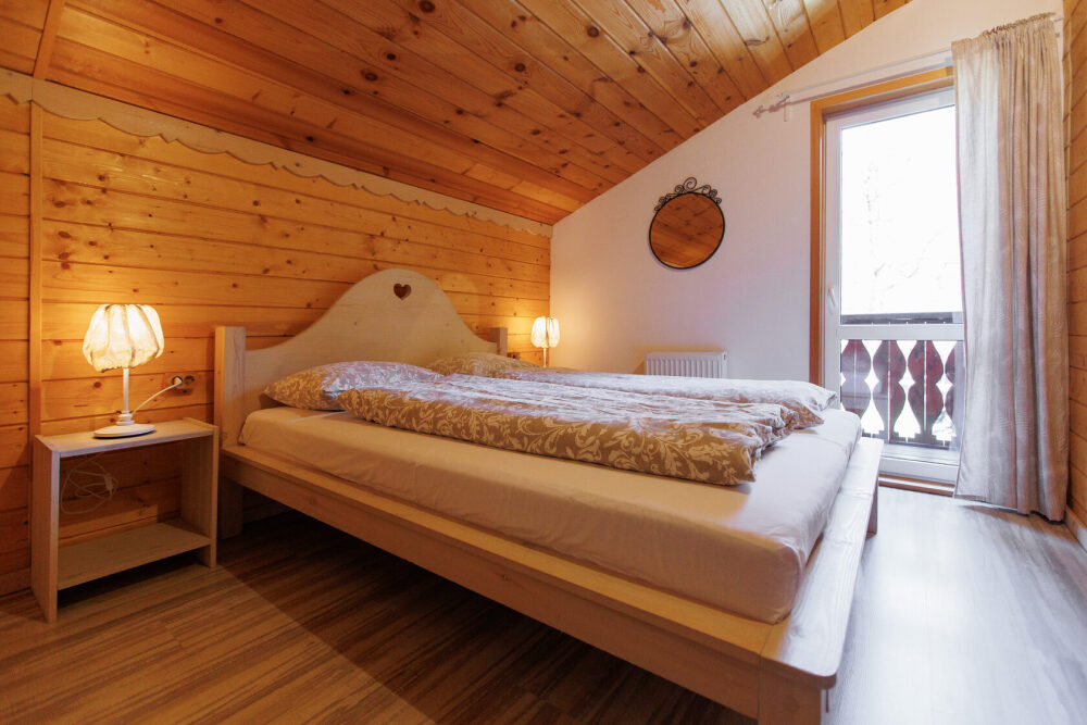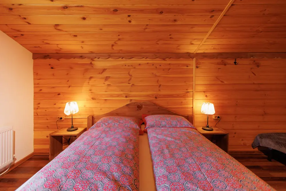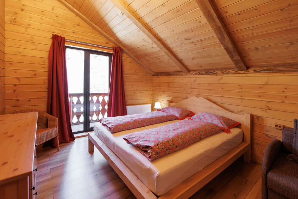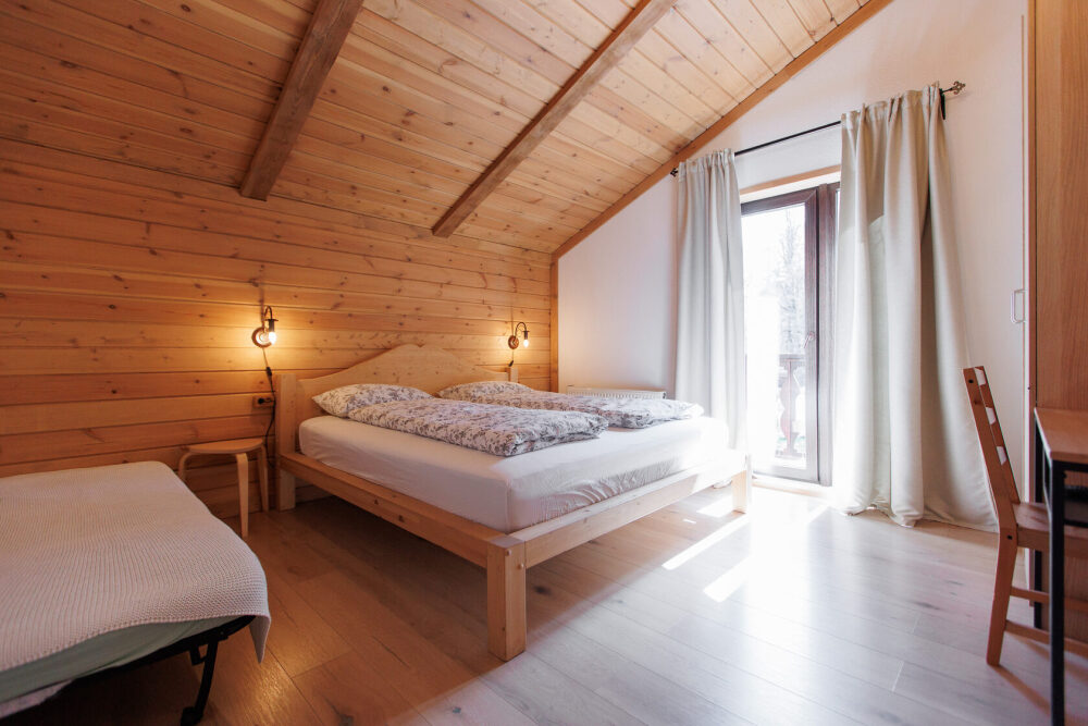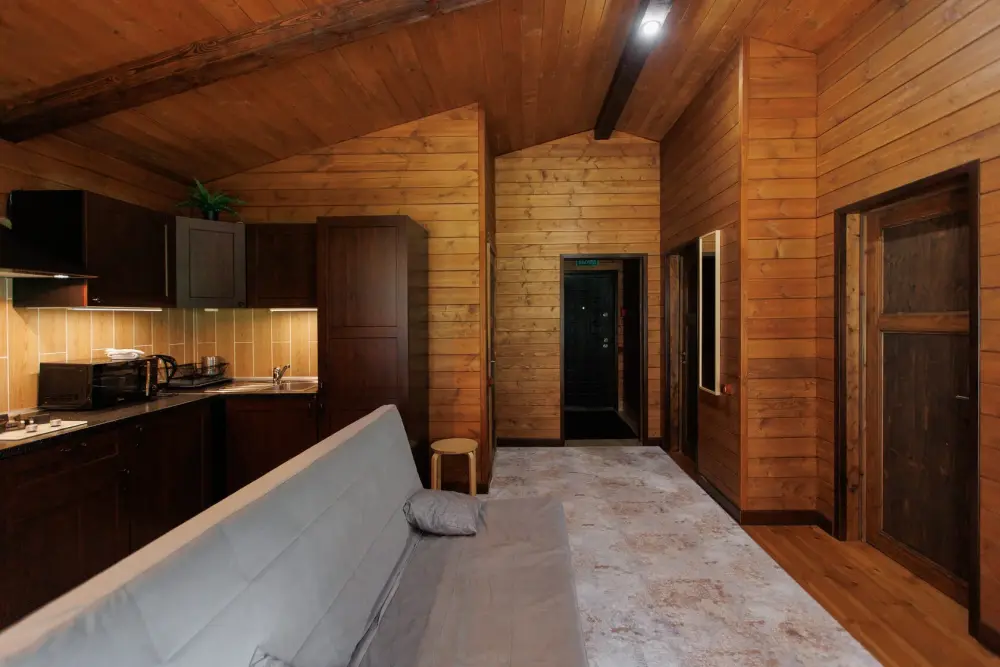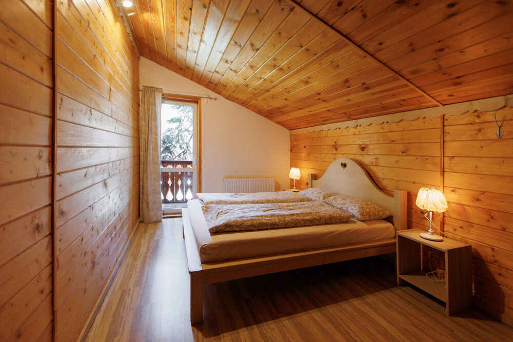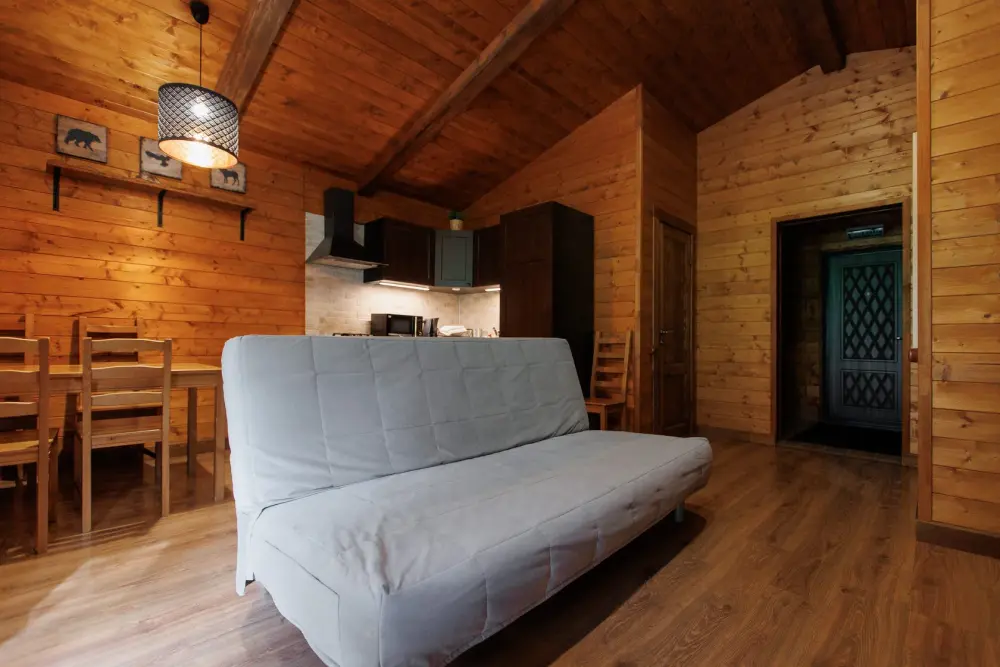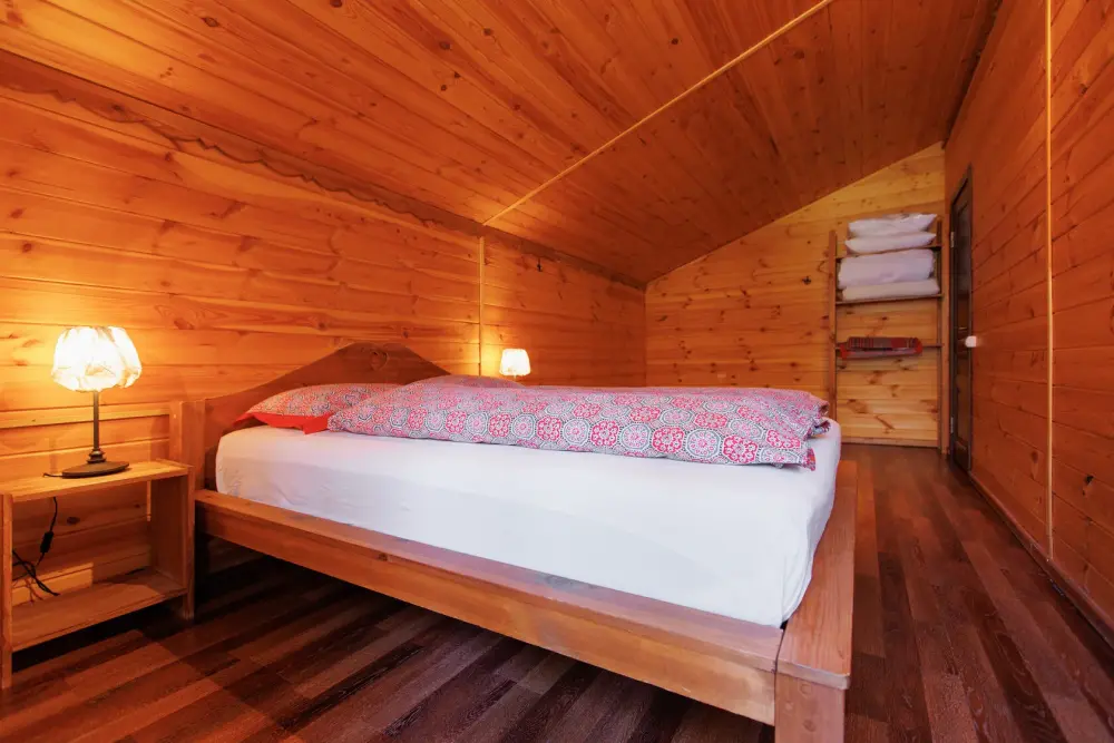 Для размещения гостям предлагается шале вместимостью от 7 до 11 гостей. Все они оснащены: гостиной с диваном, электрокамином и телевизором; оборудованной кухней; санузлами; террасой с мангальной зоной. Детям от 0 до 5 лет предоставляется детская кроватка + постельное белье, детский обеденный стульчик по запросу и при наличии возможности, бесплатно.