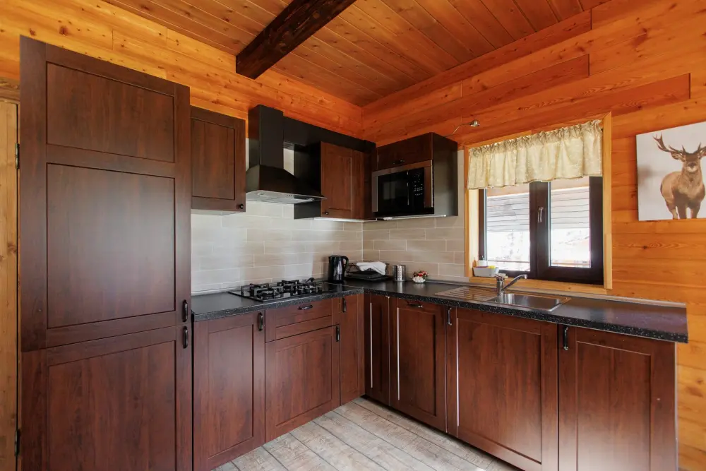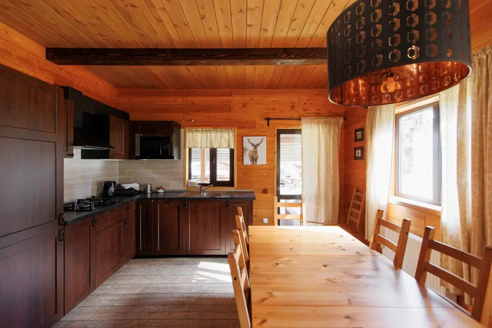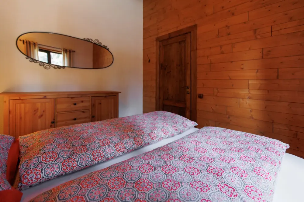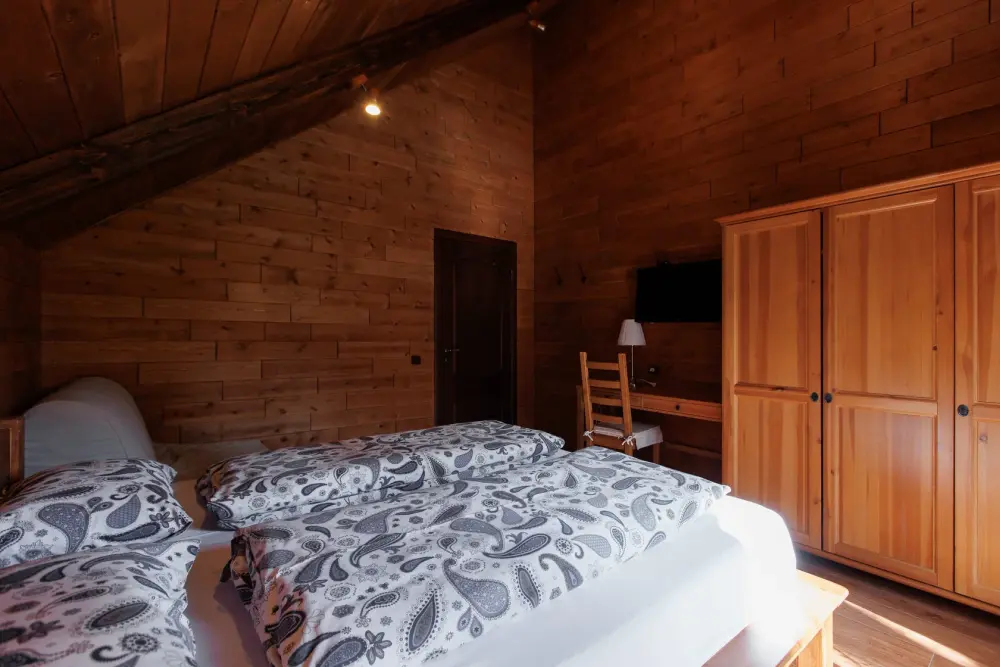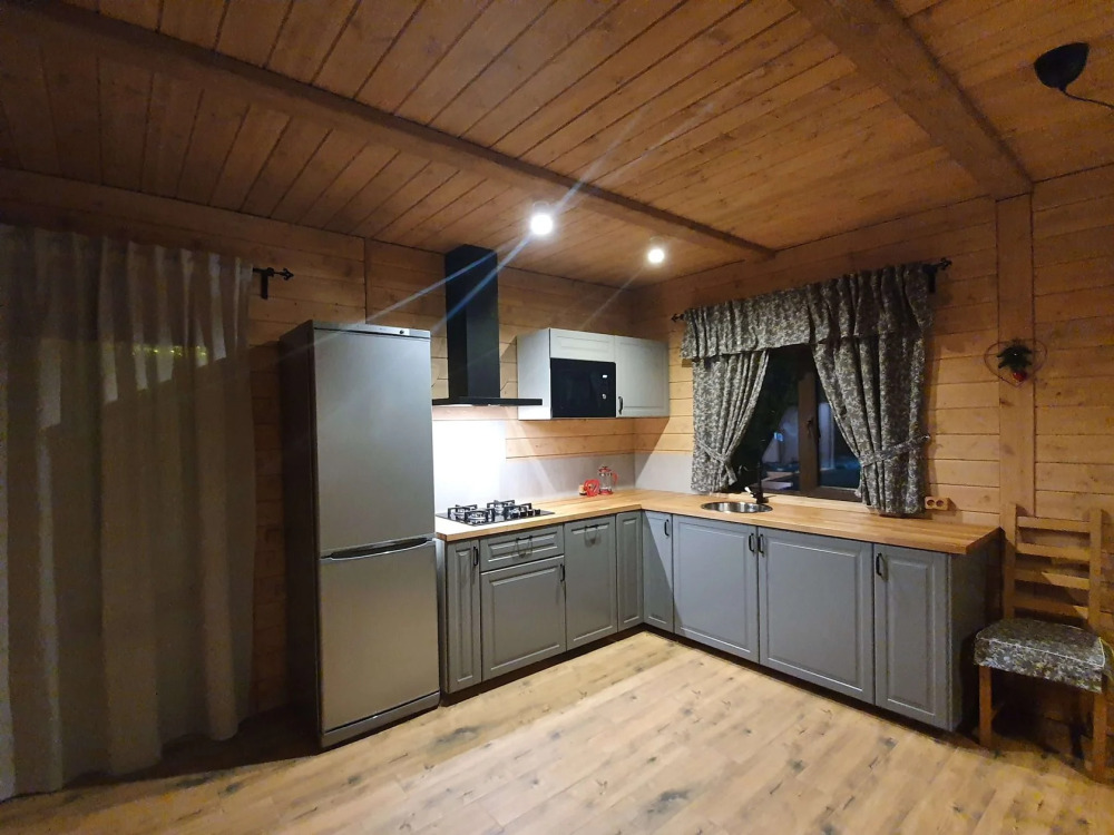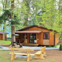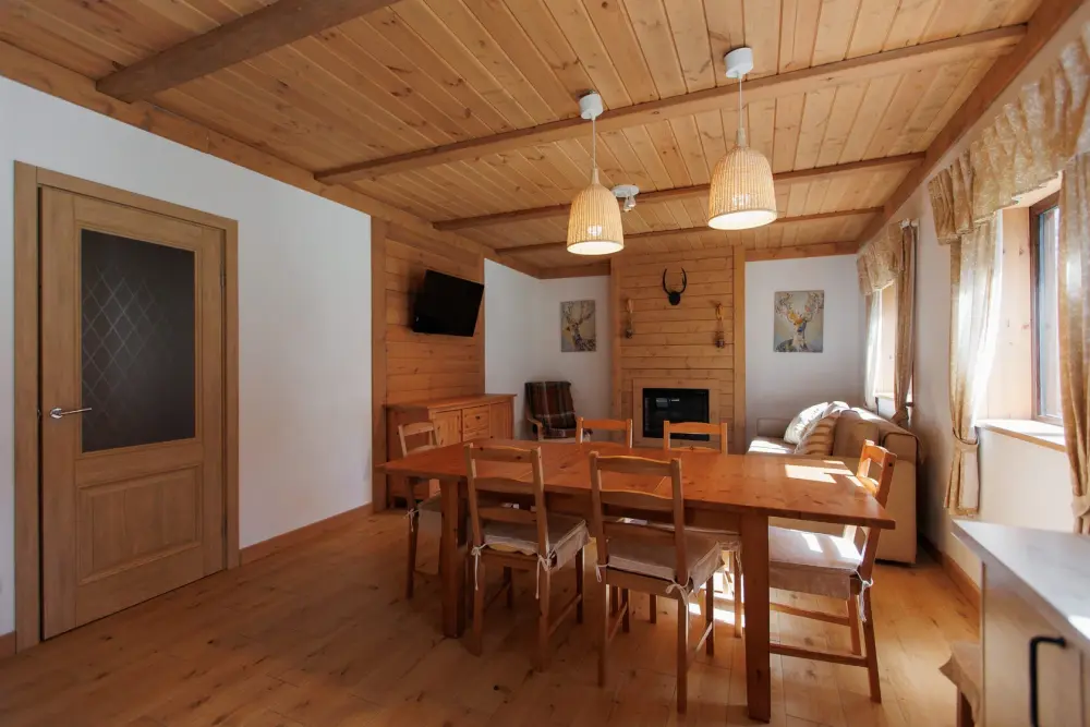 Удобства в шале: отопление (батареи, теплые полы), баня и чан (оплачивается дополнительно), постельное белье, полотенца, плита для приготовления пищи, посуда, столовые приборы, кухонные принадлежности, посудомоечная машина, моющие принадлежности, электрокамин, терраса, обеденная зона на улице.