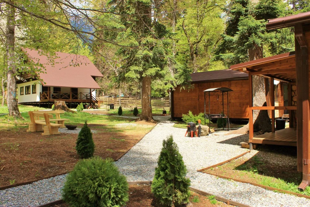 Дома окружают вековые деревья. На нашей территории много свободного пространства, что дает детям большие возможности. Благодаря холмистому ландшафту нашего участка, заснеженой зимой взрослые и дети могут весело проводить время, катаясь на тюбингах. Пешие тропинки в горы и к реке за пределами территории.