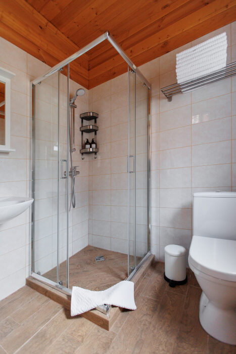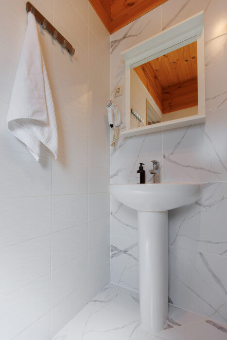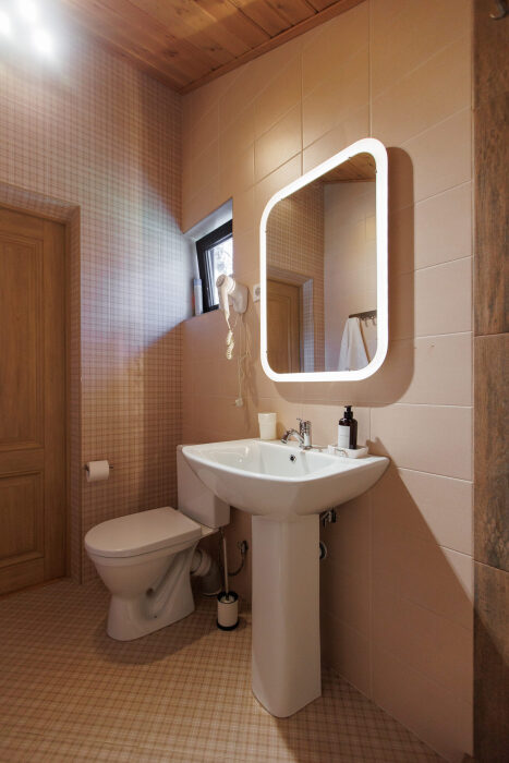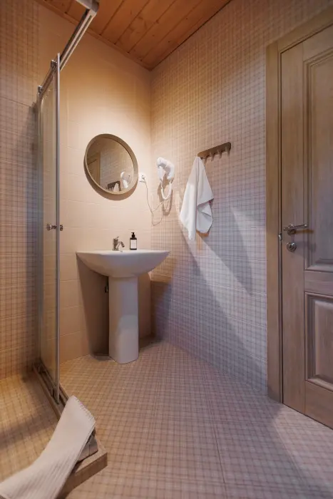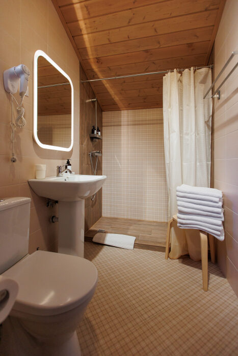 В ванной комнате: полотенца, мыло, шампунь, гель для душа, тапочки, туалетная бумага.
