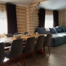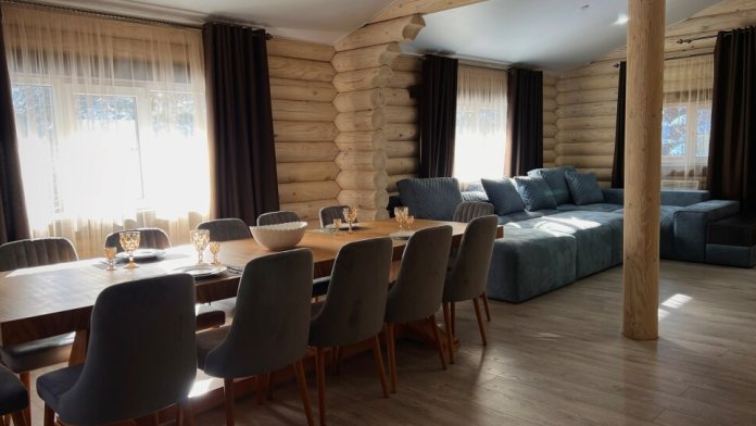 Номер из сруба в стиле шале, с отдельным входом и с шикарными видами на горы и лес. Две спальни и большая гостиная.