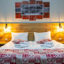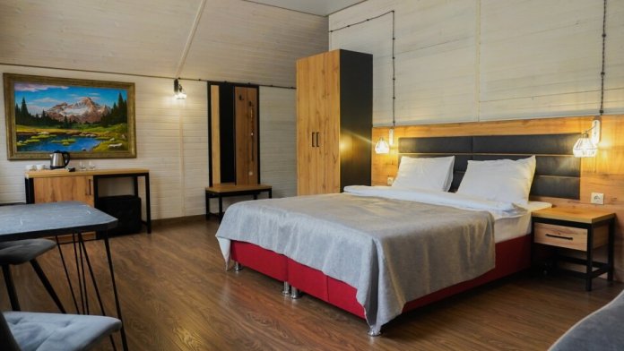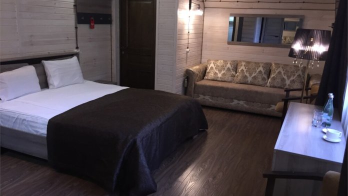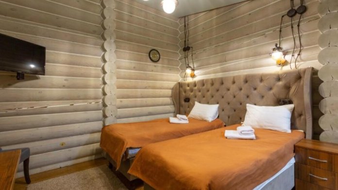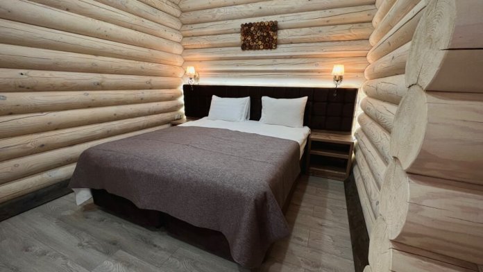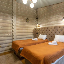 Номер в отдельно стоящем срубовом доме с двумя раздельными кроватями и раздвижным креслом, идеально вписанный в окружающий ландшафт, оформленный в стиле современного горного шале из натуральных материалов, с природными элементами декора.
