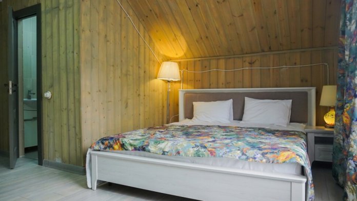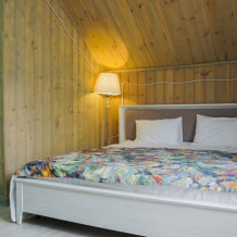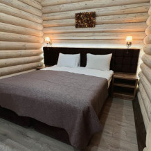 Номер в лесу в отдельно стоящем срубовом доме площадью 22 кв.м. с широкой двуспальной кроватью King-size, идеально вписанный в окружающий ландшафт, оформленный в стиле современного горного шале из натуральных материалов, с природными элементами декора.