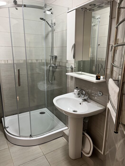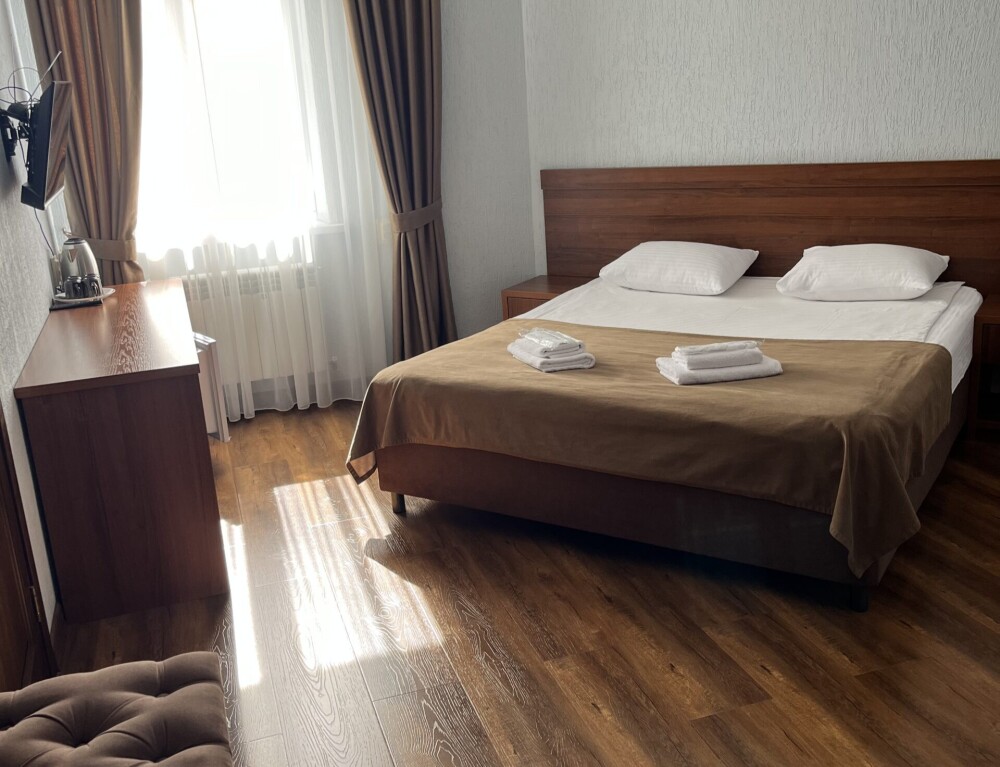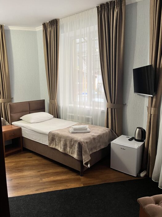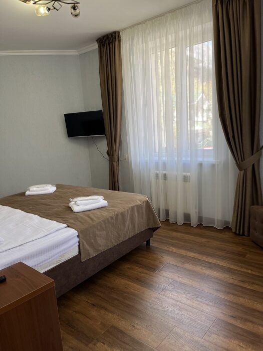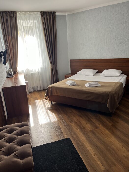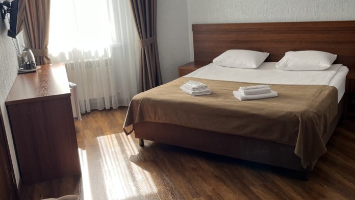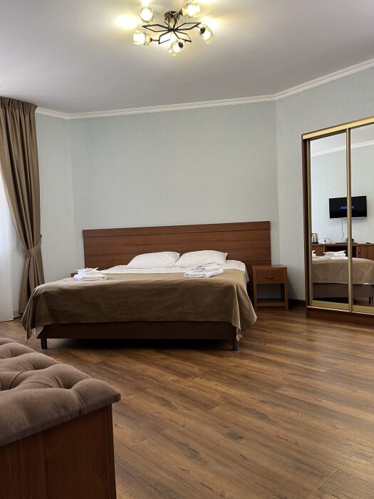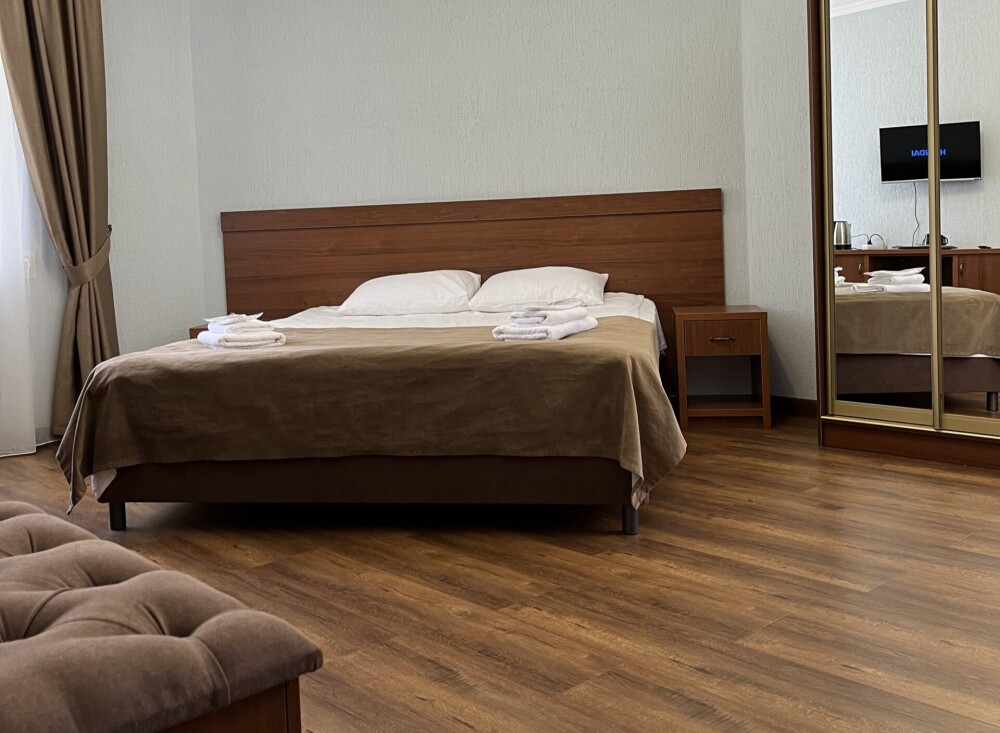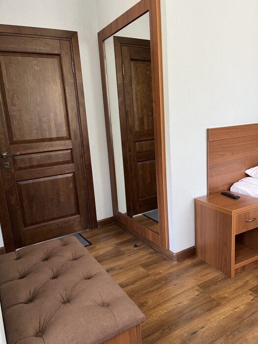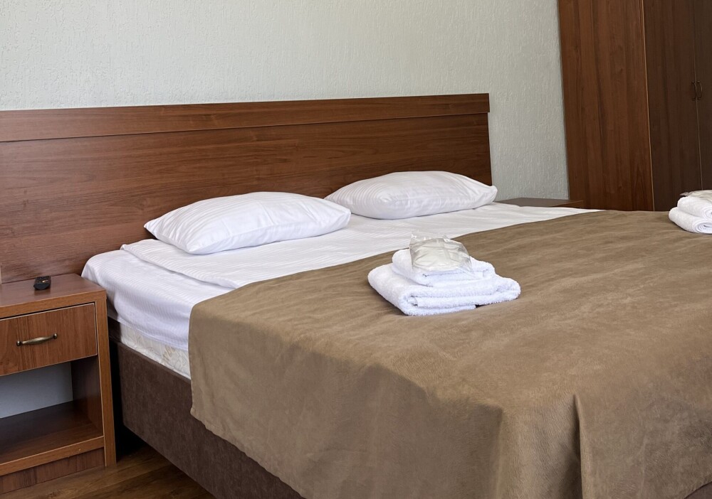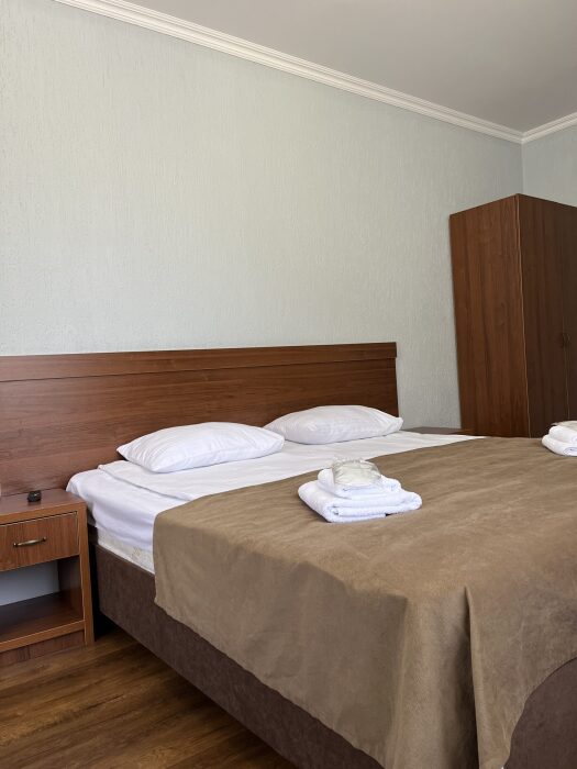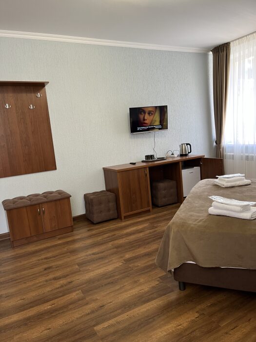В номере смарт тв, электрочайник, мини холодильник, частично посуда, центральное отопление, ванная комната (душевая кабинка), полотенца, разовое мыло, разовые тапочки, постельное бельё.