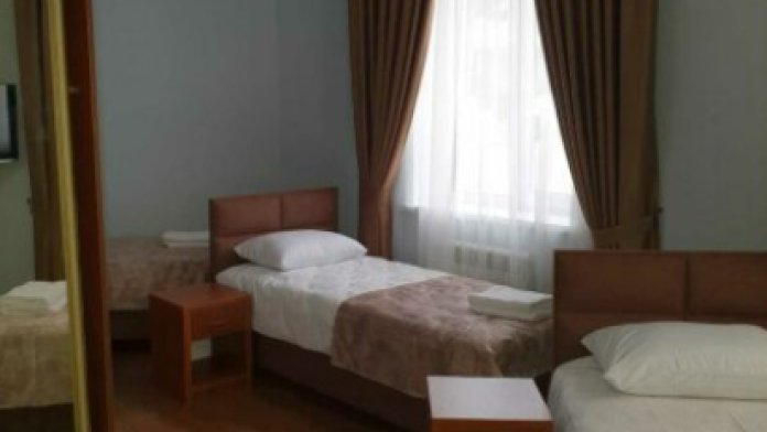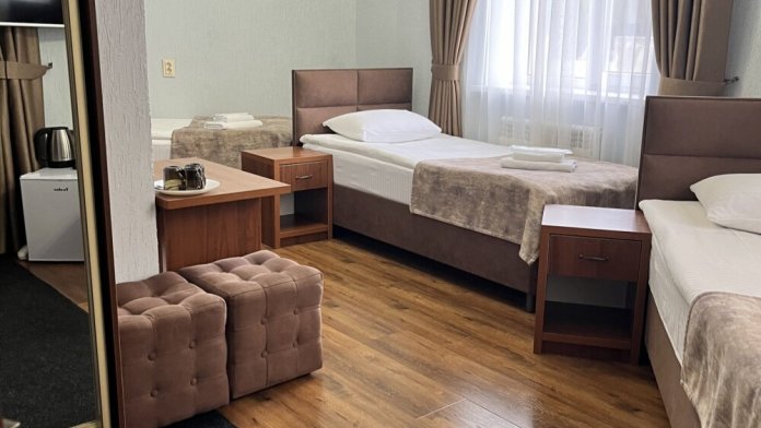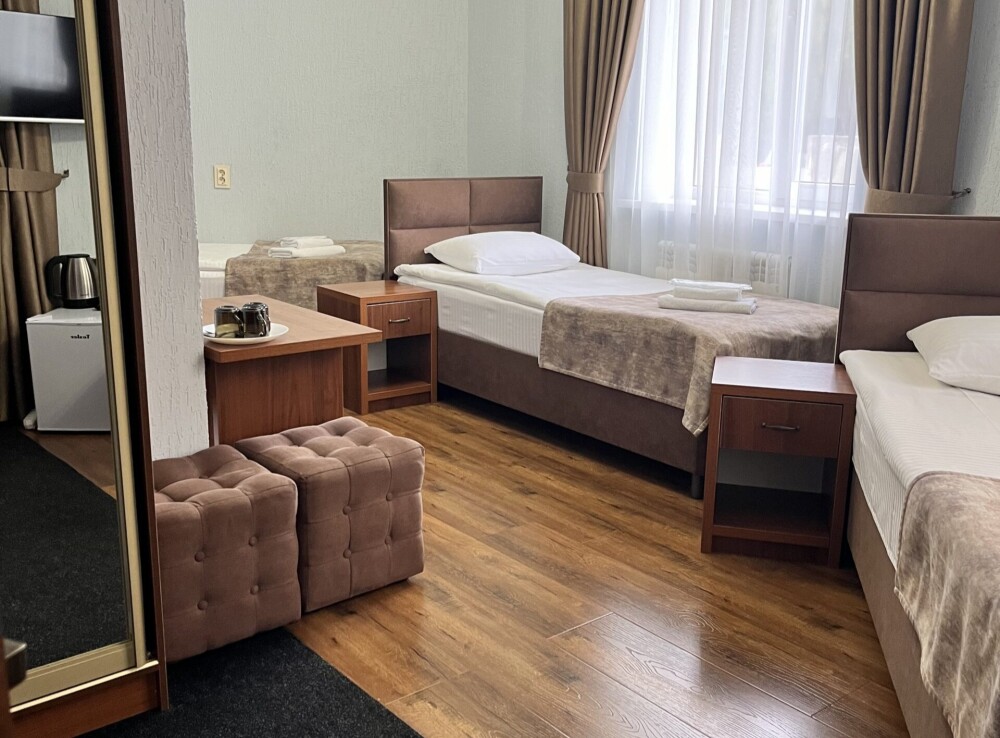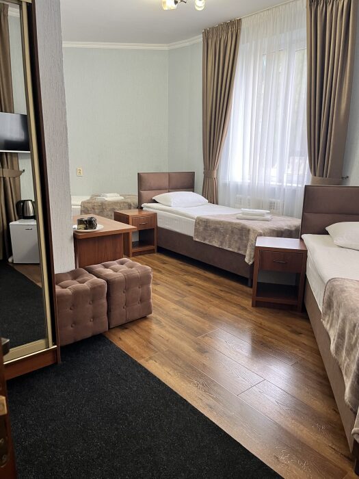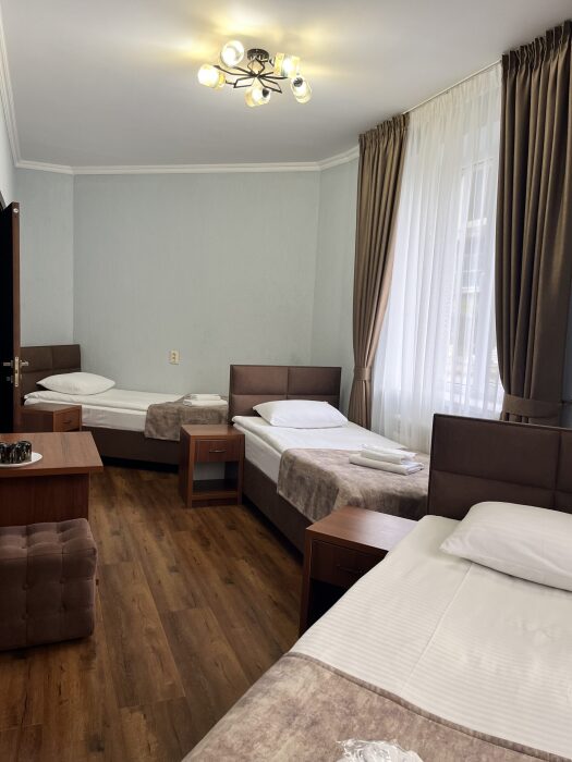 Номер с одной 2-спальной кроватью, одно спальная кровать и одна раскладная кровать.