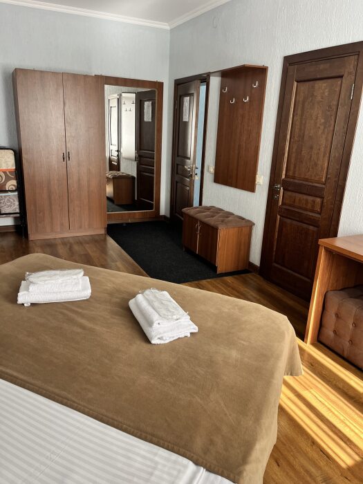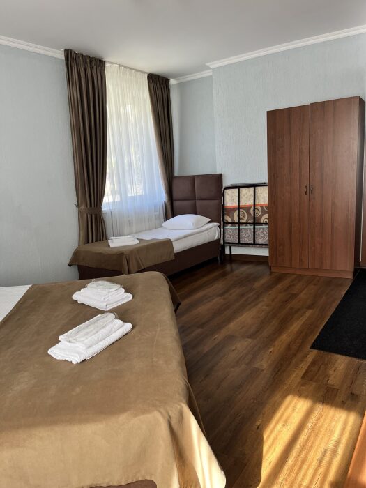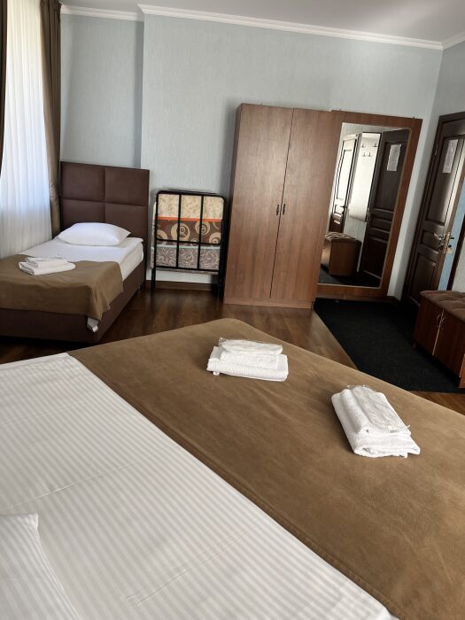 Номер с одной 2- спальной кроватью, одно спальная кровать и одна раскладная кровать.