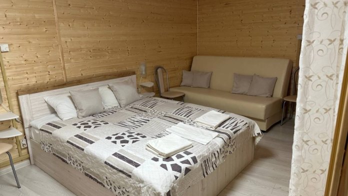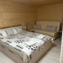 Жилая комната 25м2. В жилой комнате двуспальная кровать, прикроватные тумбочки, бра, раздвижной диван со спальным местом 110х200 см, обеденный стол, 3 стула, чайник, микроволновая печь, телевизор с плоским экраном 81 диагональ, мини-кухня с мойкой, посуда из расчета на 4 человека. Санузел, душевая кабина размером 120х80 см, раковина, зеркало, фен, унитаз, бойлер на 80 л, имеется в каждом домике. Горячая, холодная вода круглосуточно. Постельные принадлежности, полотенца, тапочки, туалетная бумага предоставляются.