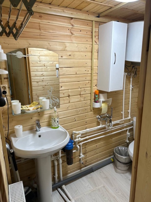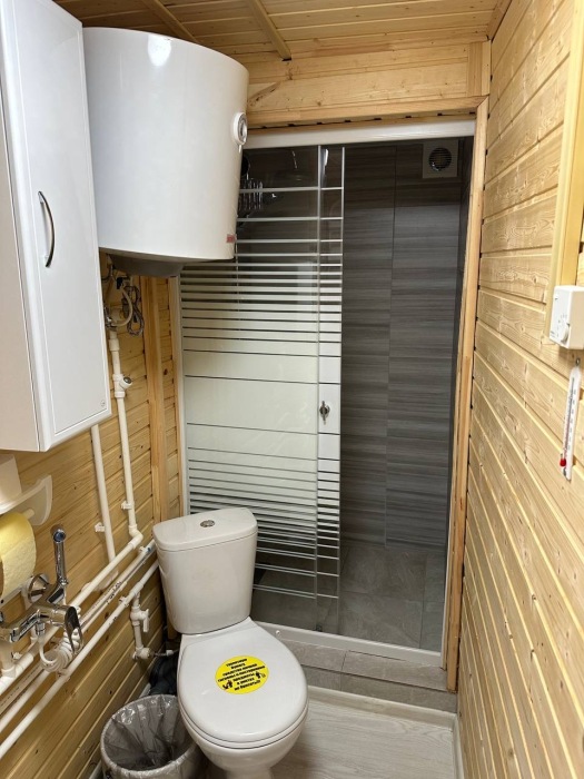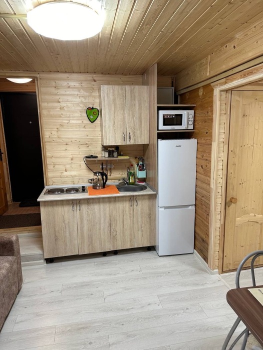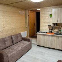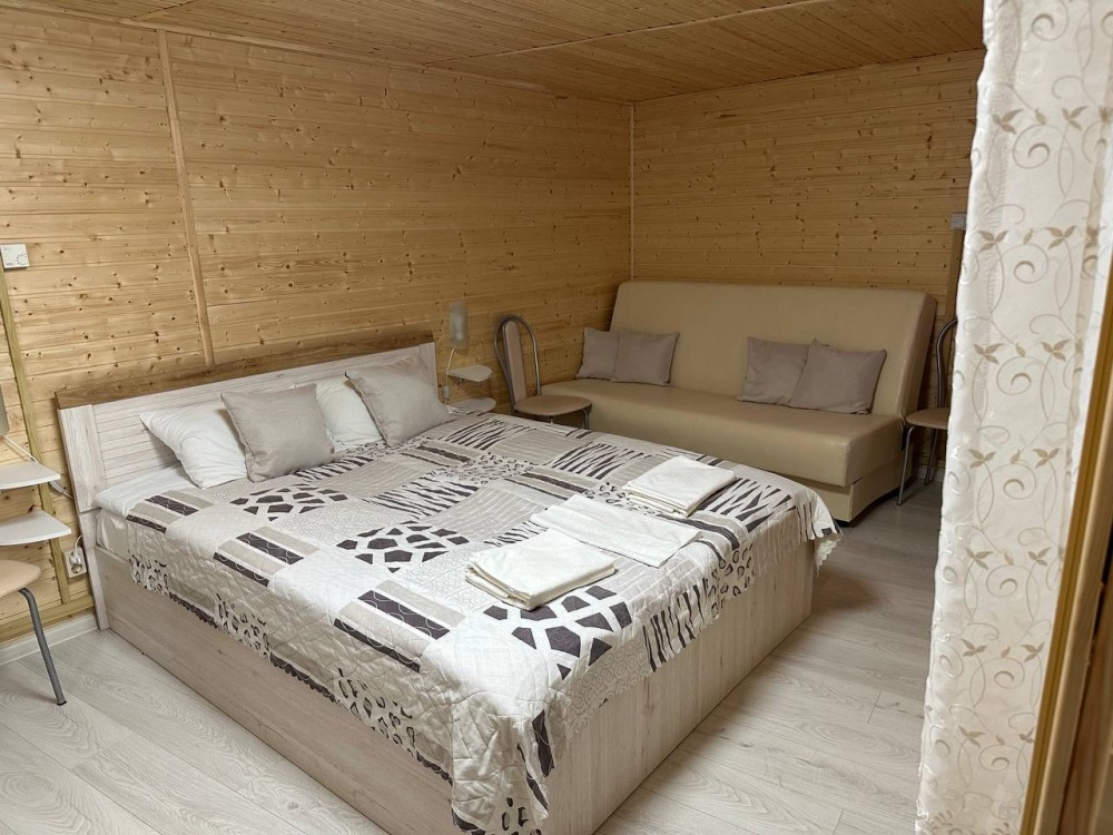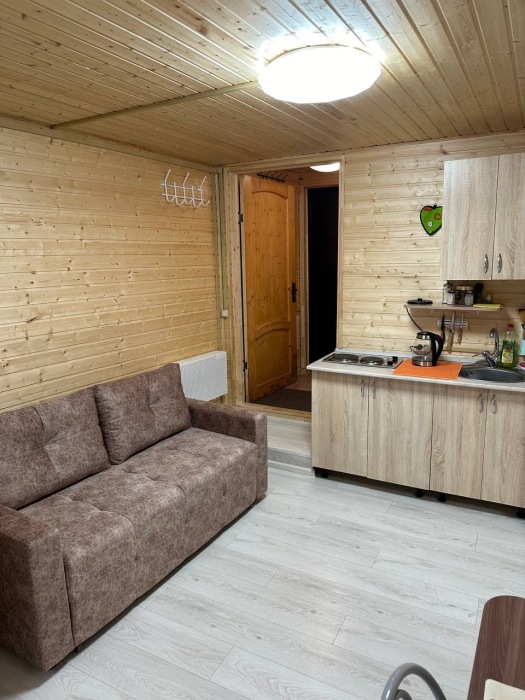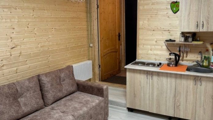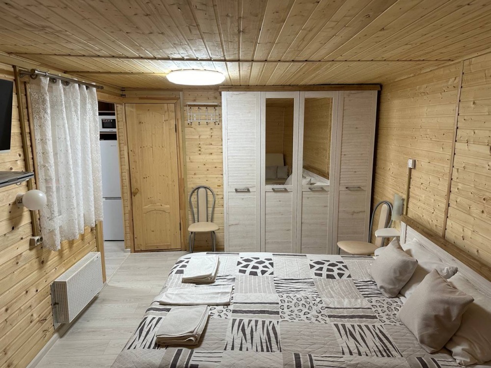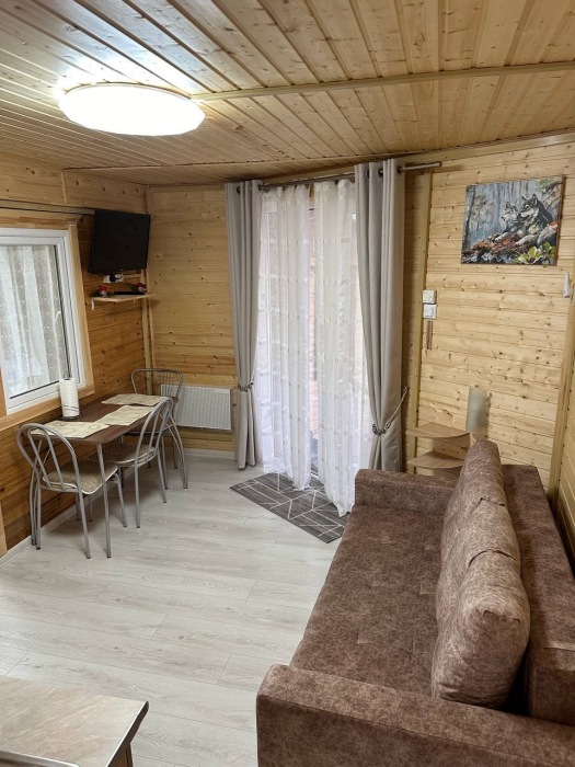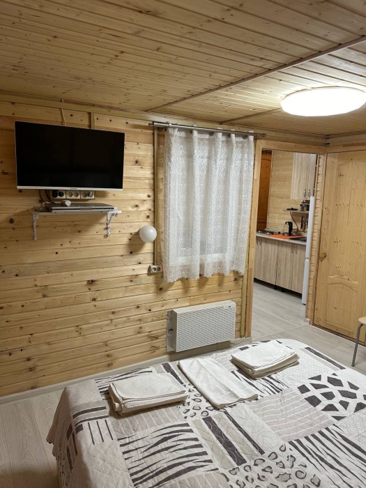 Жилая комната 25 кв.м. В жилой комнате двуспальная кровать, прикроватные тумбочки, бра, раздвижной диван со спальным местом 110 см х 200 см, обеденный стол, три стула, чайник, микроволновая печь, телевизор с плоским экраном 81 диагональ, мини кухня с мойкой, посуда из расчета на четыре человека. Санузел, душевая кабина размером 120х 80, раковина, зеркало, фен, унитаз, бойлер на 80 литров, имеется в каждом домике. Горячая, холодная вода круглосуточно. Постельные принадлежности, полотенца, тапочки, туалетная бумага предоставляются.