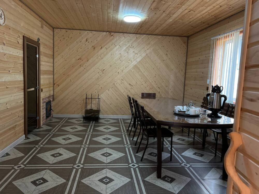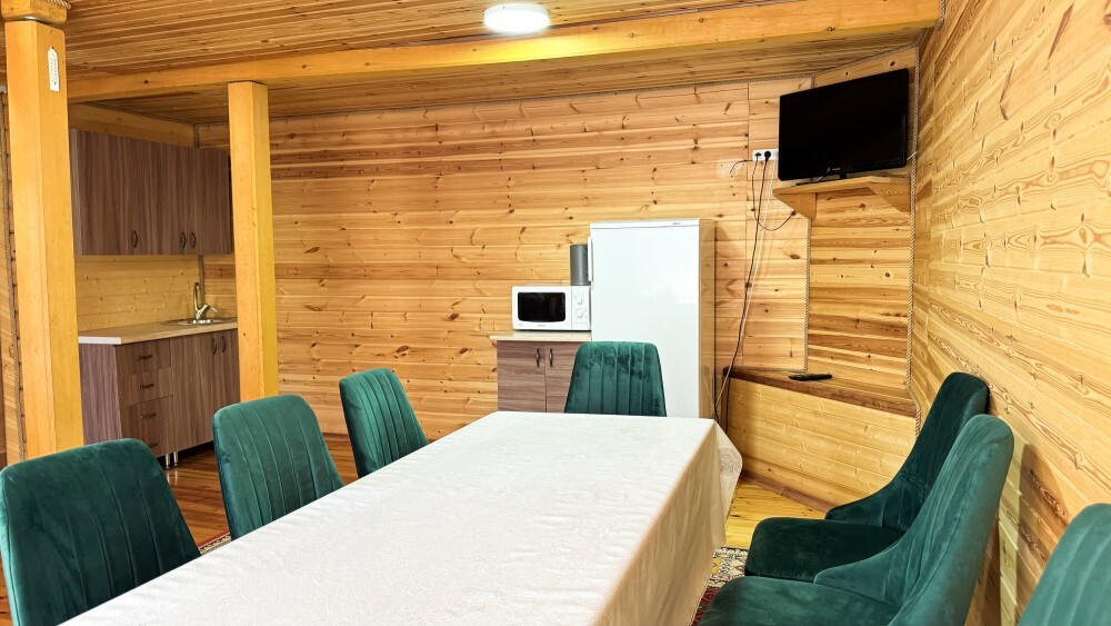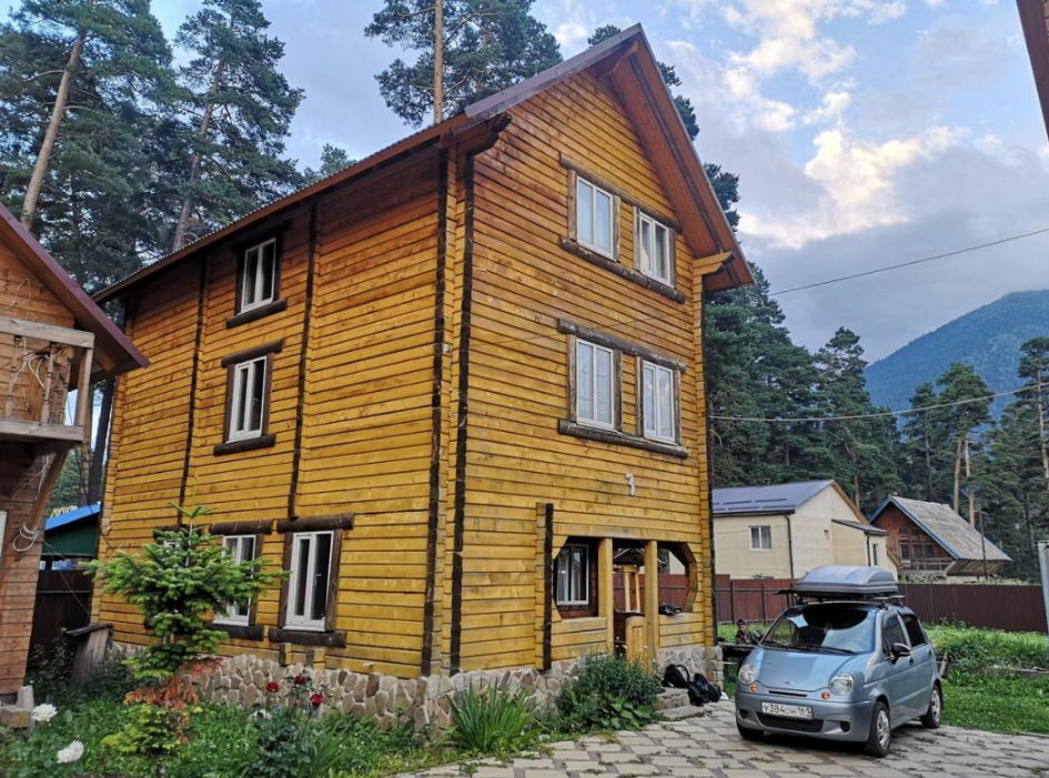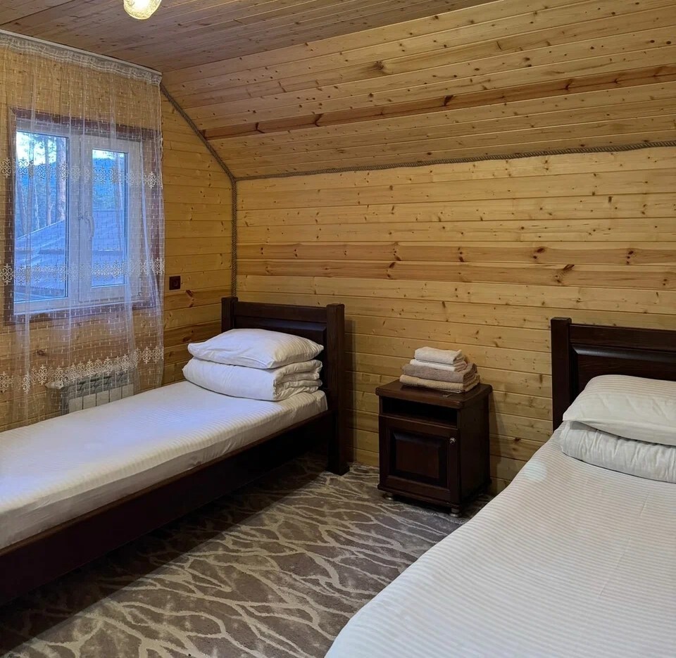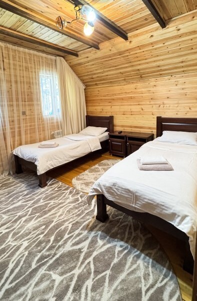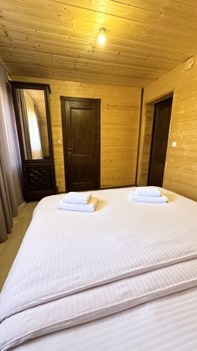 Можно снять весь коттедж «под ключ», с размещением от 9 до 11 гостей (всего на территории 4 коттеджа). В числе удобств гостиная и обеденная зона. В некоторых номерах есть балкон.