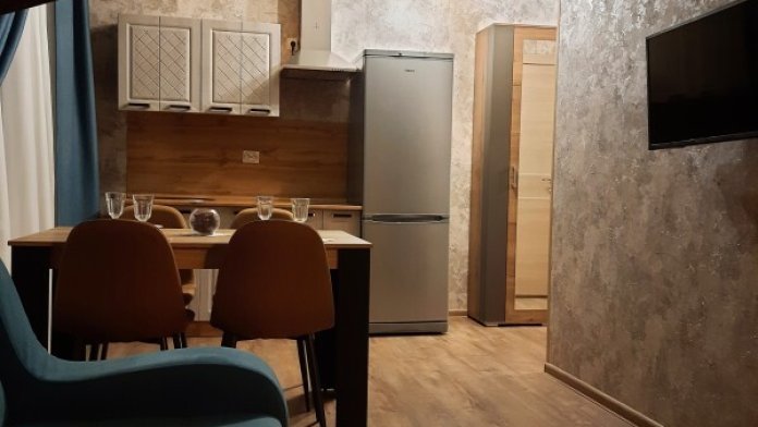 В зоне гостиной есть кухонная зона с обеденным столом, и зона отдыха с диваном и телевизором. В зоне спальне большая двуспальная кровать с ортопедическим матрасом, шкаф для одежды.