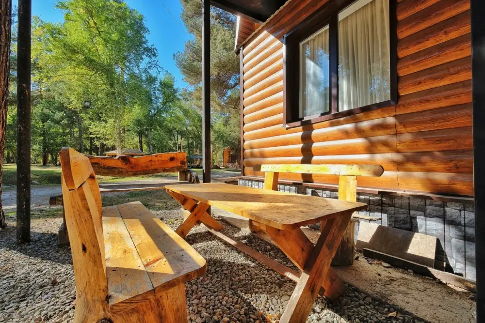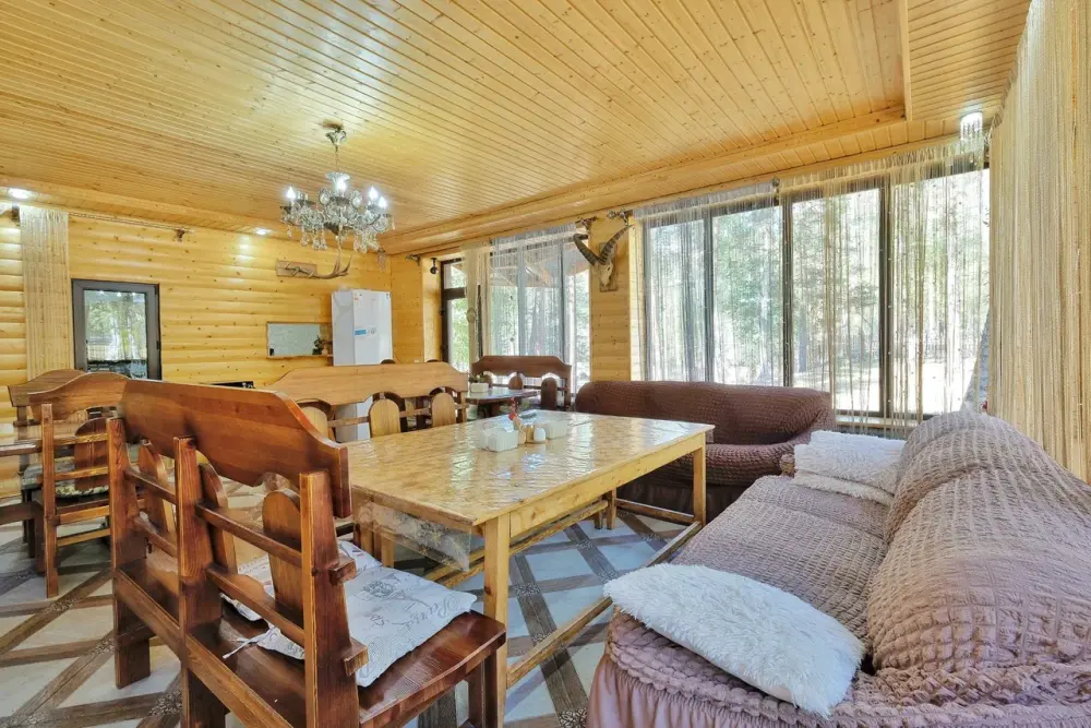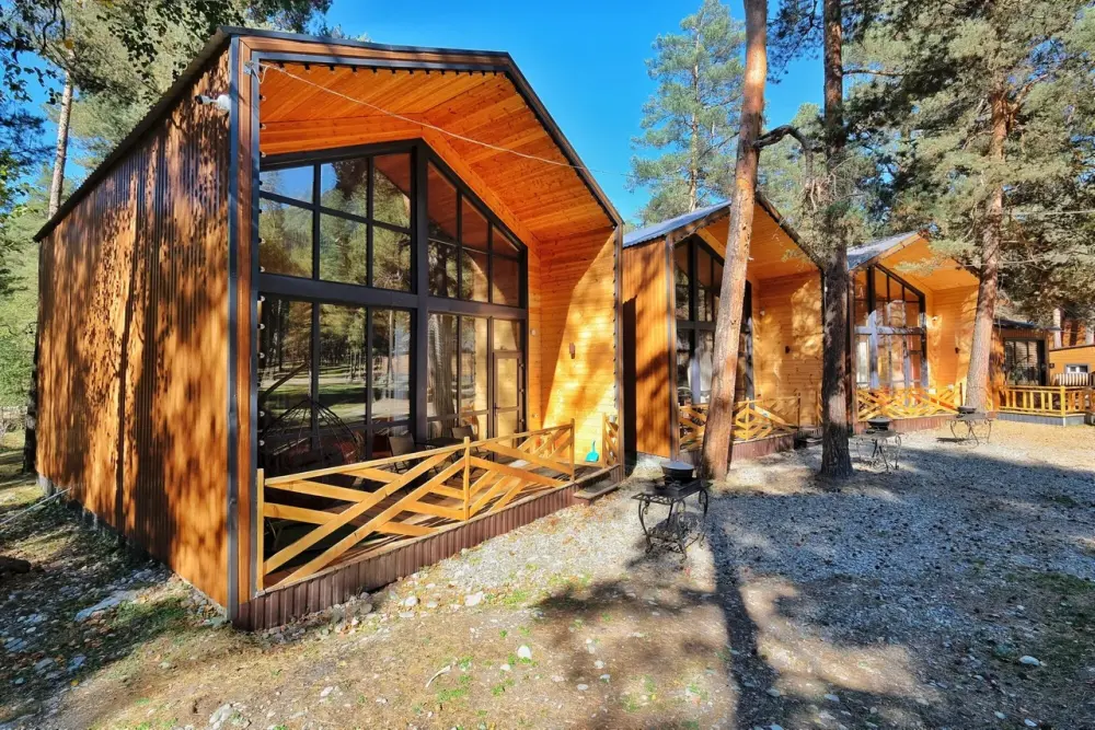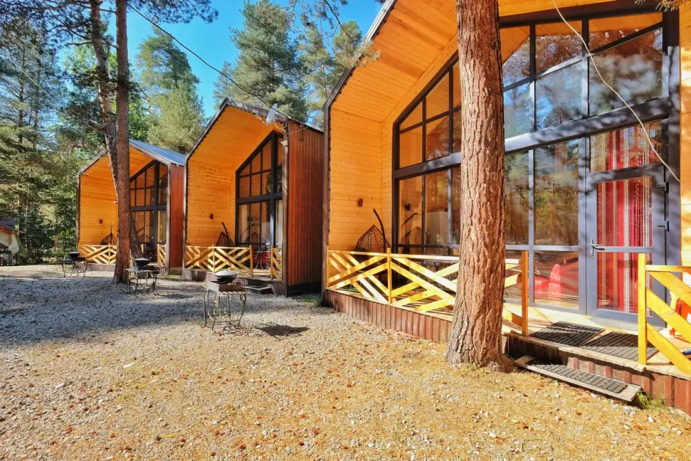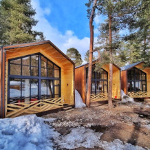 База отдыха состоит из вилл, шале и номеров 2 типов. Виллы Барнхаус вмещают от 7 до 11 человек. Мини-кухня включает электрический чайник, микроволновую печь, варочную панель, набор посуды и холодильник. Перед каждым домиком терраса и свой мангал. Это 3 новых двухэтажных коттеджа, полностью из натуральных и безопасных для здоровья и окружающей среды хвойных пород дерева, что обеспечивает отличный микроклимат. Дома отличаются стильным декором с минимальным количеством стен, благодаря чему воздух в доме свободно циркулирует, оборудованы всем необходимым для комфортного проживания. Завораживает необыкновенный панорамный вид из окна на горы и хвойный лес. Эко-виллы с террасой, оборудованы спальнями, залом и ванной комнатой.