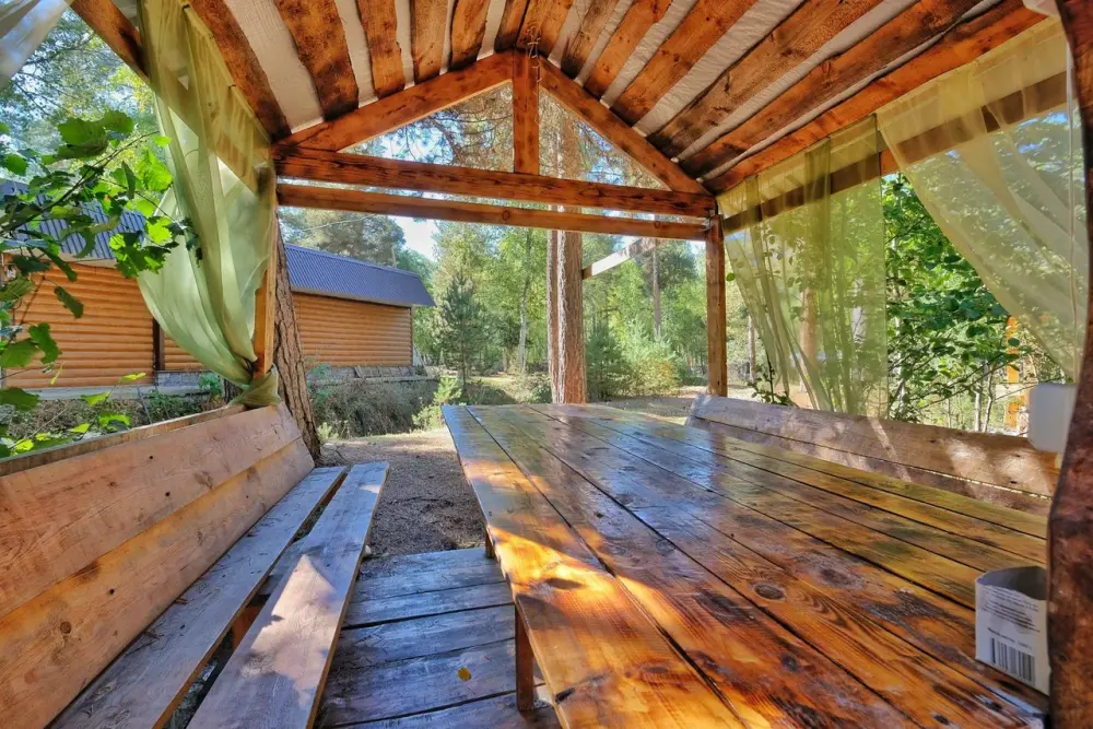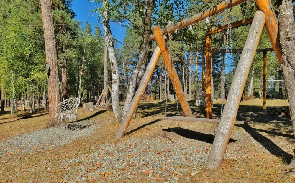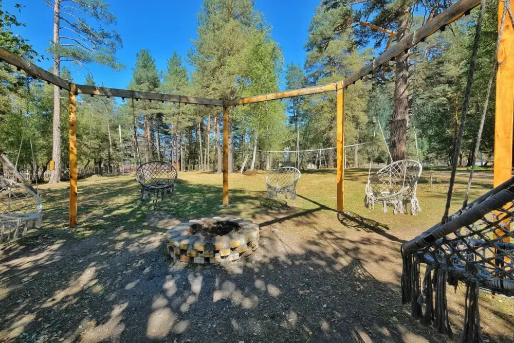 На территории имеется просторная и комфортная зона для семейного отдыха, беседки с мангалами на берегу реки, а также собственная парковка для автомобилей.