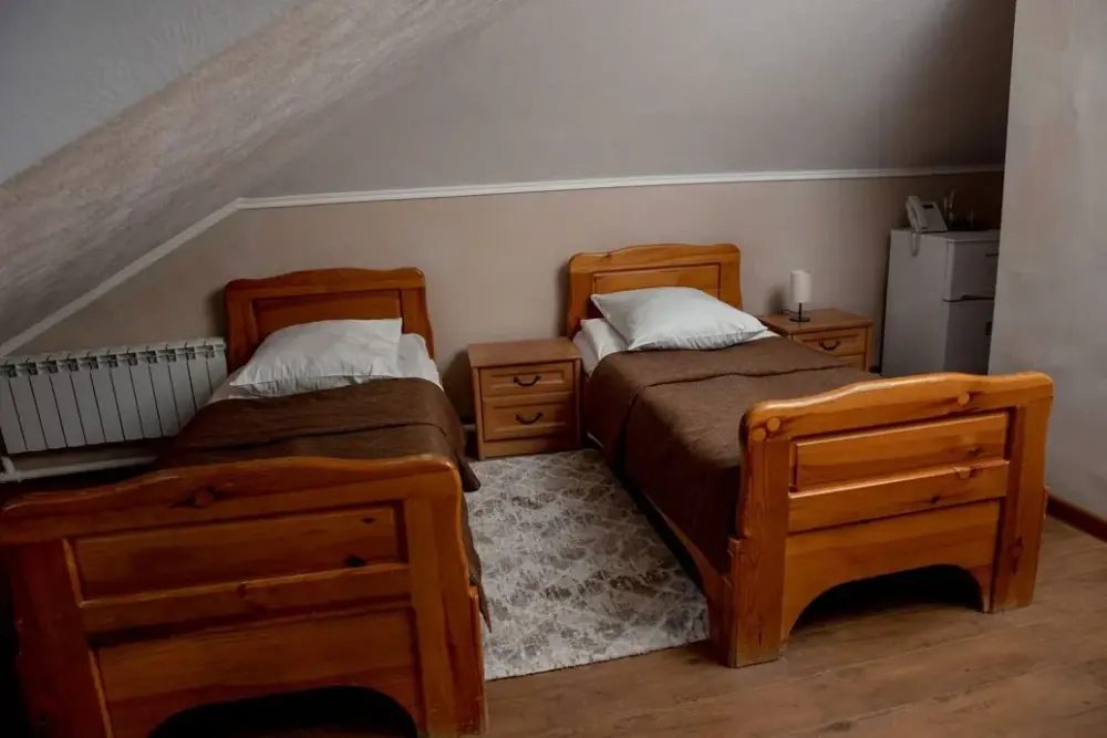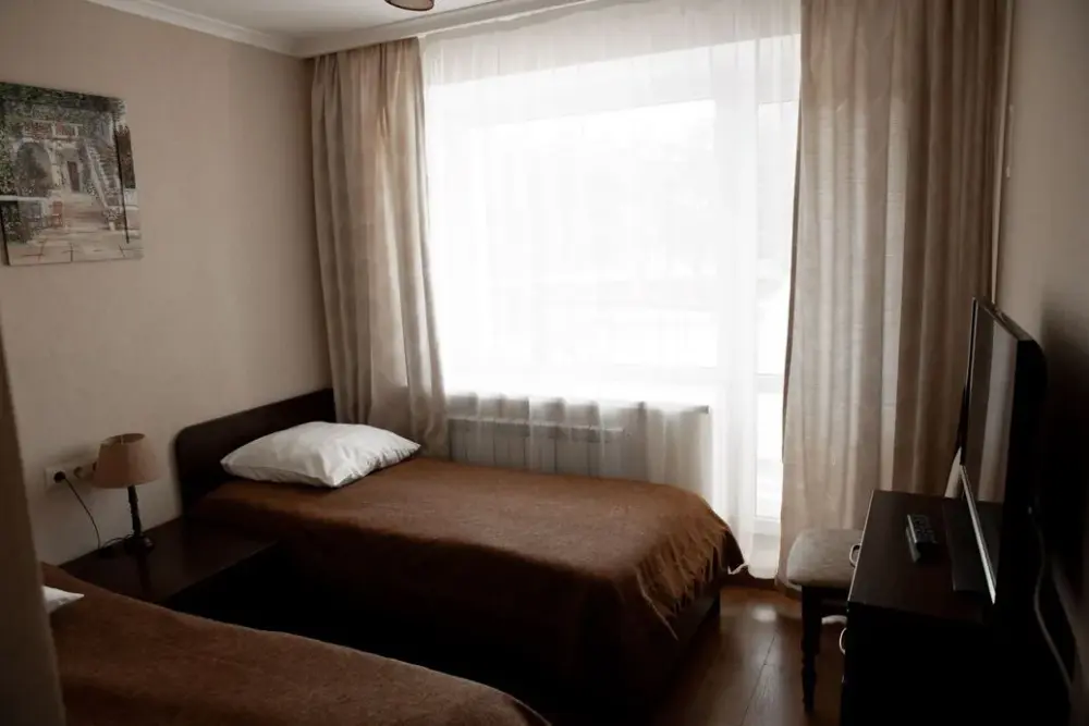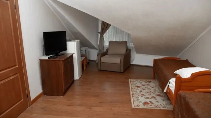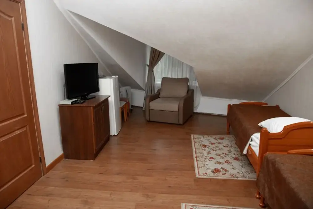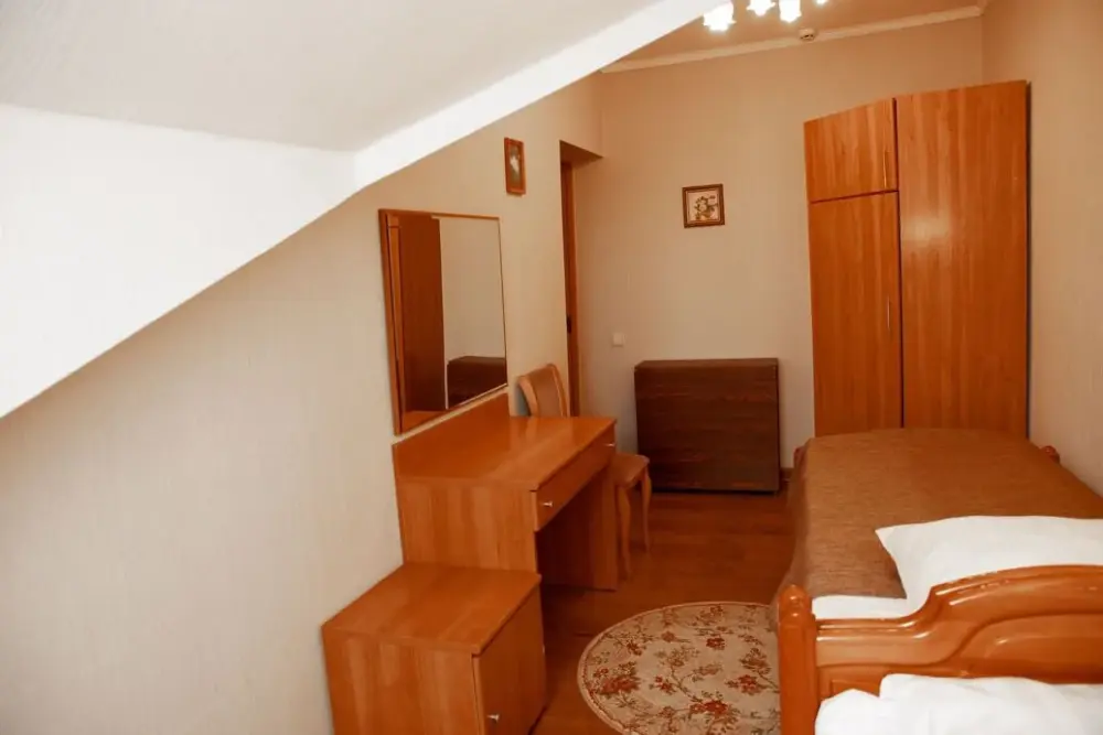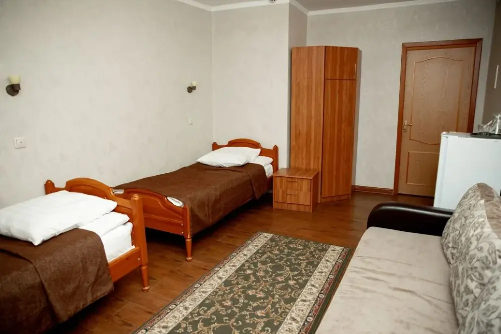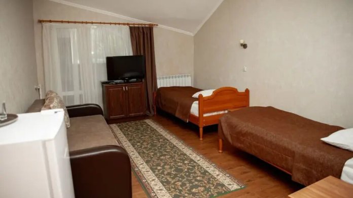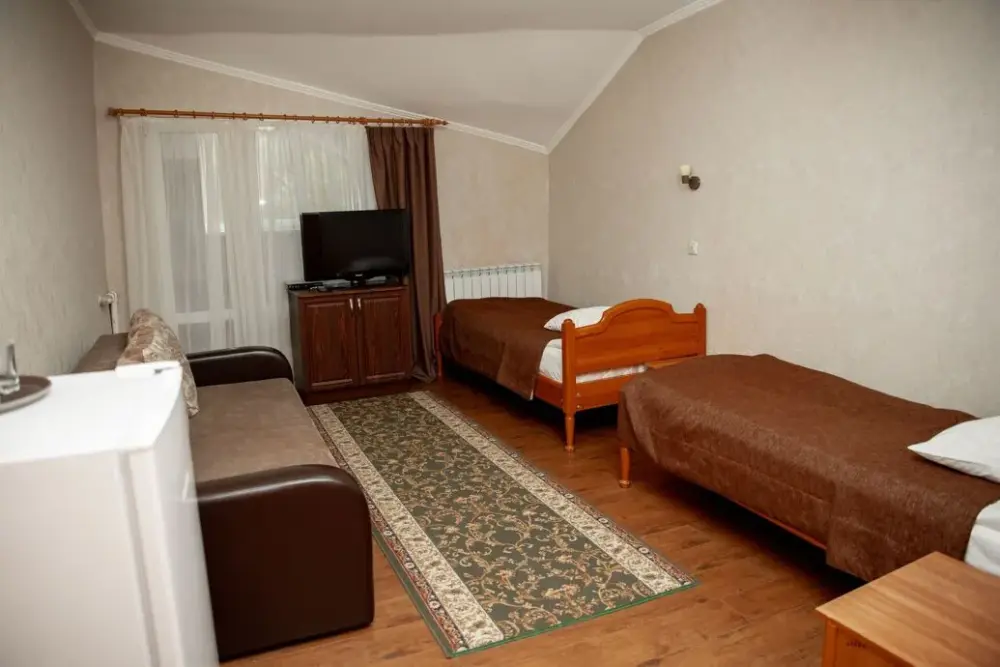 Комплектация: 2 раздельные 1,5 сп. кровати, шкаф , тумба, LCD телевизор 32»,холодильник, вешалка, прикроватные тумбочки. В одном номере есть балкон. Второй номер без балкона.
