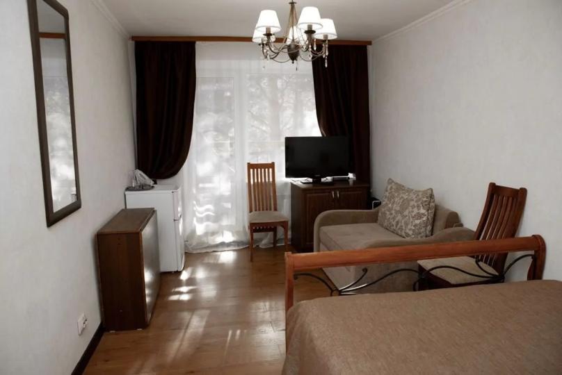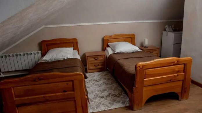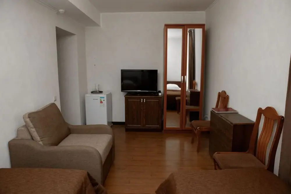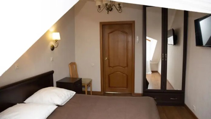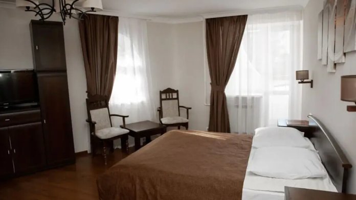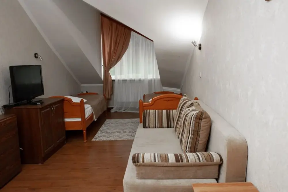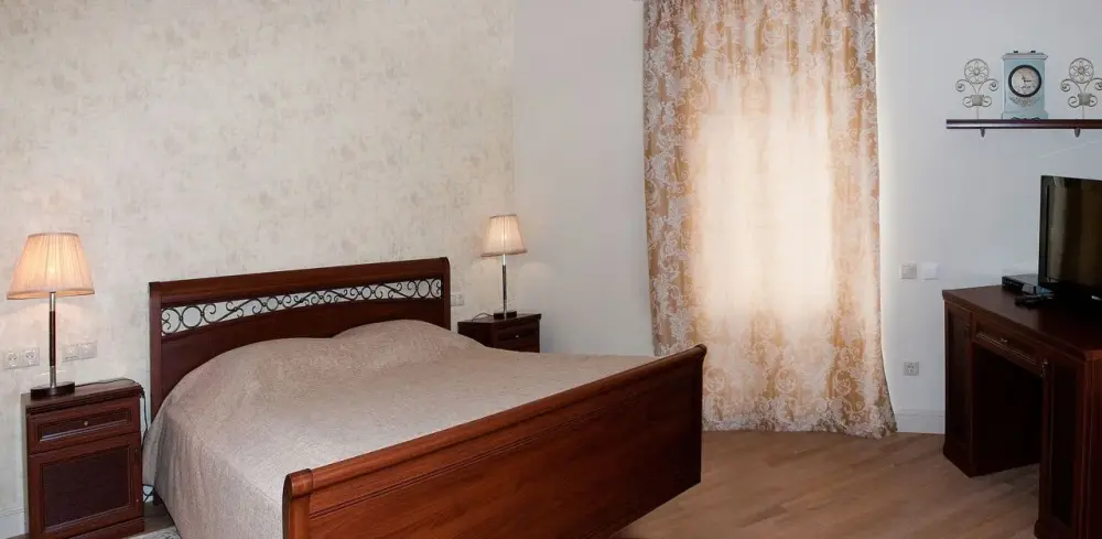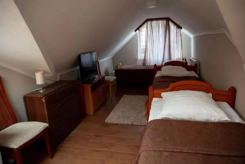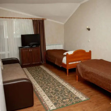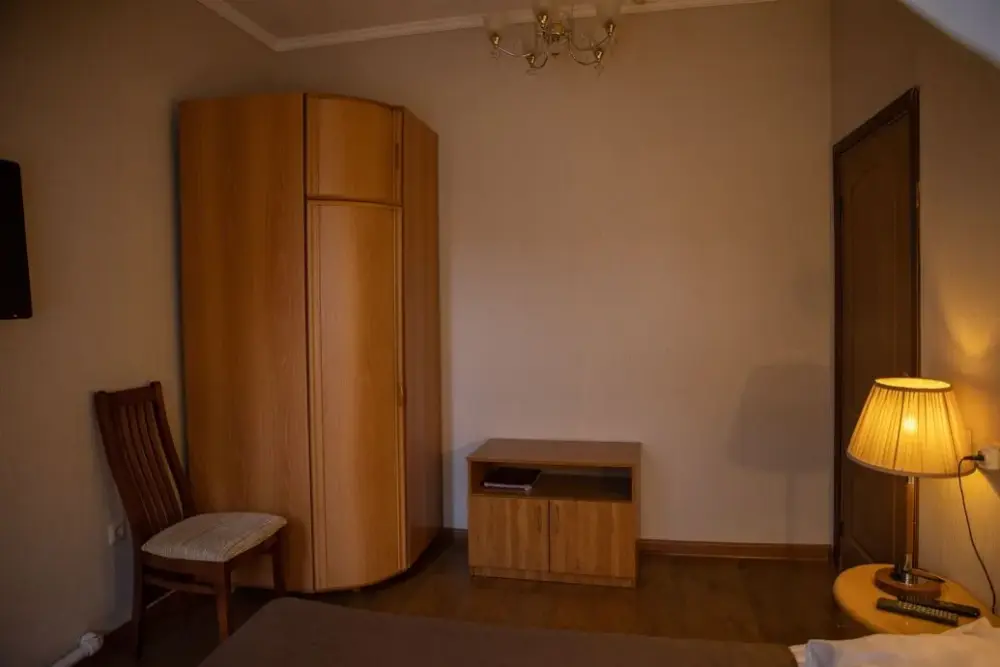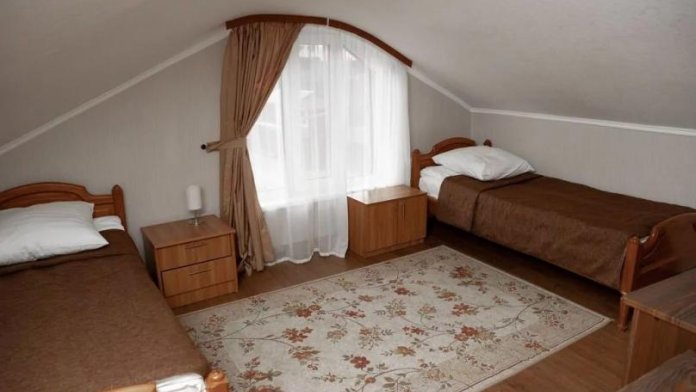 Комплектация: 2 раздельные 1,5 сп. кровати, шкаф , тумба, LCD телевизор 32»,холодильник, вешалка, прикроватные тумбочки. В одном номере есть балкон. Второй номер без балкона.