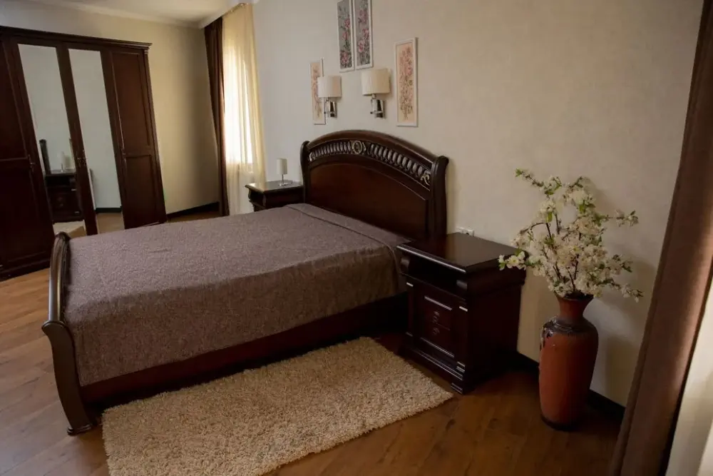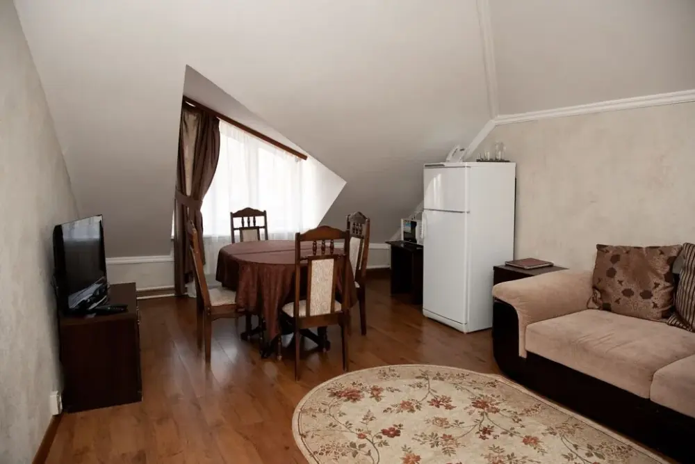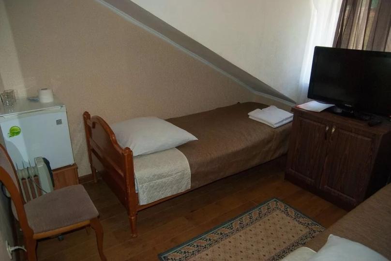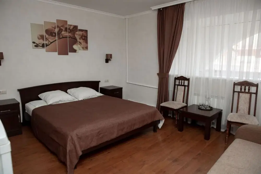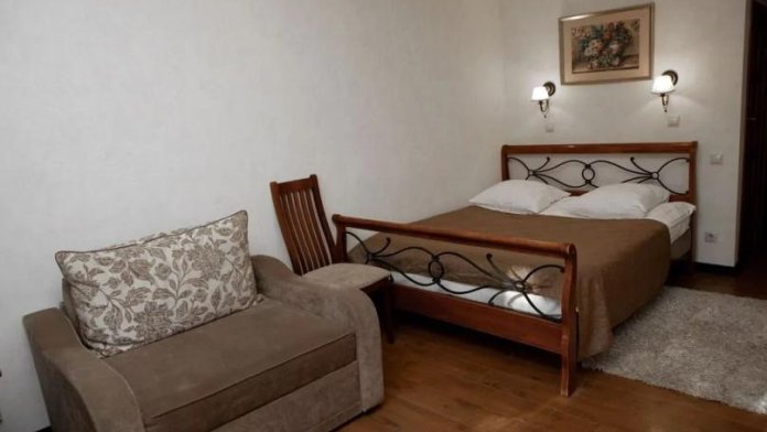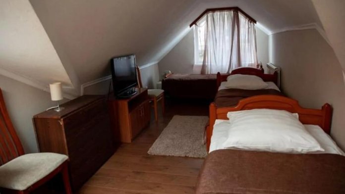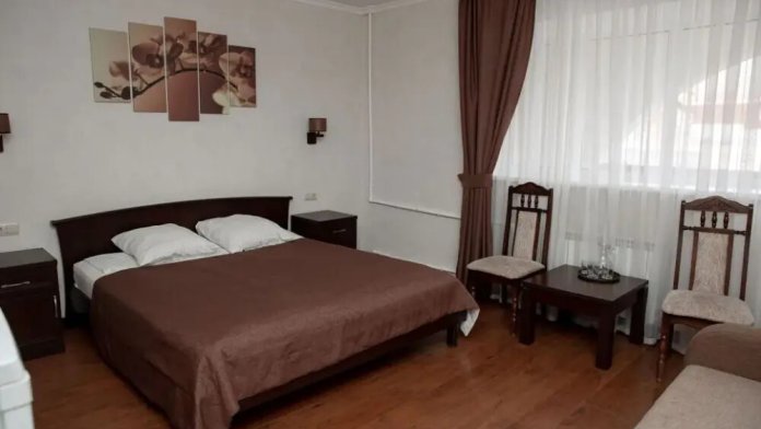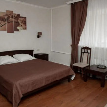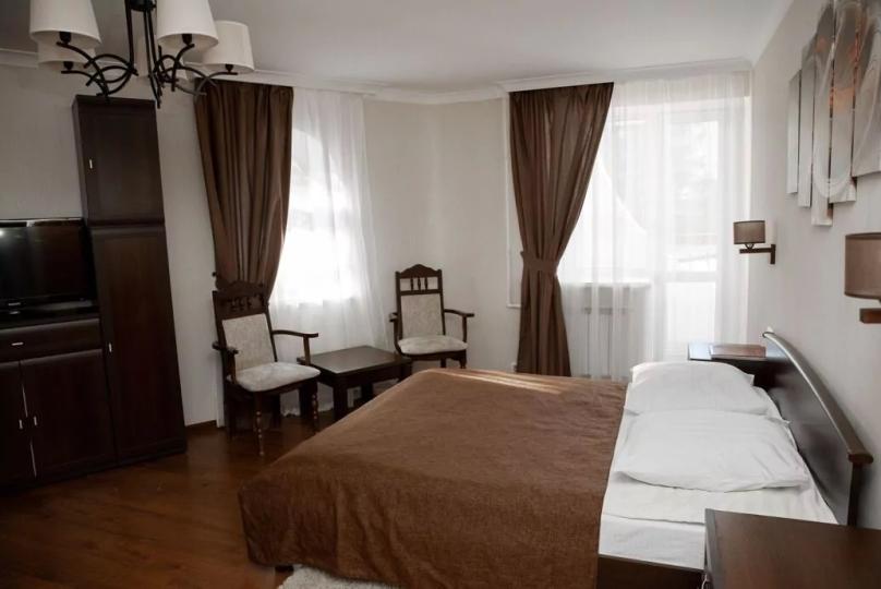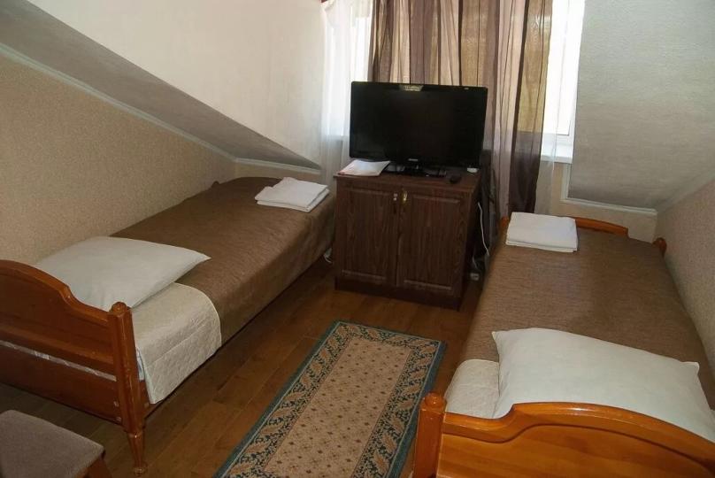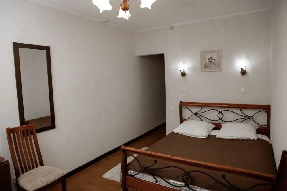 Комплектация: 2 раздельные 1,5 сп. кровати, шкаф , тумба, LCD телевизор 32»,холодильник, вешалка, прикроватные тумбочки. В одном номере есть балкон. Второй номер без балкона.