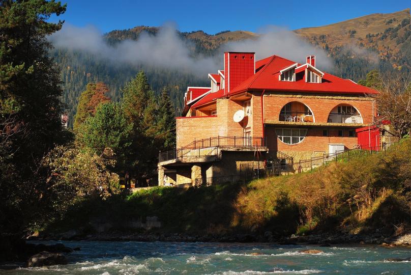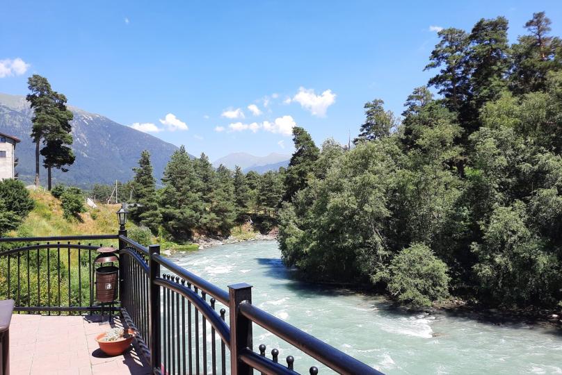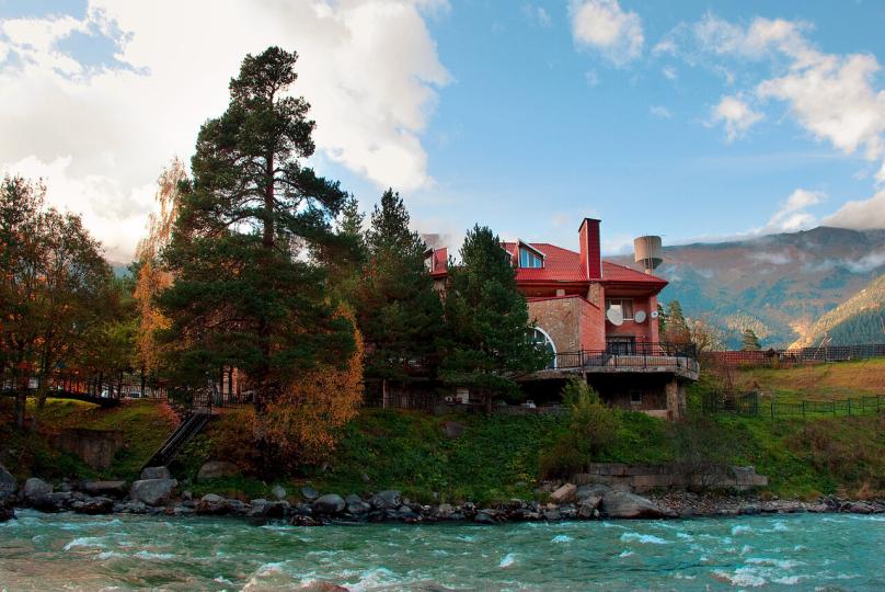 Пансионат «Красная скала» расположен недалеко от центра поселка Архыз, на берегу реки Большой Зеленчук. С террас, окон и балконов открывается прекрасный вид на горные вершины и долину реки.