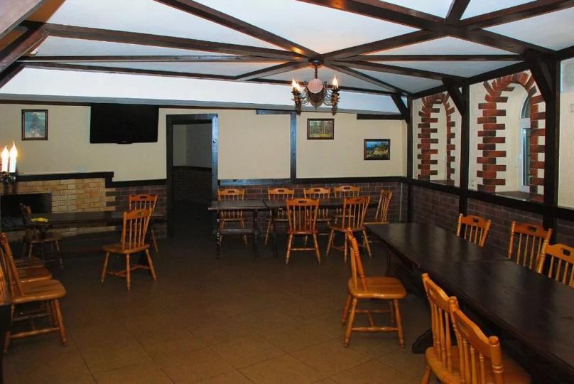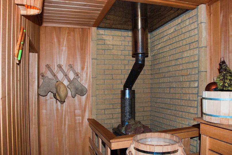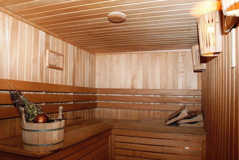 Сауна, вместимостью 8-10 человек, включает в себя: Парная: на дровах; Бассейн-купель: 1,7х1,3 м; Каминный зал.; Кухонный уголок (свч-печь, холодильник, электрический чайник, посуда).