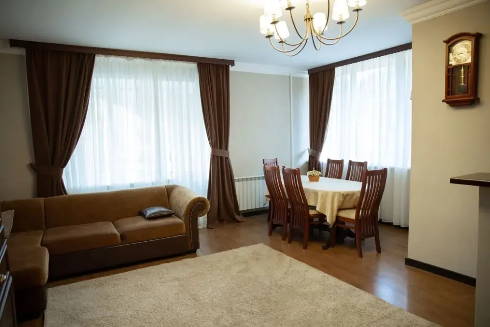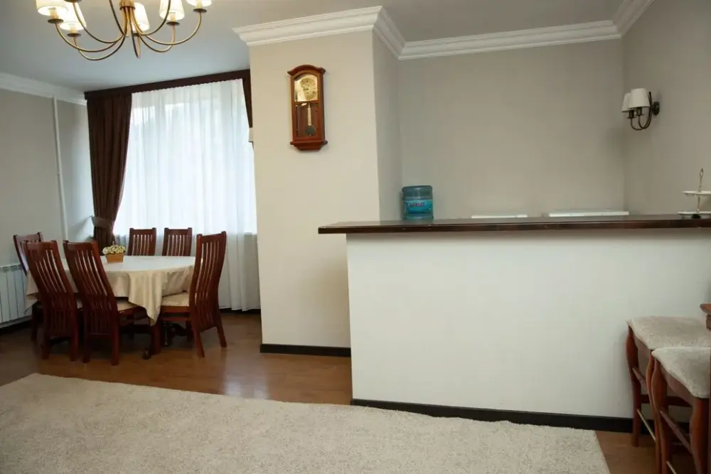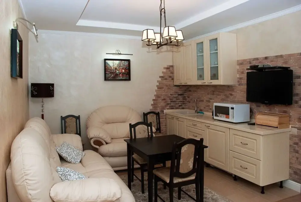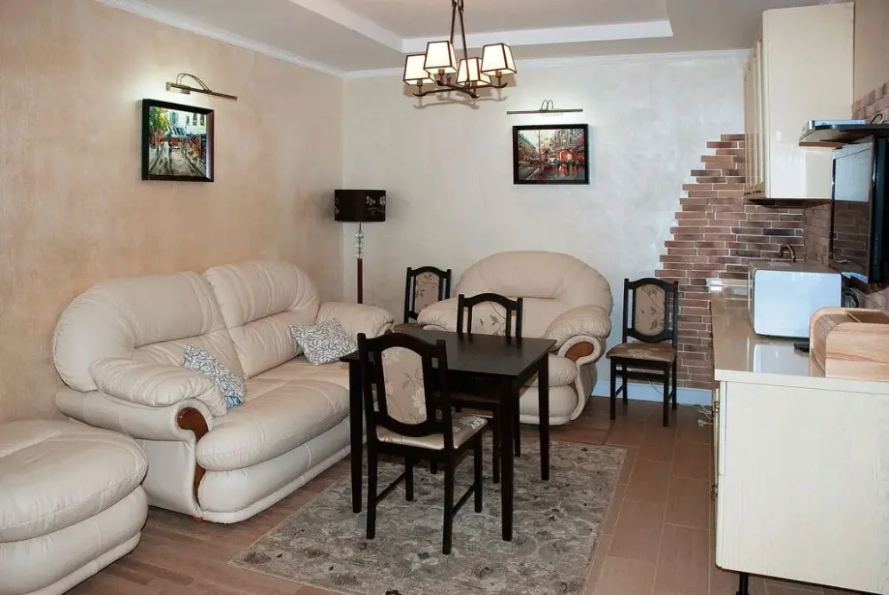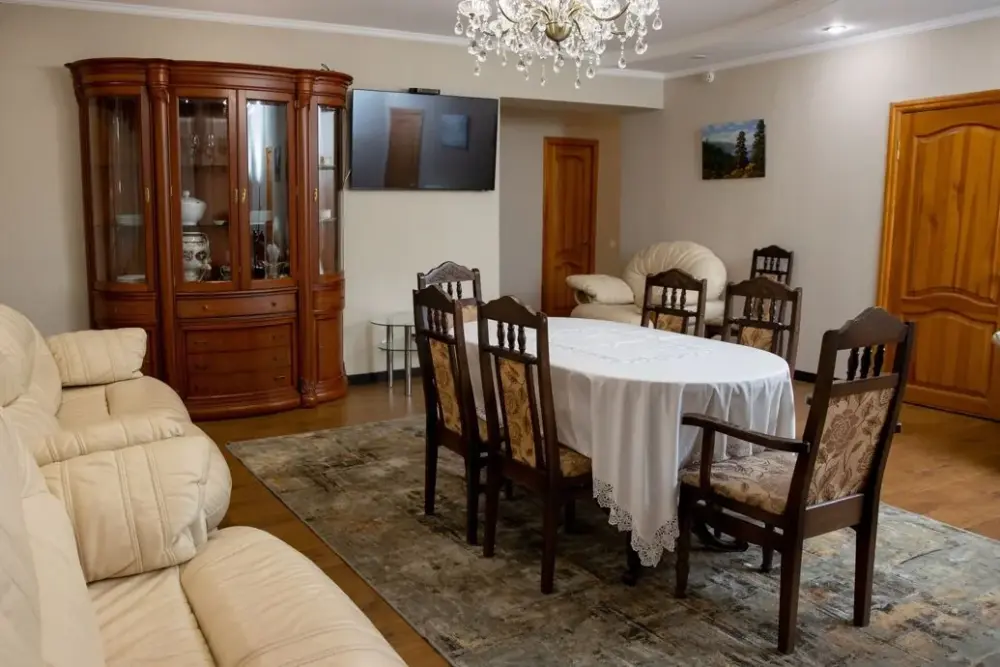 гостиная: диван раскладной, LCD телевизор 32»,спутниковое телевидение триколор, свч-печь, кулер, холодильник, обеденный стол, посуда.