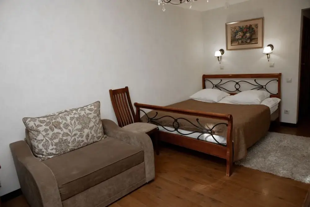 №15 - Без балкона, вид из окна на на речку. Комплектация: 2 раздельные 1,5 сп. кровати, раскладной диван, шкаф, тумба, LCD телевизор 32»,холодильник, вешалка, прикроватные тумбочки.