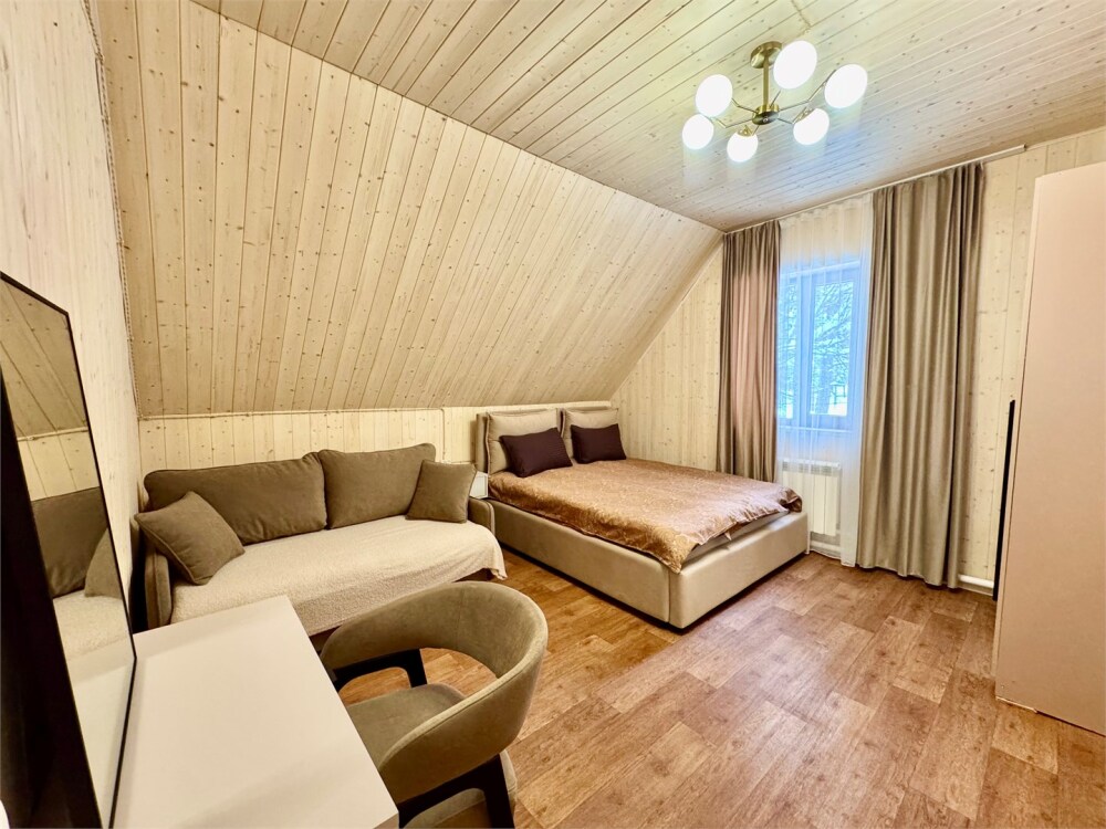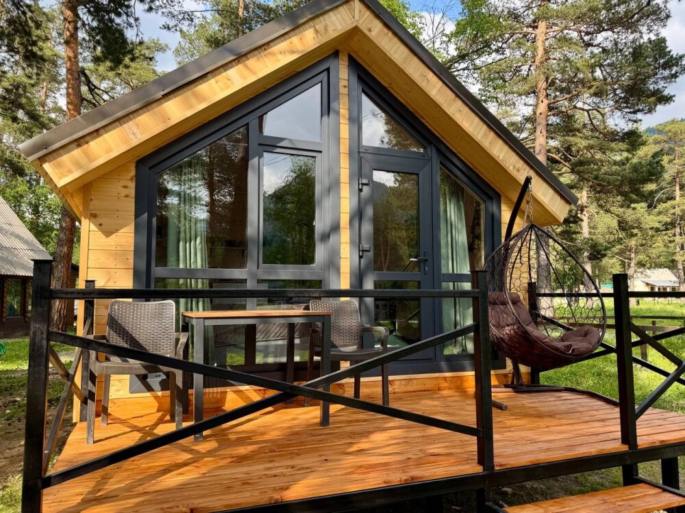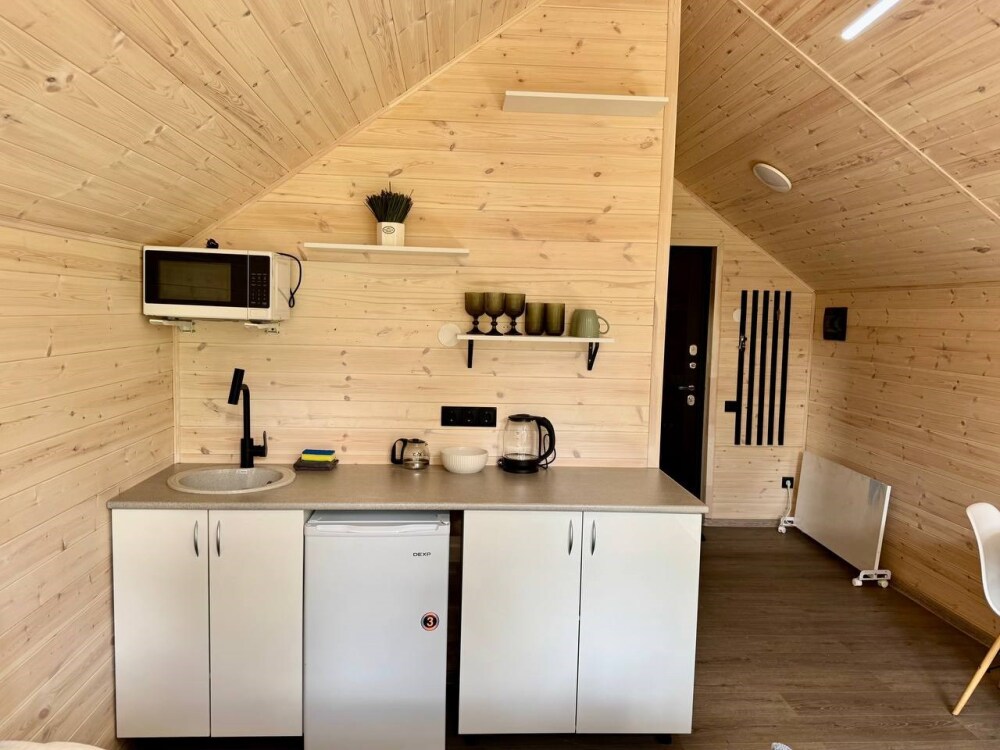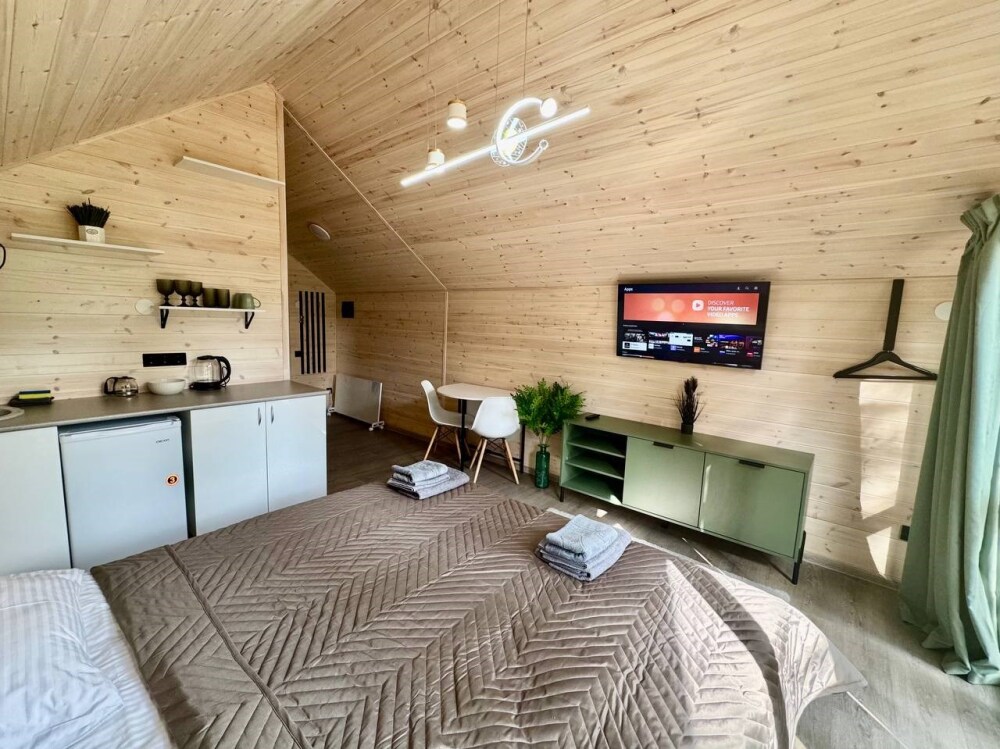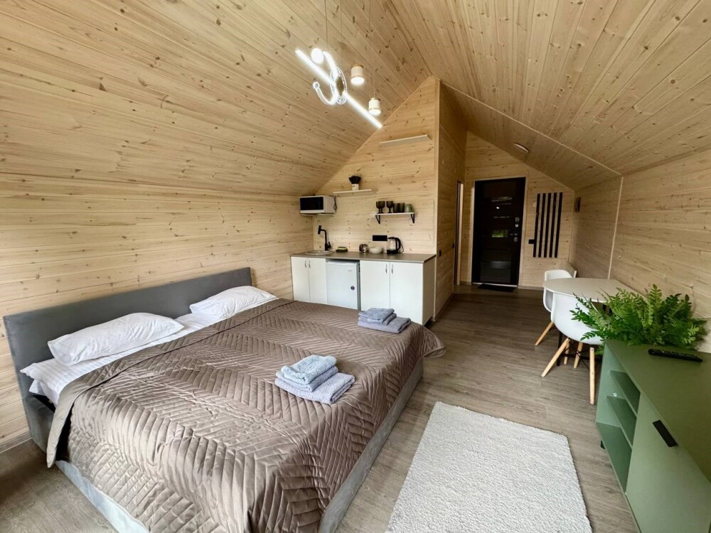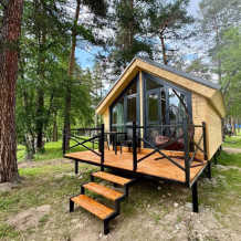База отдыха предложит Вам необычные по стилю домики на берегу озера: 3 новых треугольных А-фрейма с панорамными окнами, 2-местный эко-домик и 2-этажный дом с собственной баней и природной купелью. Домики оборудованы кухней со всей необходимой посудой, просторными террасами с зоной отдыха и индивидуальными мангалами. Курение в номерах строго запрещено.