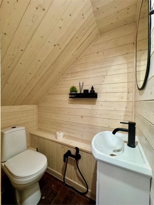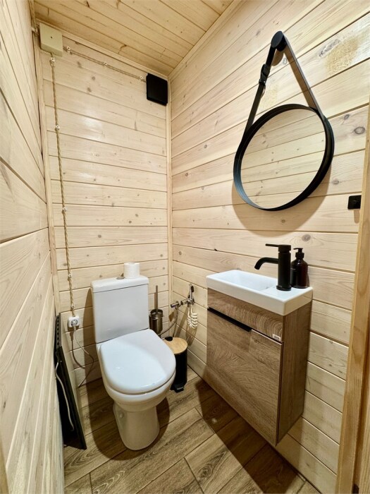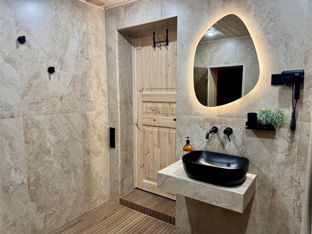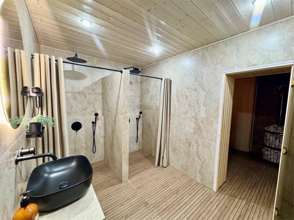 Дом с 2 санузлами на 1 этаже: 2 шт. туалета и 2 душа при входе в баню. Предоставляются фен, тапочки, мыло, гель для душа, зубной набор, шампунь, по 3 полотенца на гостя.