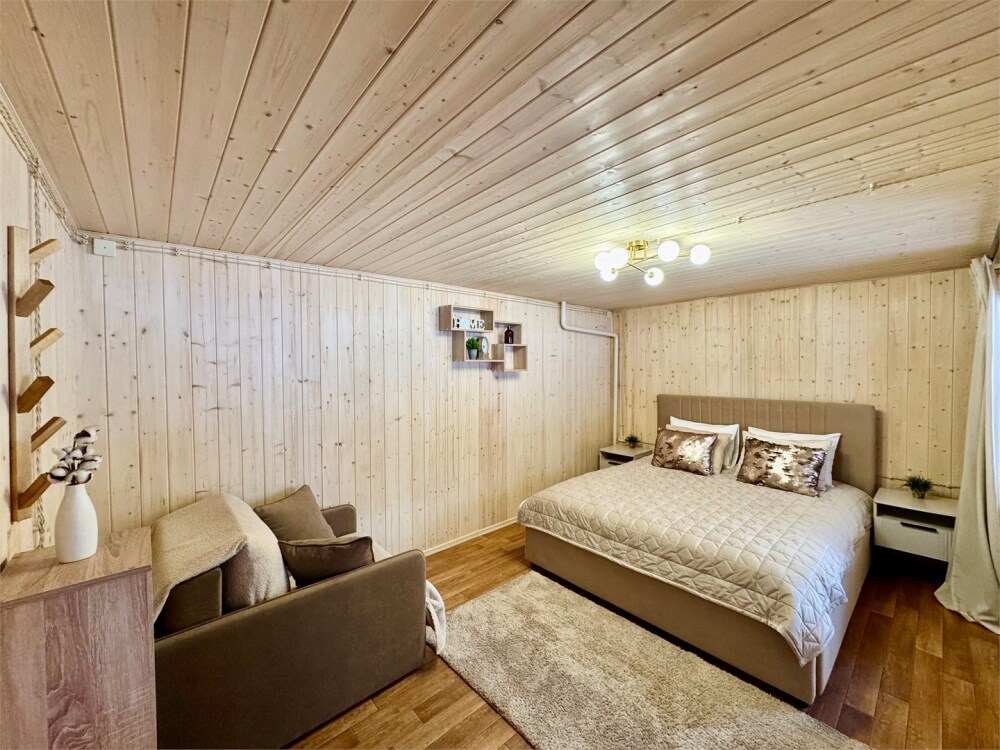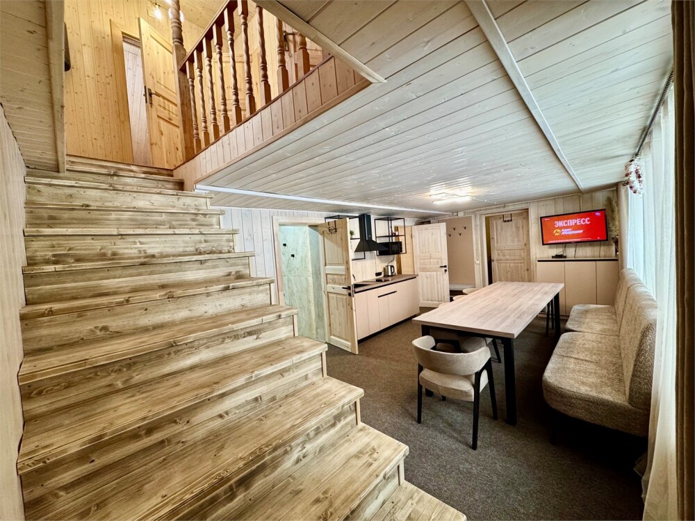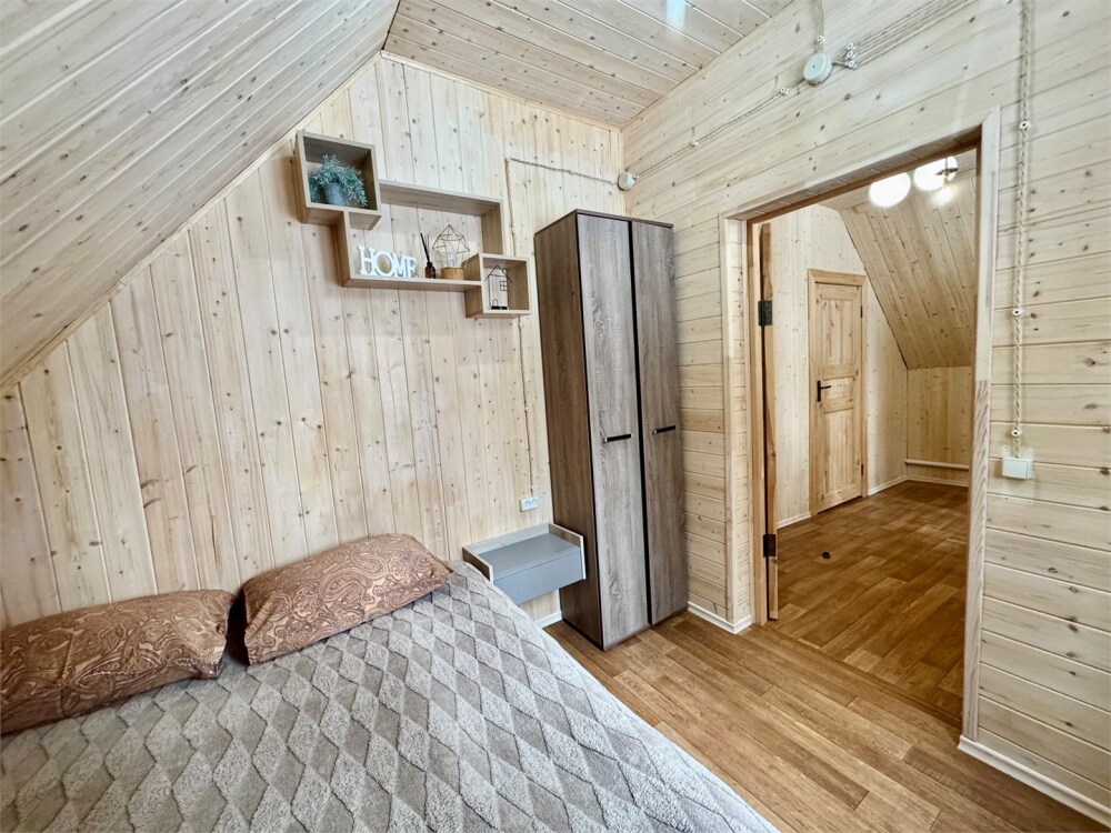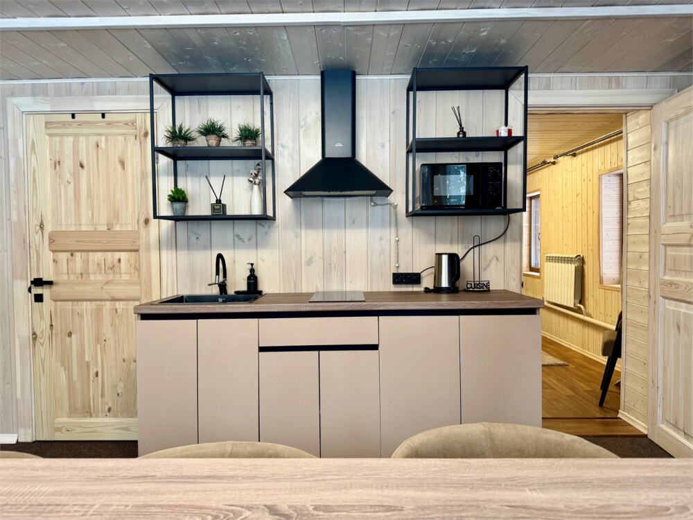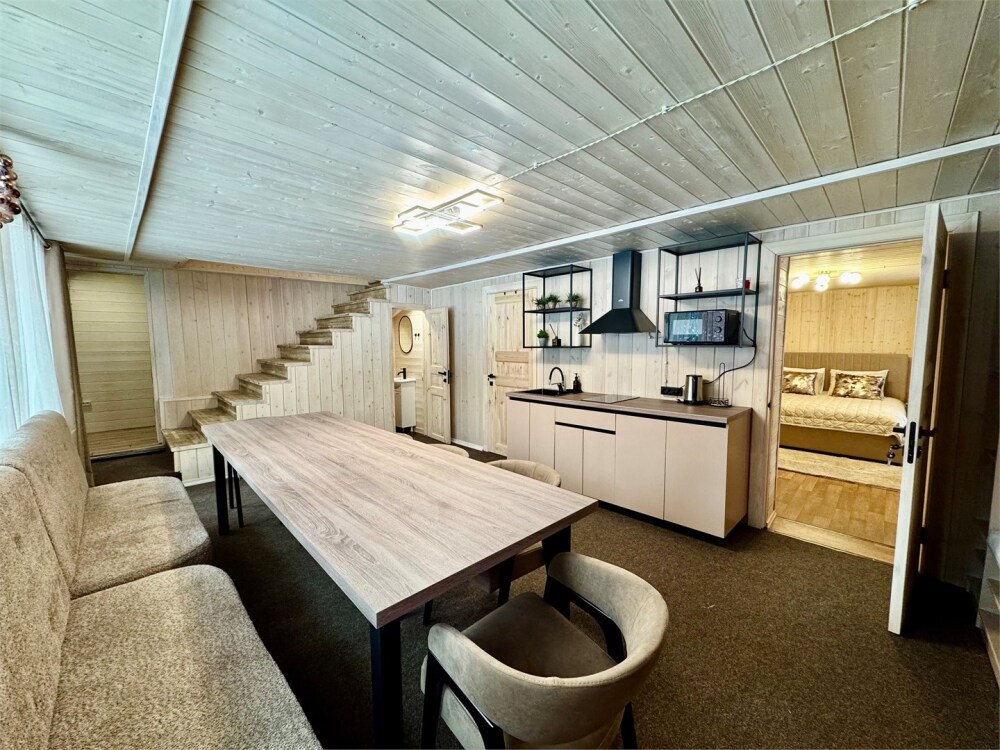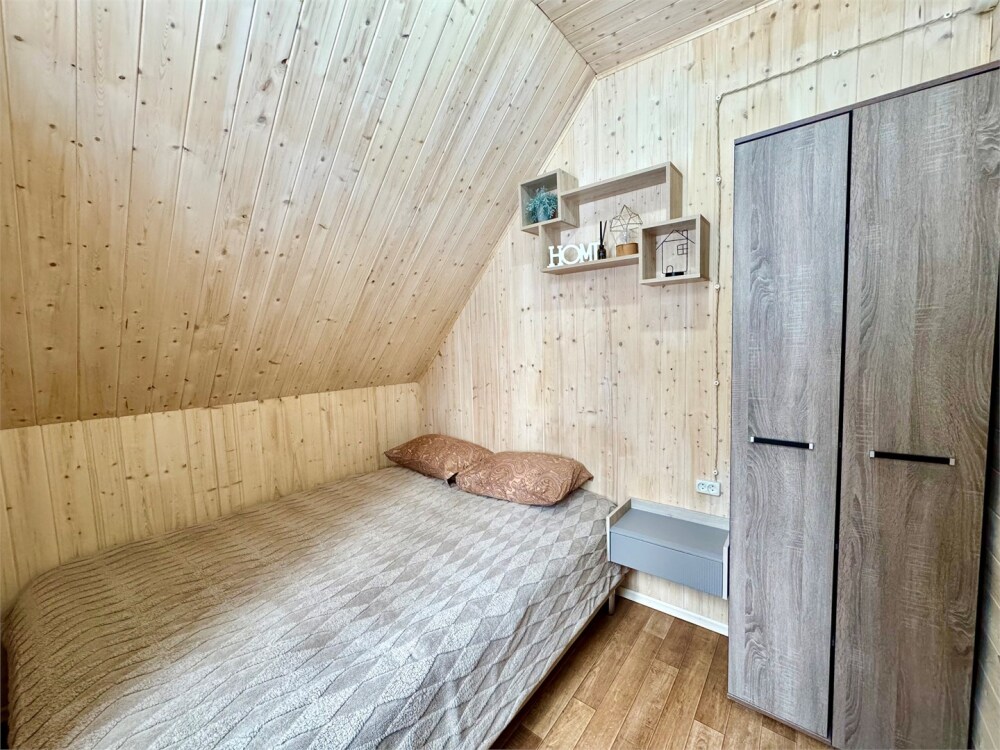 Спальные места: на 1-м этаже 1 двуспальная кровать и 1 двуспальная кровать на 2-м уровне дома. В гостиной обеденная зона и кухня, оснащенная микроволновой печью, электрической плитой, мини-холодильником с морозильной камерой, эл. чайником, посудой (сковорода, кастрюля, тарелки, стаканы, бокалы, столовые приборы).