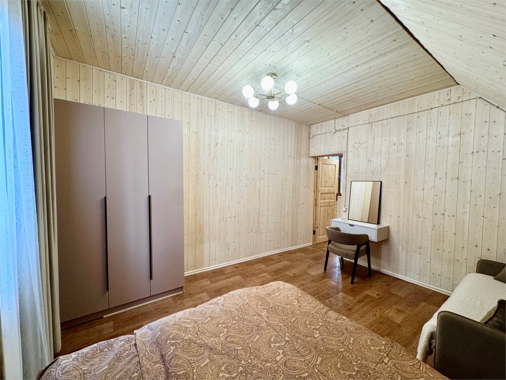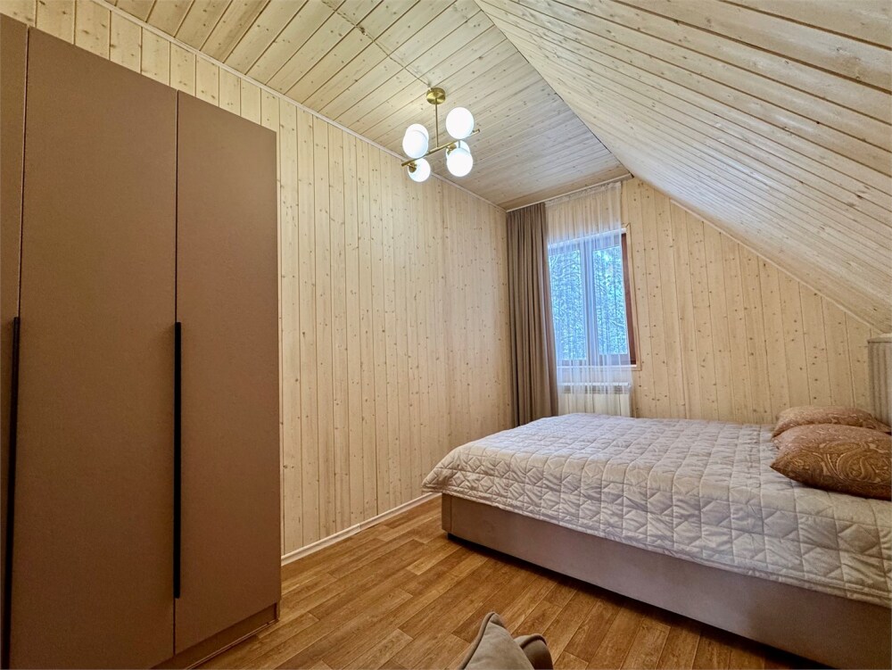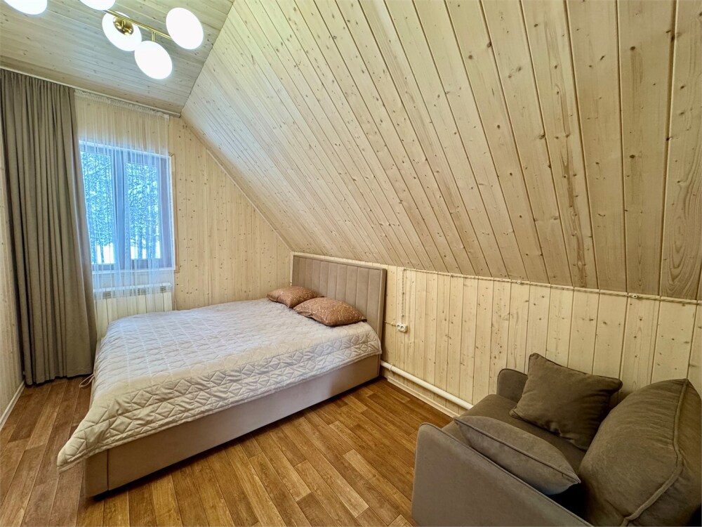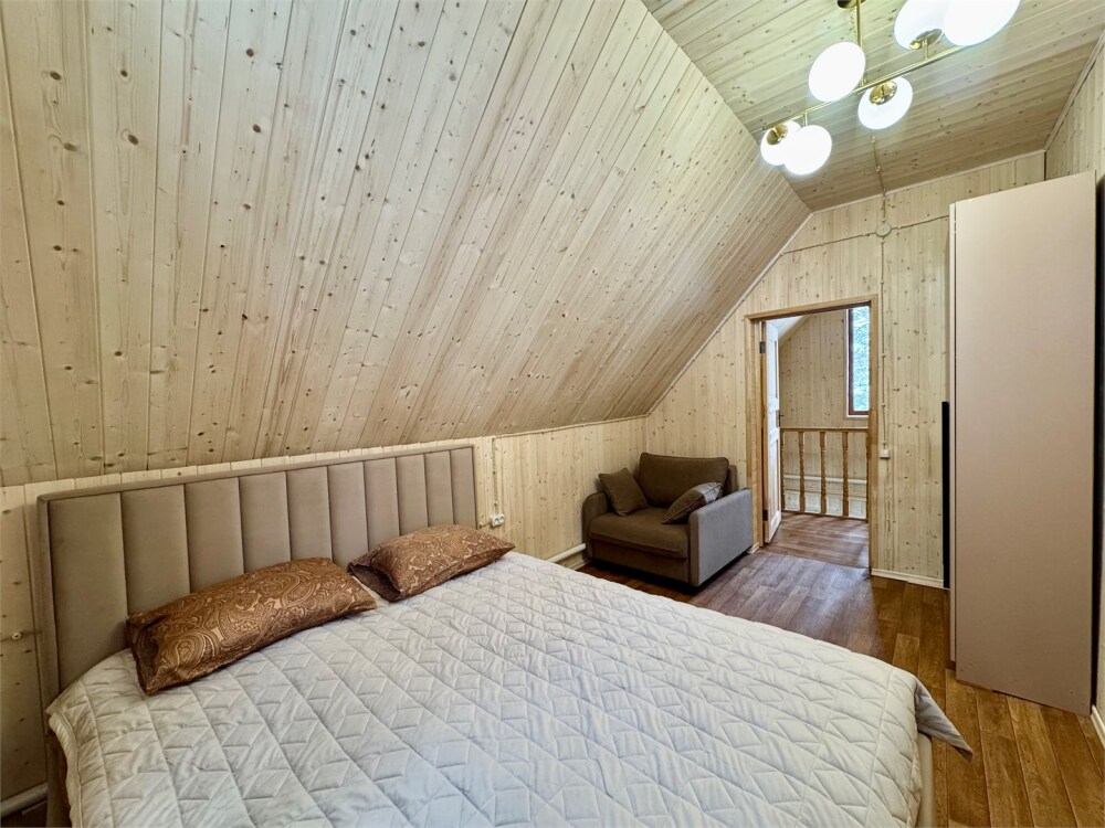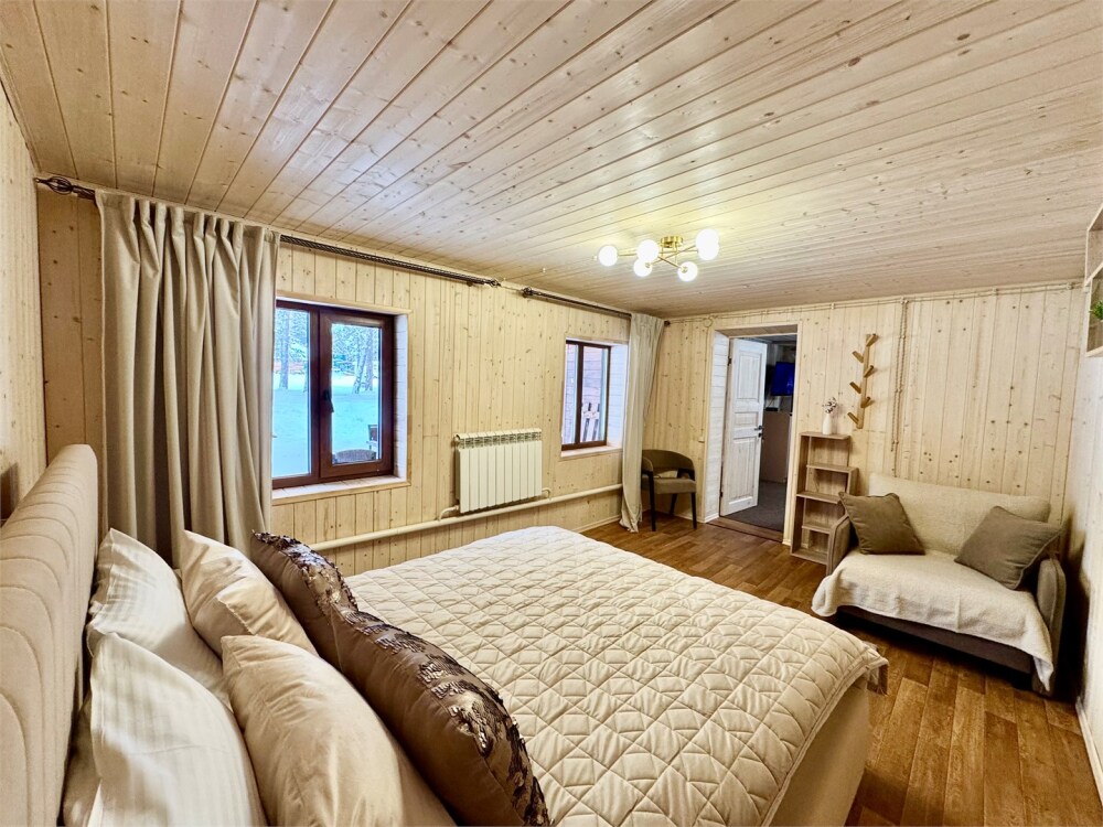 Спальные места: на 1-м этаже спальня с двуспальной кроватью и раскладной диван в гостиной, на 2 уровне - двуспальная кровать.