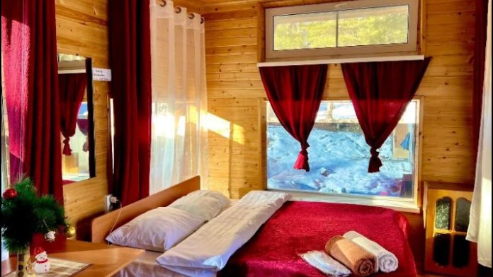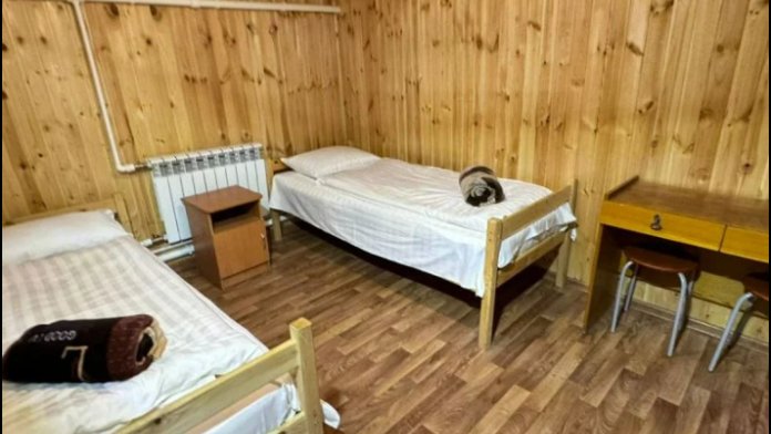 В номере есть всё необходимое, душ, санузел, кухонная зона, холодильник, печка, посуда.
