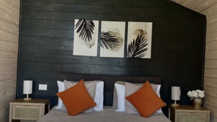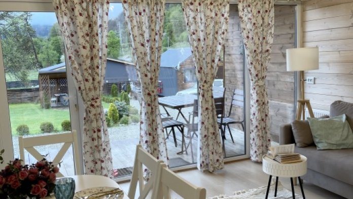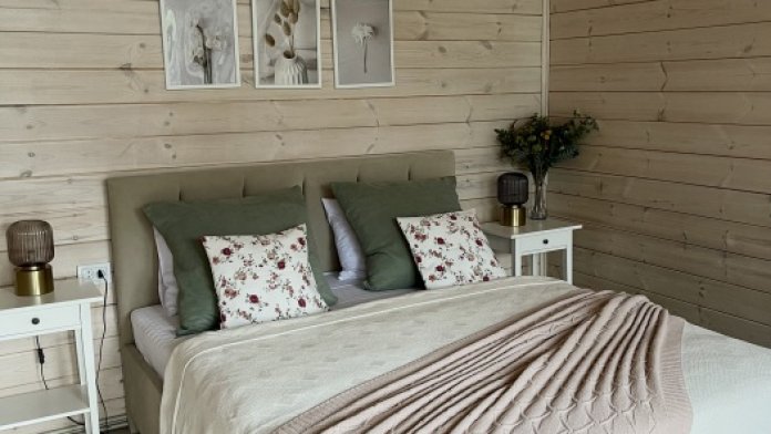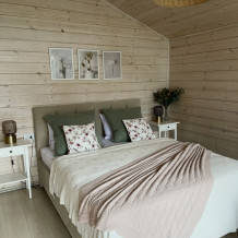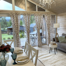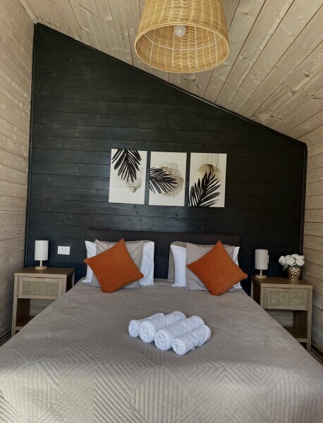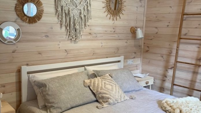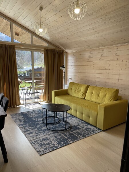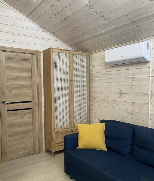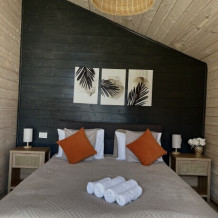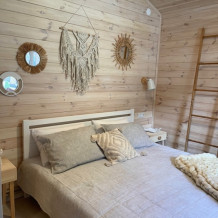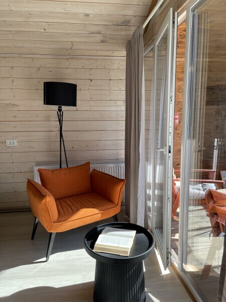 Интерьер домика выполнен в спокойных, расслабленных тонах, но каждый элемент декора вносит в общую атмосферу яркий акцент.В спальне просторная двуспальная кровать. Шале оснащено просторным санузлом с комфортной душевой и всем необходимым для мини-спа процедур. Гостиная разделена на зону отдыха и зону кухни.