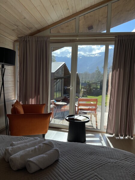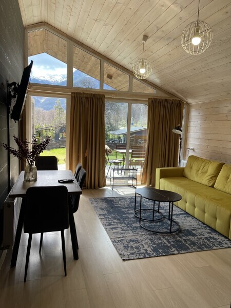 Шале №1 состоит из спальни, кухни-гостиной, просторной ванной комнаты а также террасы с видом на горы. В спальне удобная кровать с ортопедическим матрасом, в каждой комнате авторские интерьеры и продуманное освещение, из такого домика не хочется возвращаться домой, настолько в нем комфортно. Проектировка дома рассчитана так, чтобы отовсюду были видны красивые пейзажи. Несмотря на большие панорамные окна в доме очень тепло и уютно. В кухонной зоне есть вся необходимая техника и посуда для приготовление пищи.
