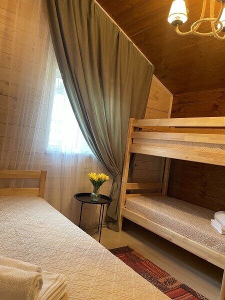Шале №3 состоит из двух комнат, кухни-гостиной и просторной ванной комнаты. Шале просто создано для комфортабельного и невероятно эстетического отдыха. Завораживающий вид на горы из панорамного окна спальни и гостиной, удобные спальные места, большая терраса, всё это вы найдёте в нашем шале. В доме своя кухня со всеми удобствами и большим количеством посуды. Максимальная вместимость дома 7 человек.