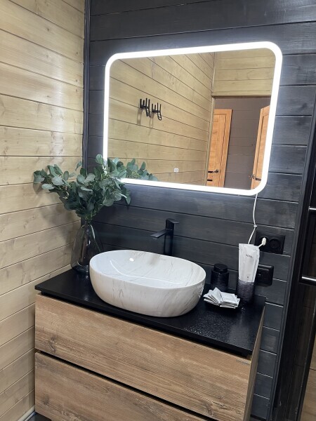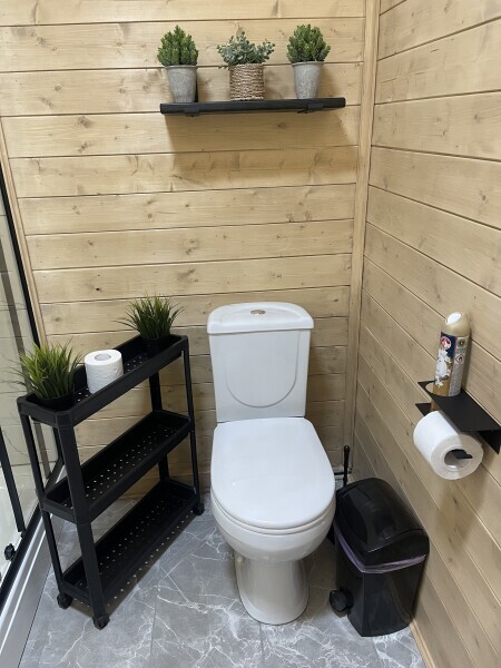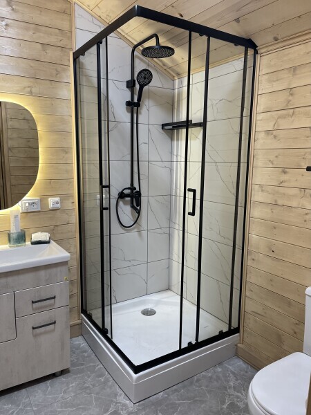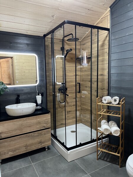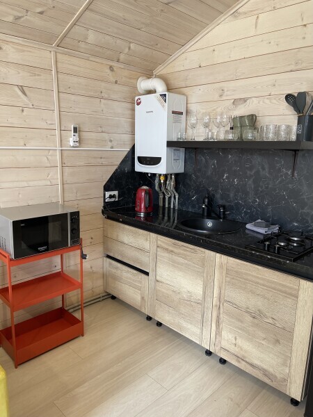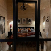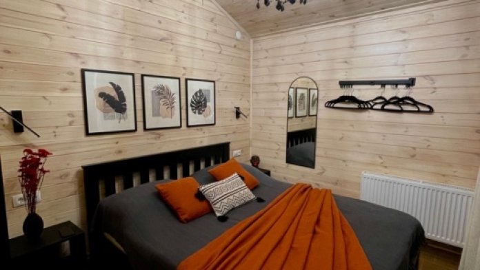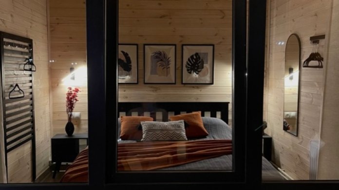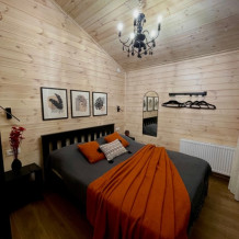 Интерьер шале, выполненный в стильных графитовых оттенках, поддерживает атмосферу уюта, наполняя энергией и положительными эмоциями.В спальне широкая, удобная кровать с ярким, стильным текстилем, большое зеркало и функциональные прикроватные тумбы. Зона приготовления пищи отвечает запросам самых требовательных гостей, в домике предусмотрены: большой холодильник, микроволновая печь, варочная панель, удобная зона для хранения посуды и современная мойка.