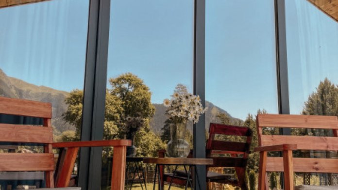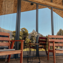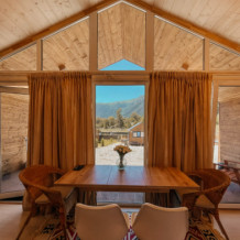 Шале №1 состоит из спальни, кухни-гостиной, просторной ванной комнаты а также террасы с видом на горы. В спальне удобная кровать с ортопедическим матрасом, в каждой комнате авторские интерьеры и продуманное освещение, из такого домика не хочется возвращаться домой, настолько в нем комфортно. Проектировка дома рассчитана так, чтобы отовсюду были видны красивые пейзажи. Несмотря на большие панорамные окна в доме очень тепло и уютно. В кухонной зоне есть вся необходимая техника и посуда для приготовление пищи. Максимальная вместимость дома 5 человек.