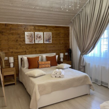 Шале №2 состоит из двух спальных комнат, кухни гостиной и просторной ванной комнаты. В спальных зонах удобные кровати нужной мягкости для комфортно сна, в кухне гостиной большое количество различной посуды, столовые приборы, кухонное оборудование, а также удобный диван для уютных посиделок в окружении близких людей.