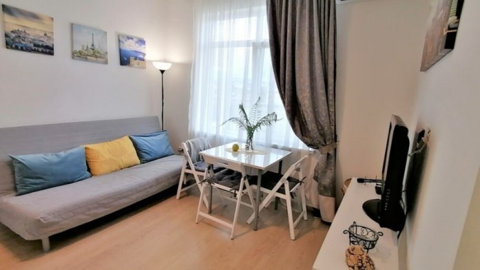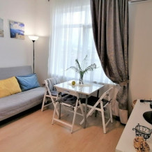 Апартаменты представляют собой евро-двушку (кухню-гостинную и изолированную спальню). В апартаментах своя кухонная зона со всем оборудованием для приготовления пищи, свой санузел с душевым отсеком. Вход в апартаменты отдельно с улицы.