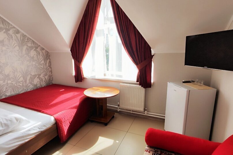 Двуспальная кровать 1.40, бескаркасное кресло как дополнительное спальное место, телевизор, холодильник, кондиционер, индивидуальный санузел, фен, сейф
