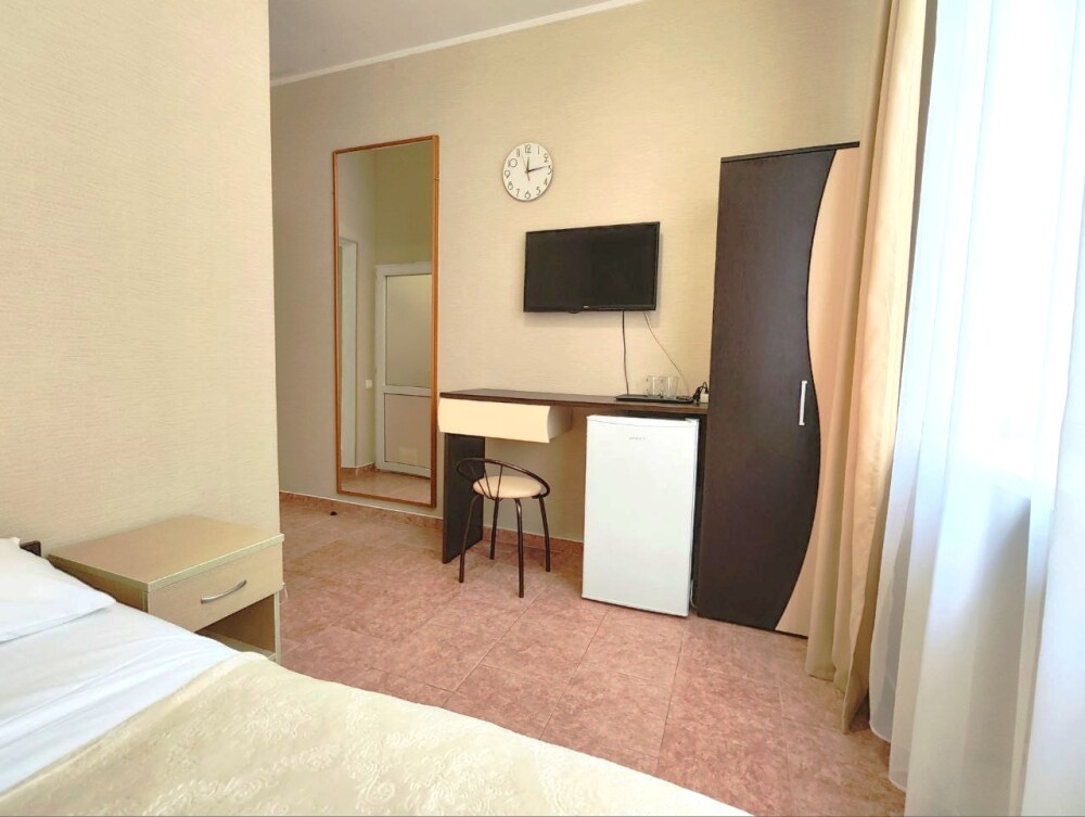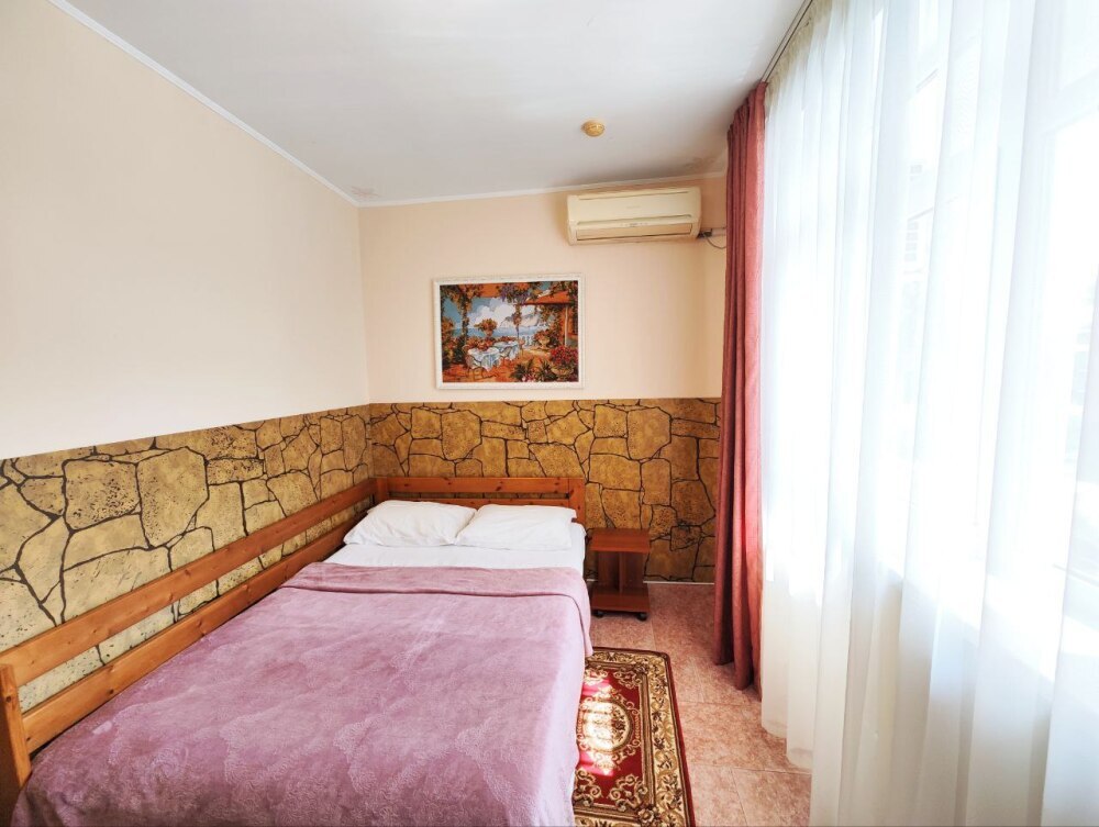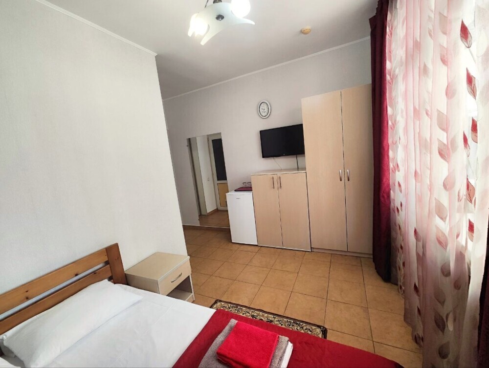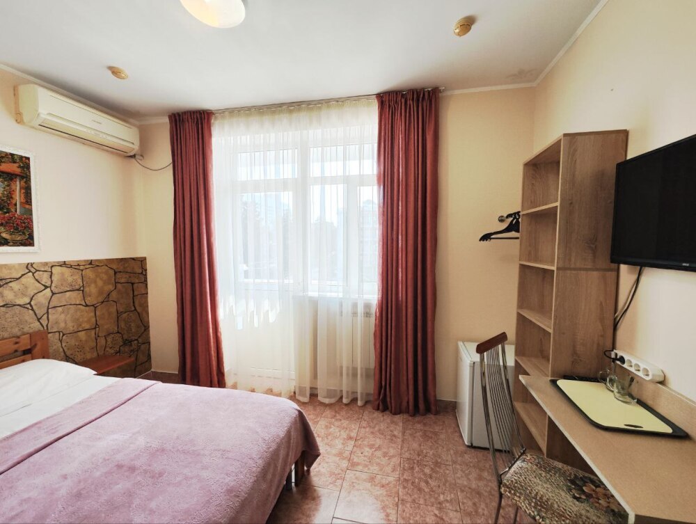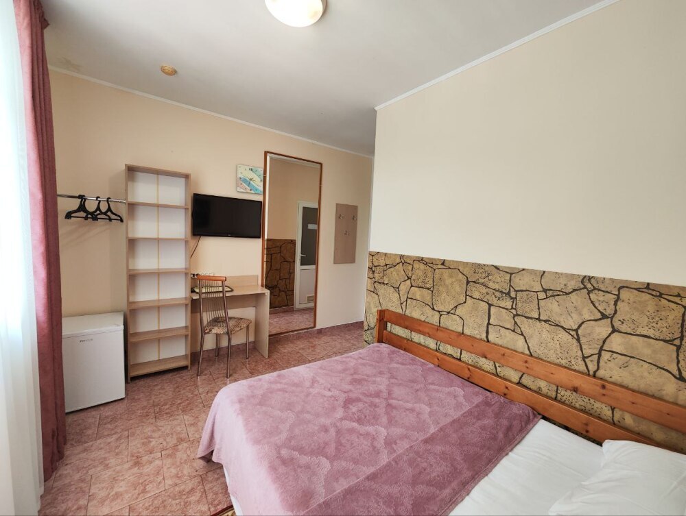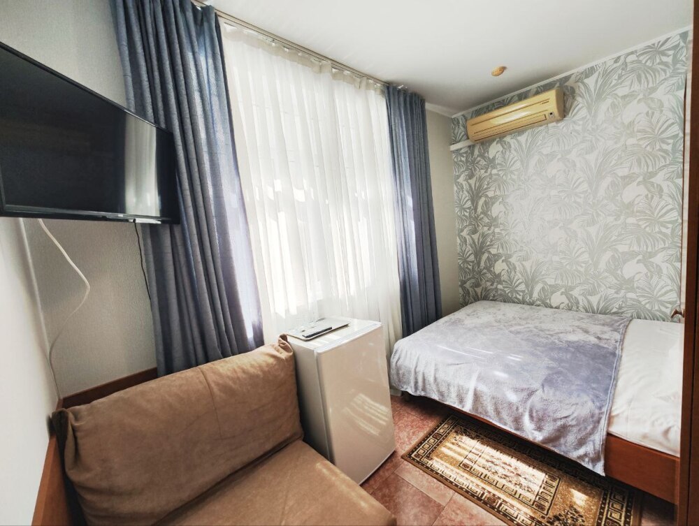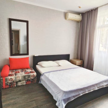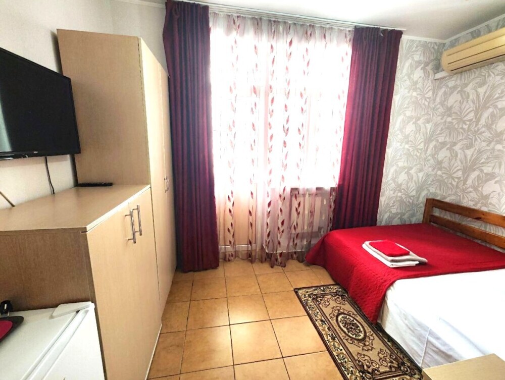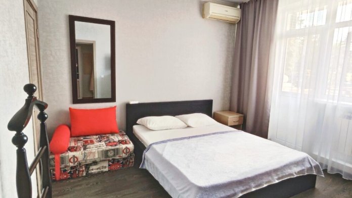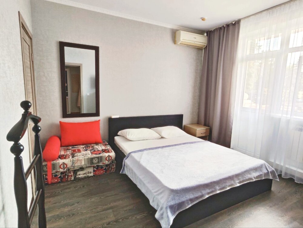 Двуспальная кровать 1.60, кресло-кровать, телевизор, холодильник, кондиционер, индивидуальный санузел.