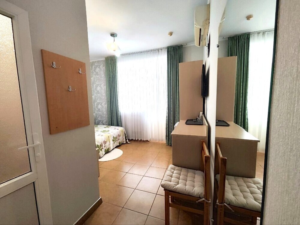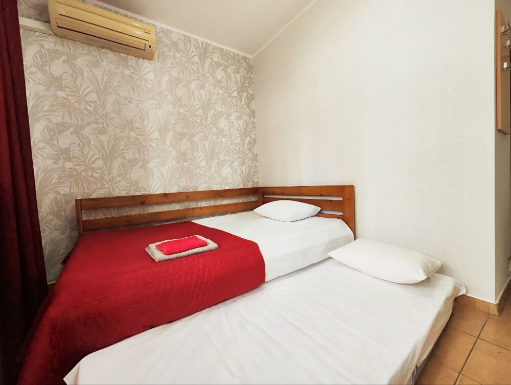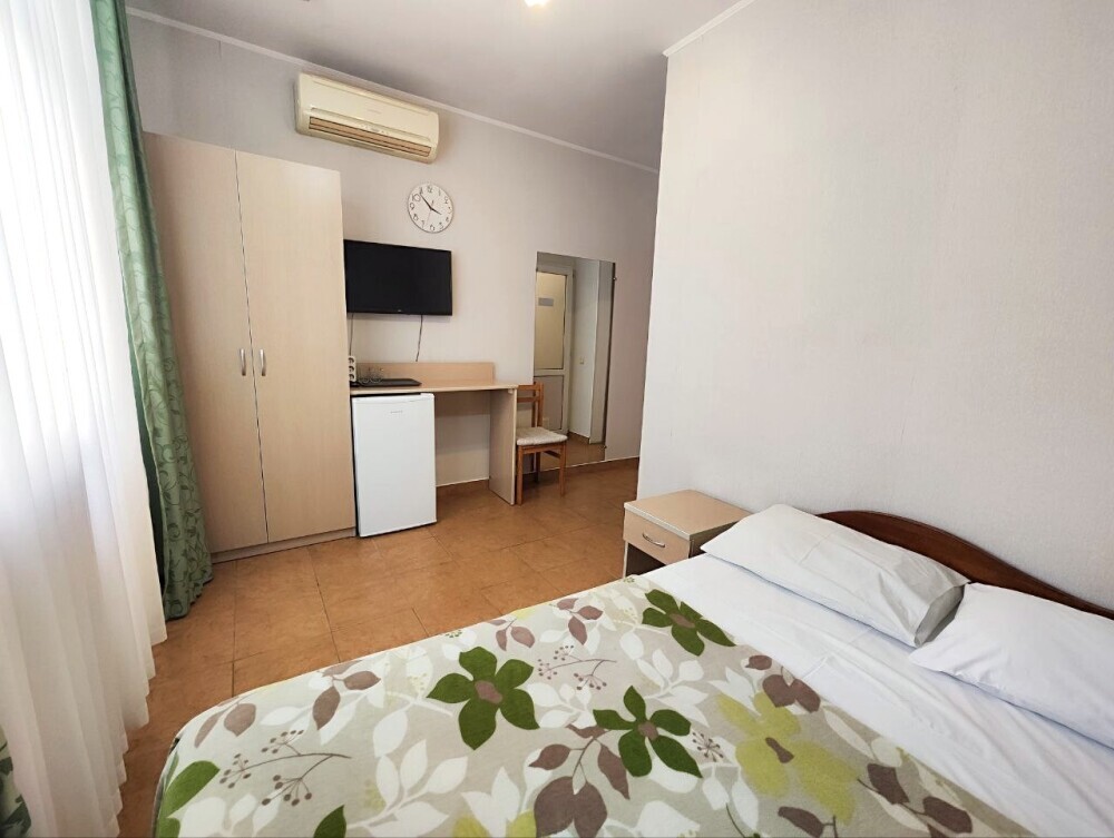 Двуспальная кровать 1.40, выдвижное дополнительное спальное место 0.80, телевизор, холодильник, кондиционер, индивидуальный санузел.