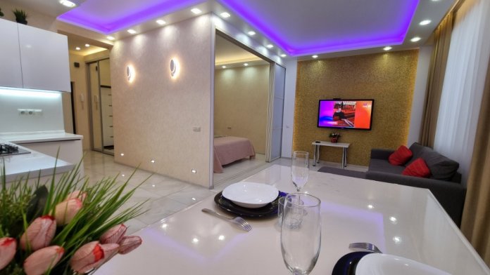 Квартира с дизайнерским евроремонтом, мебелью и всей необходимой бытовой техникой. Двухуровневые потолки с подсветкой, встроенная кухня, со всем необходимым для приготовления пищи, вся мебель новая. Спальные места: большая двуспальная кровать и раскладной двуспальный диван.