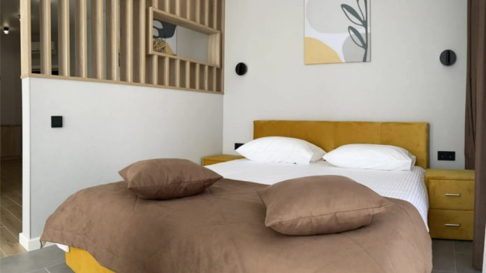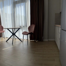 В номере: ванная комната (душ, туалет, раковина, стиральная машинка, фен, халаты, тапочки), телевизор, кондиционер, двуспальная кровать, тумбы, шкаф-купе, двуспальный раскладной диван, кухня (холодильник, посудомоечная машина, микроволновая печь, чайник, посуда, плита).