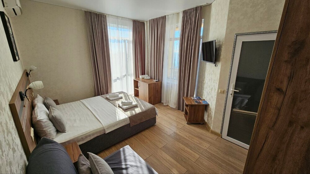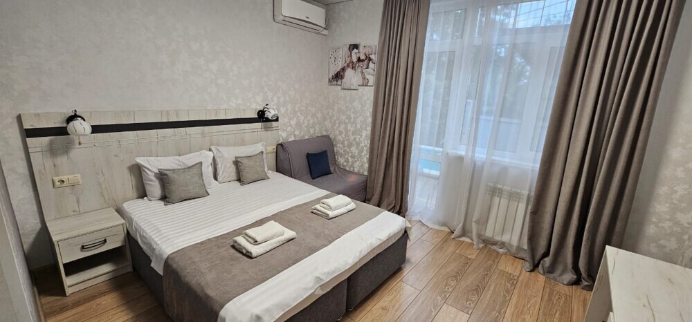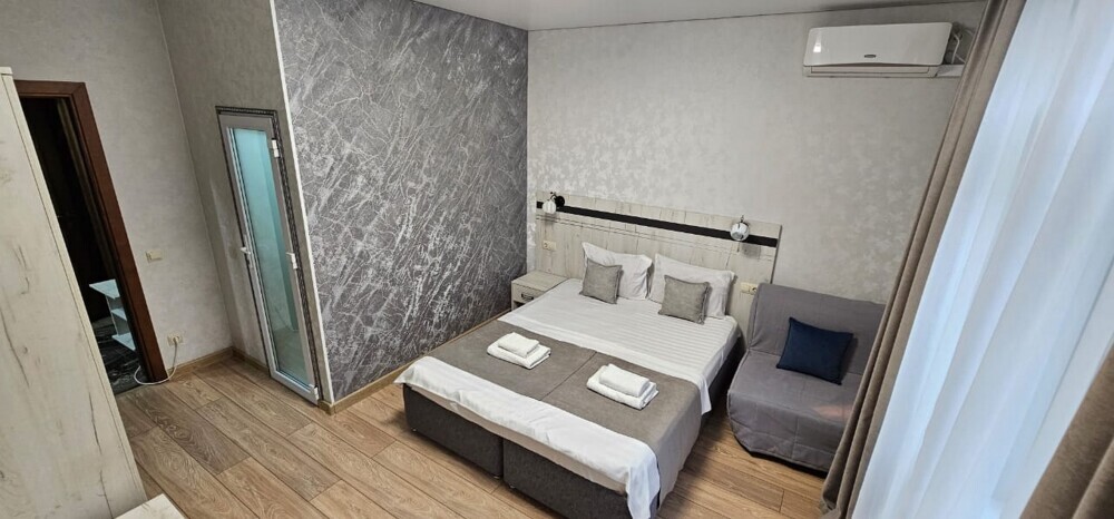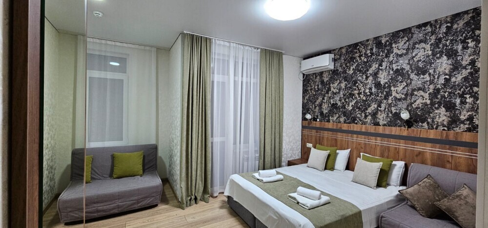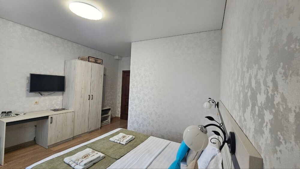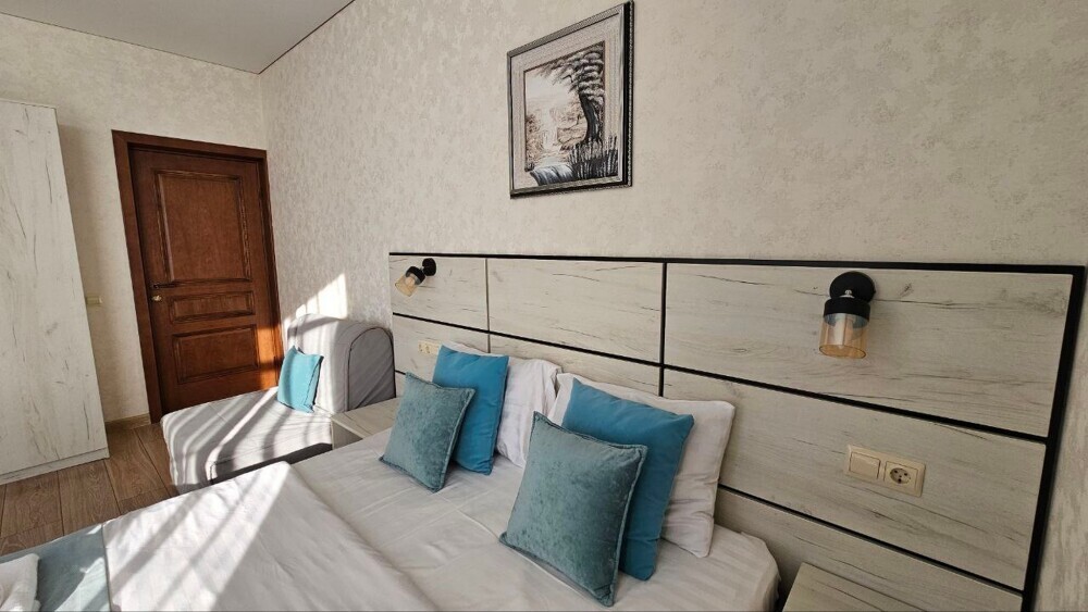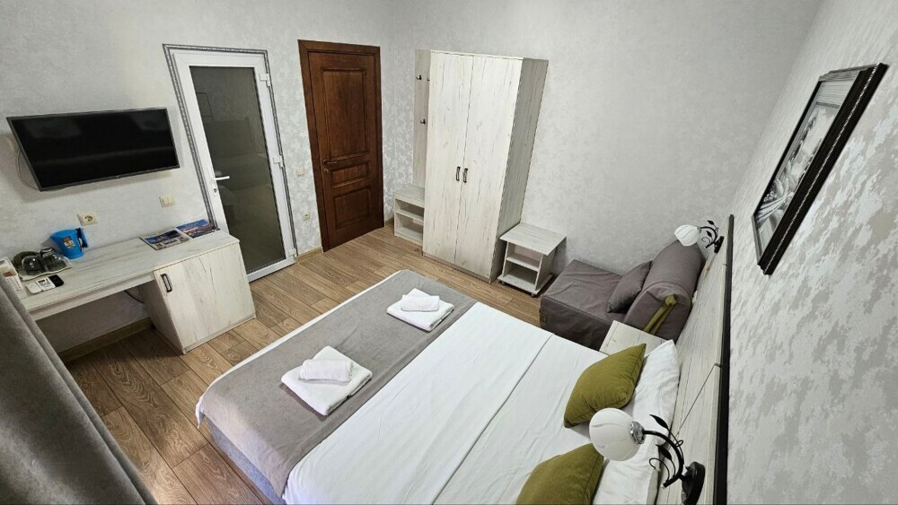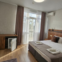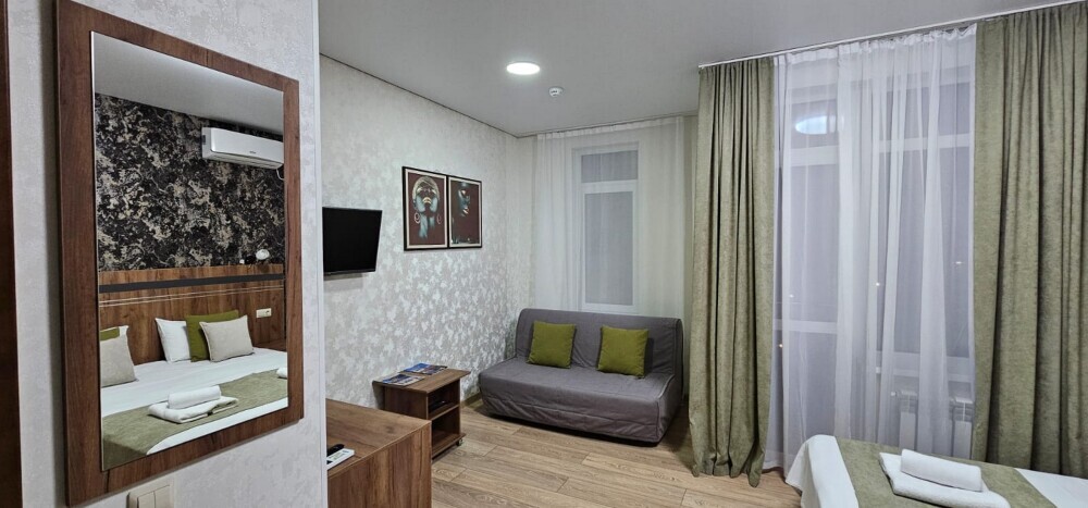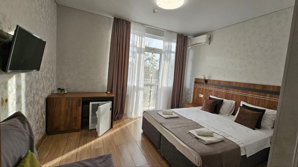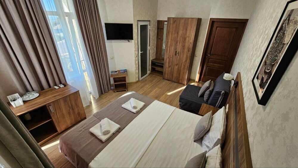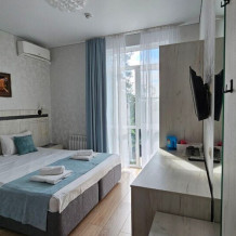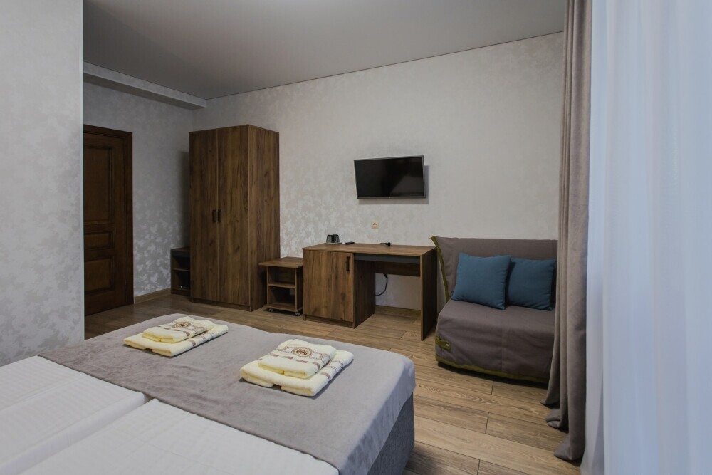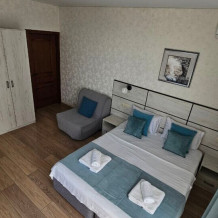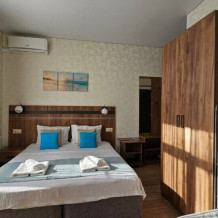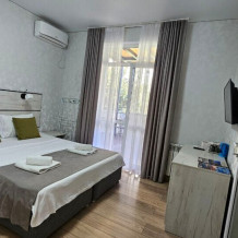 В номере: 1 двуспальная кровать или 2 односпальные кровати, 1 двуспальный диван, 1 кресло - кровать. Имеется телевизор, кондиционер, шкаф, вешалка, зеркало, журнальный столик, холодильник, стулья, корзина для мусора. Индивидуальная ванная комната: душ, раковина, туалет. В стоимость входит: Постельное бельё, полотенца, мыло.