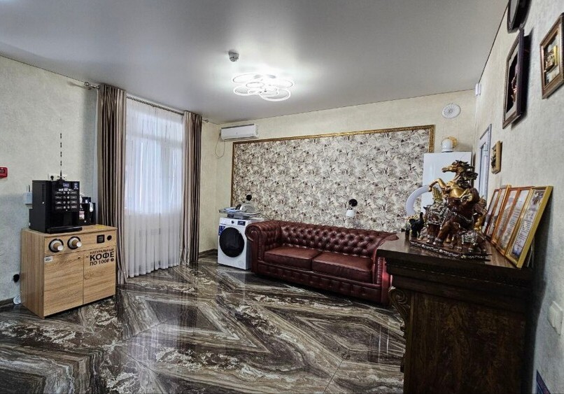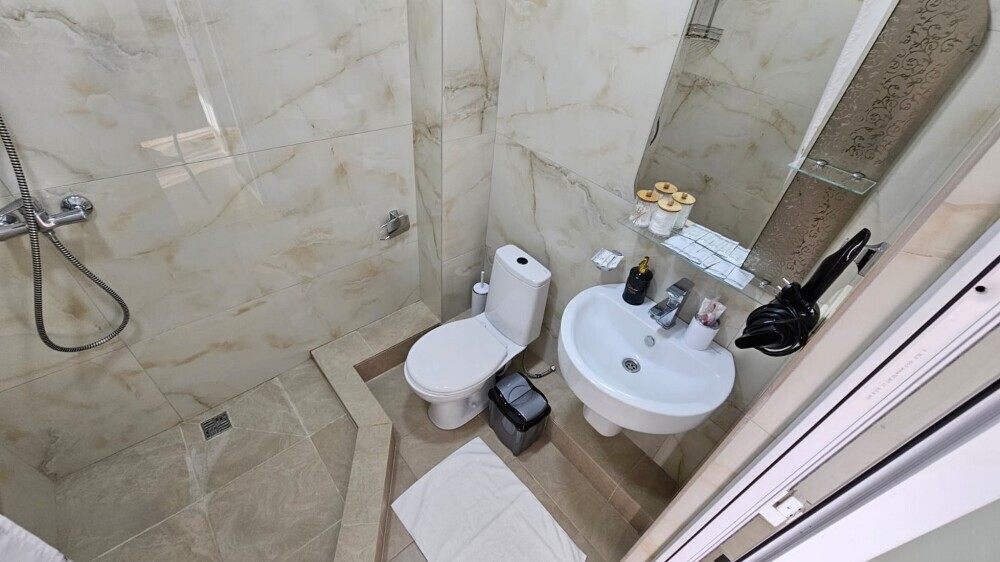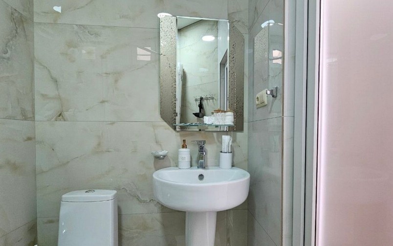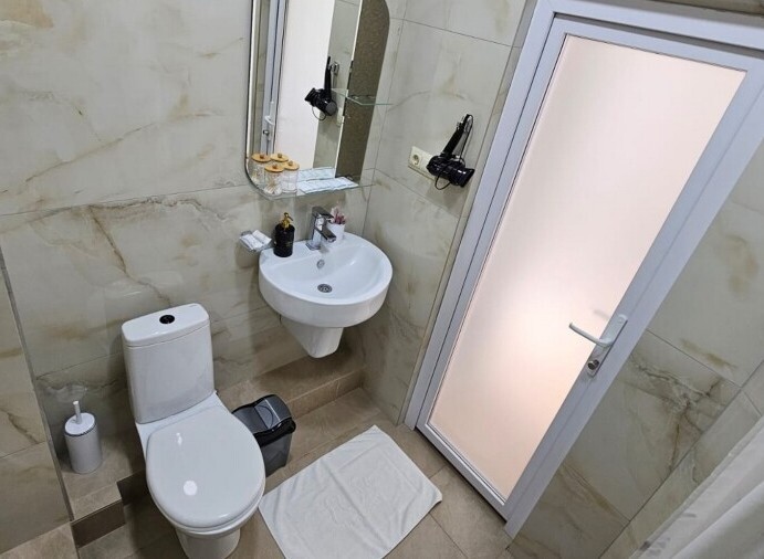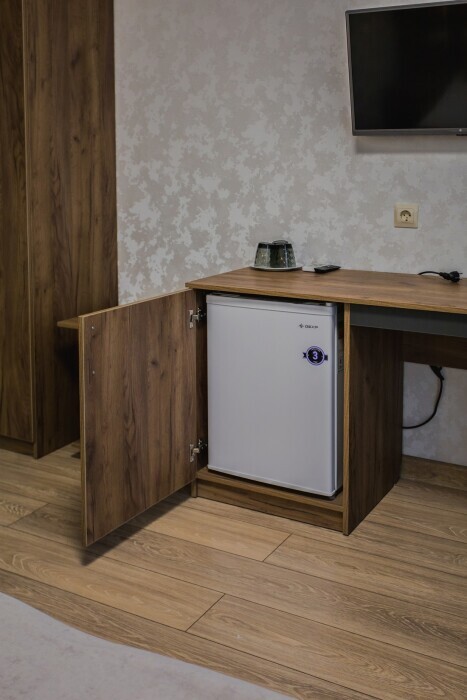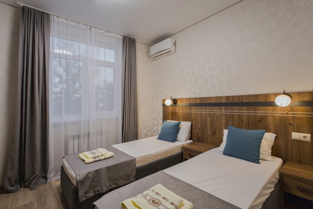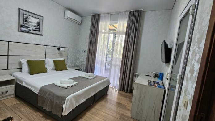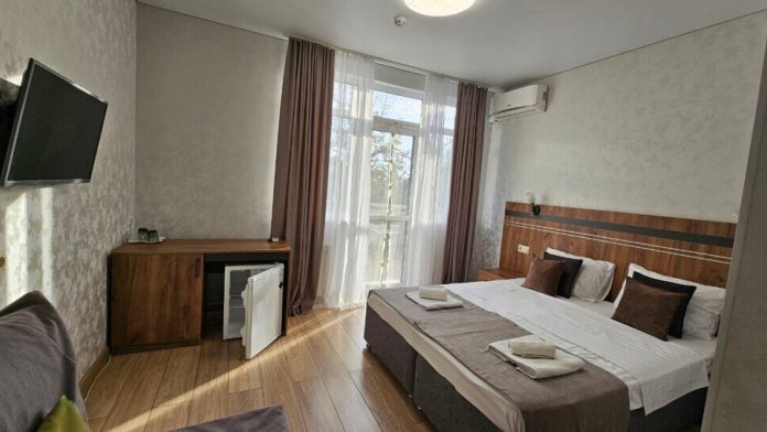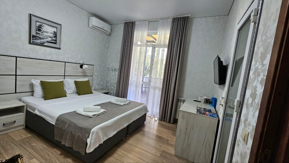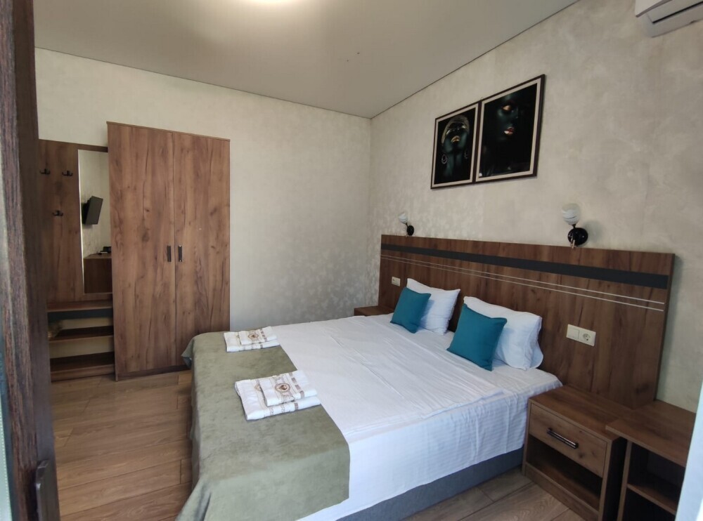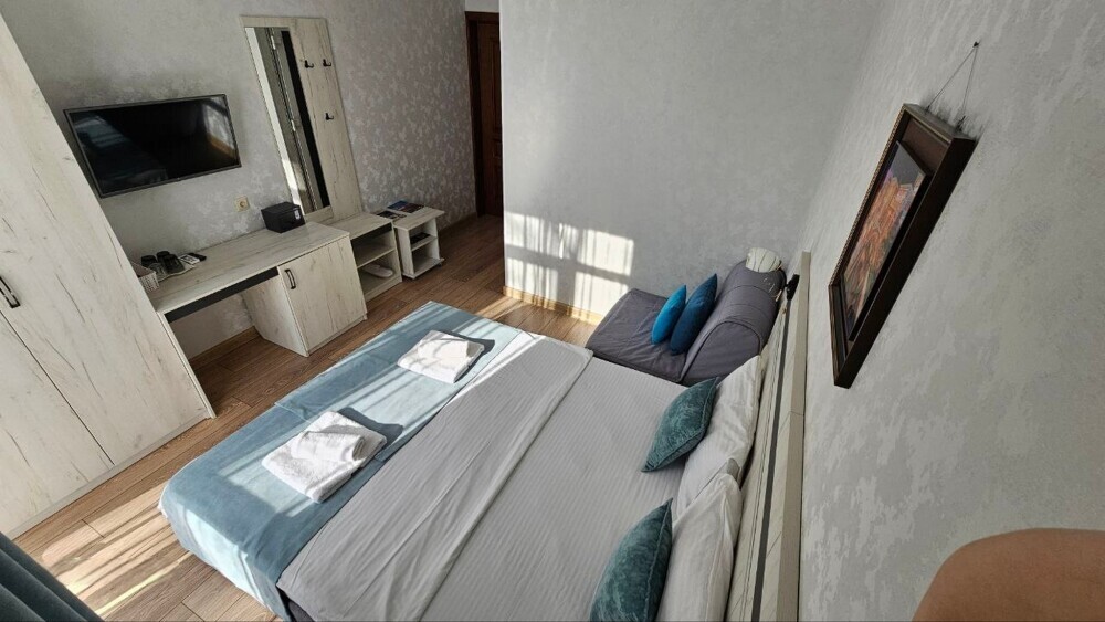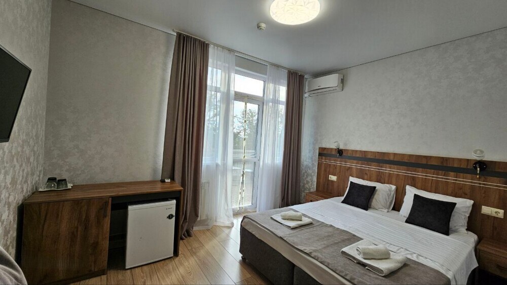 В номере: 1 двуспальная кровать или 2 односпальные кровати, 1 двуспальный диван, 1 кресло - кровать. Имеется телевизор, кондиционер, шкаф, вешалка, зеркало, журнальный столик, холодильник, стулья, корзина для мусора. Индивидуальная ванная комната: душ, раковина, туалет. В стоимость входит: Постельное бельё, полотенца, мыло.
