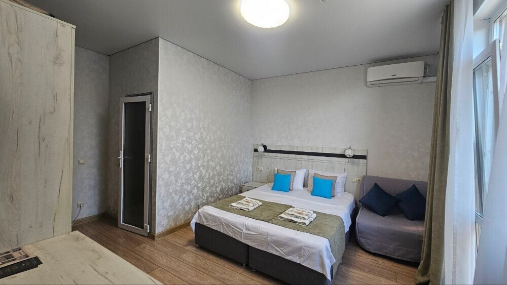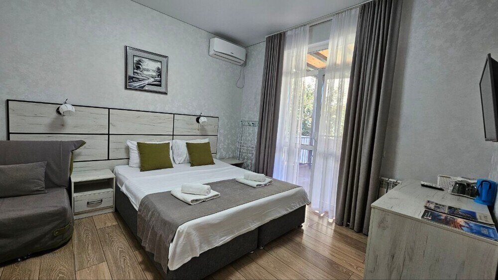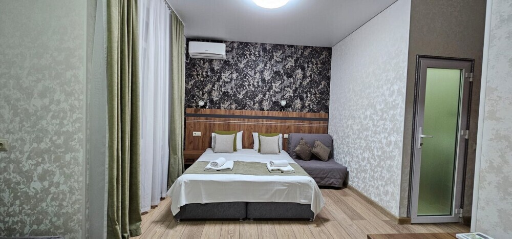 В номере: 1 двуспальная кровать, 1 диван односпальный, 1 еврораскладушка.